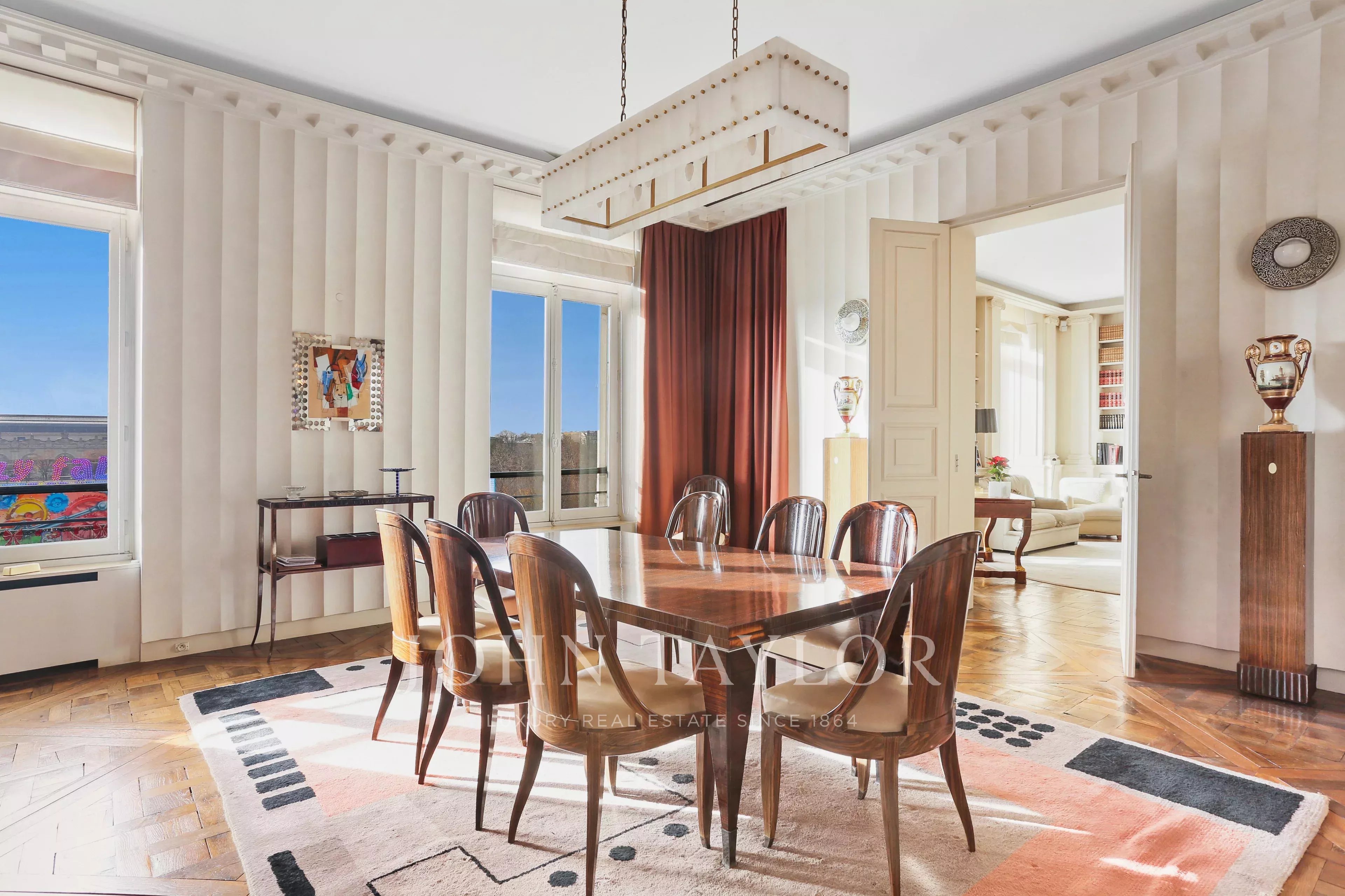 - Exceptional suite of 3 rooms (two large living rooms and dining room) overlooking the Tuileries Garden. These rooms offer over 120 m² of space with 7 south-facing windows with no opposite buildings, opening onto unique views: the Eiffel Tower, the Grand Palais, the Louvre Museum, the Orsay Museum, and the Obelisk at the Place de la Concorde