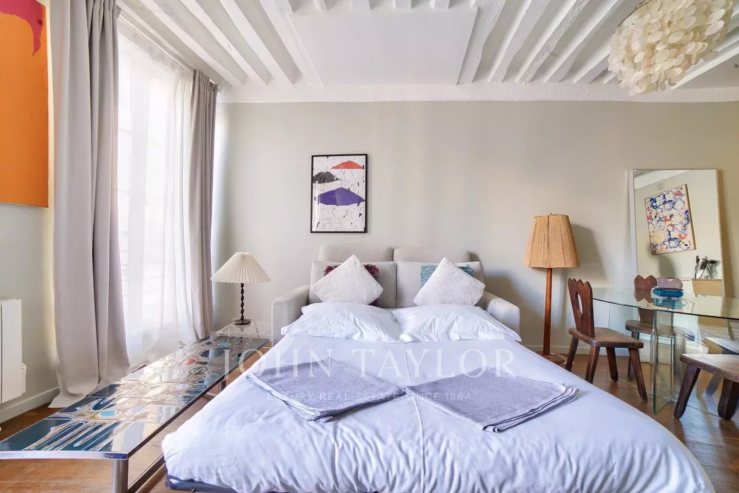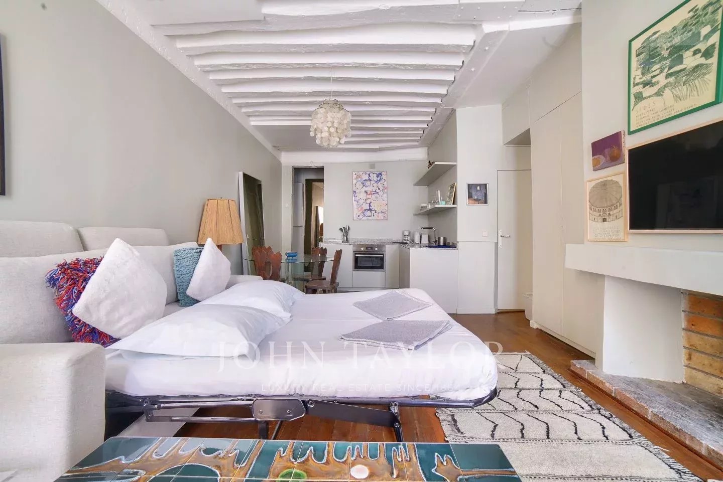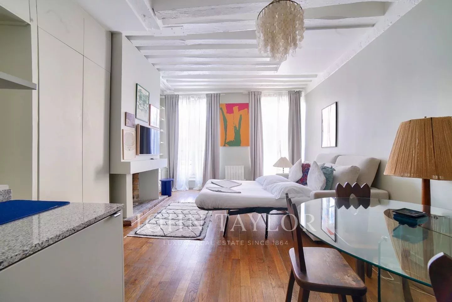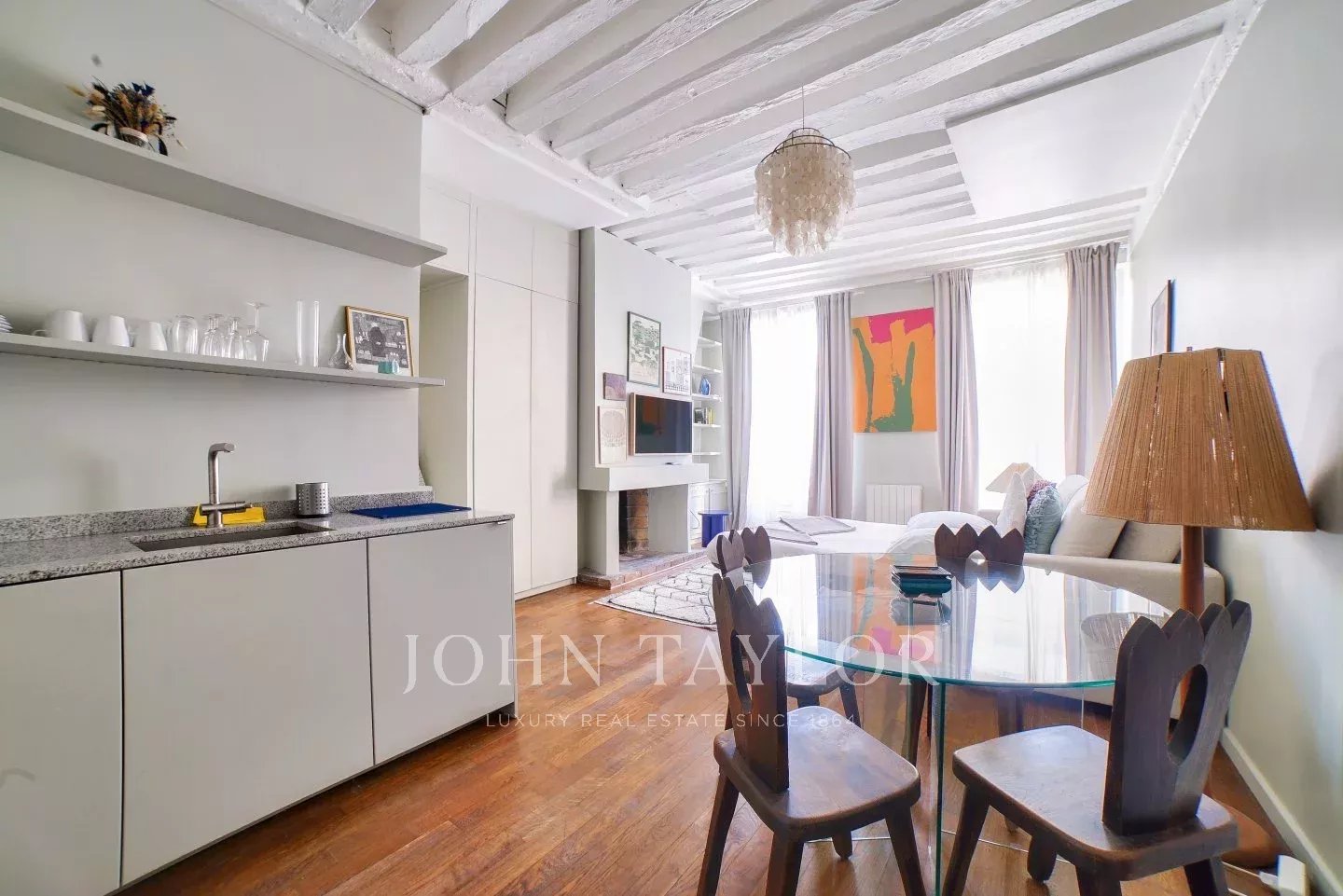 Its stylish renovation allies modern comfort and Marais traditional architectural details such as high ceiling with beams, tall windows, period open fireplace to make it the perfect pied-à-terre or investment property.