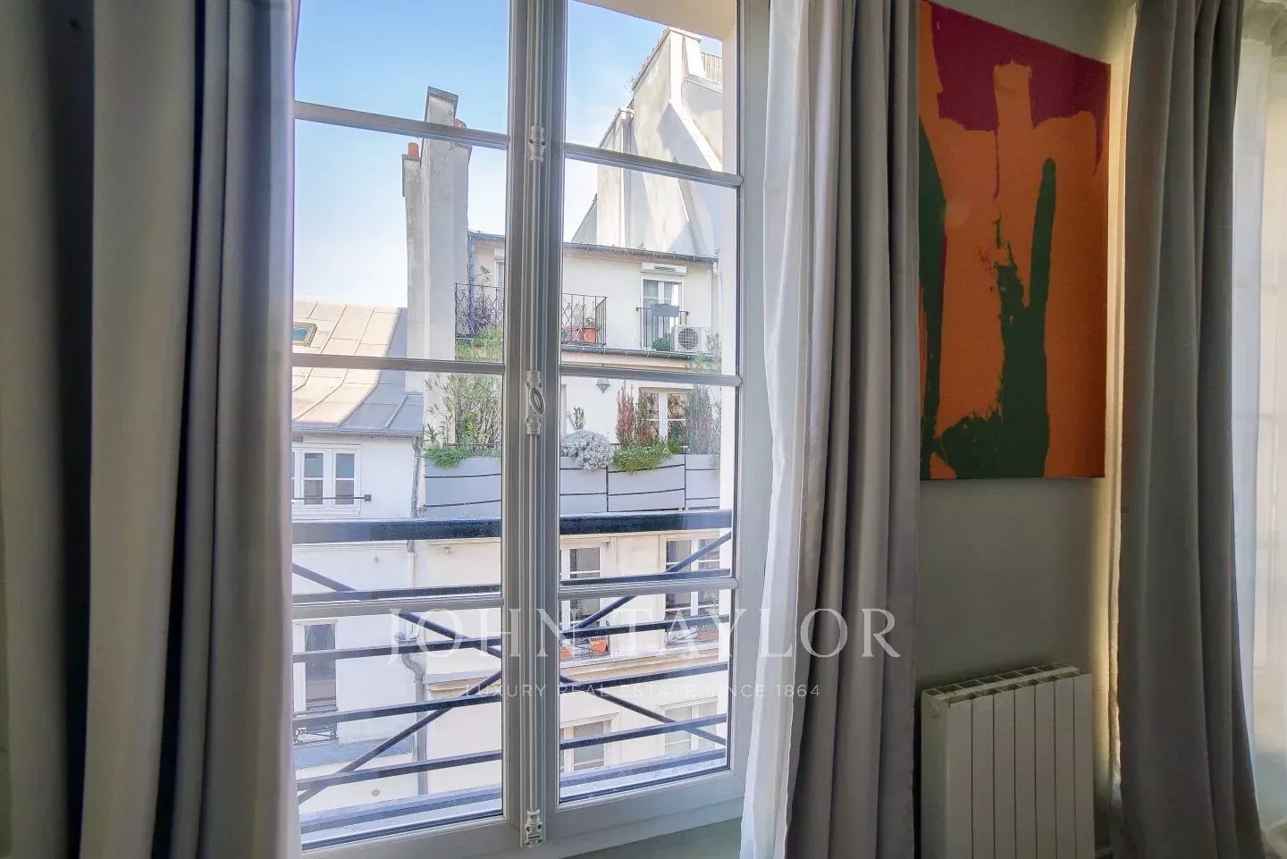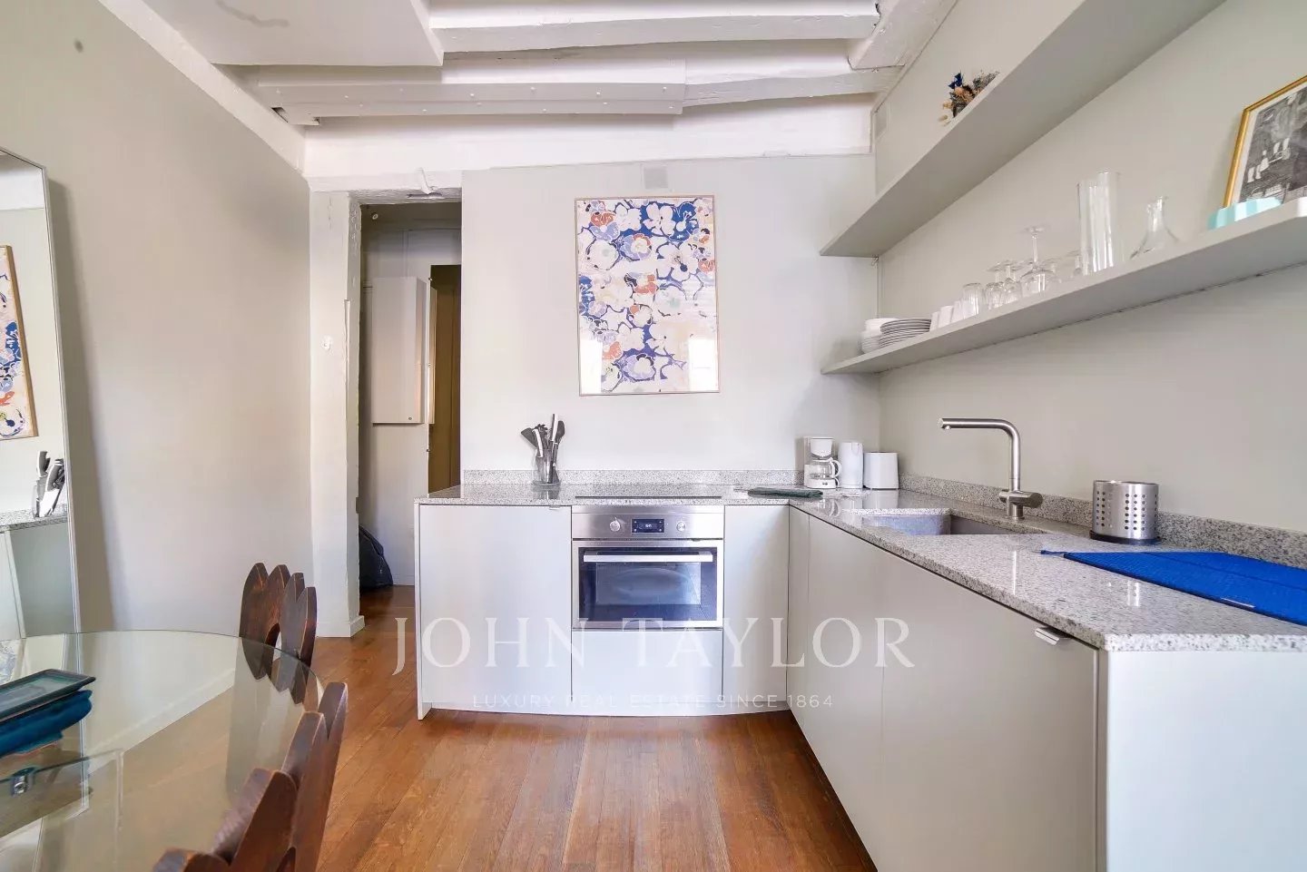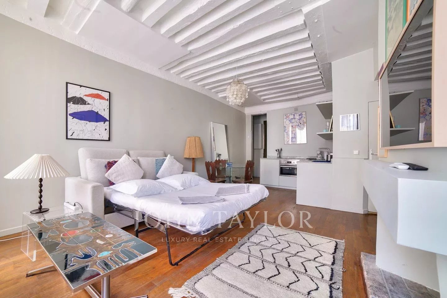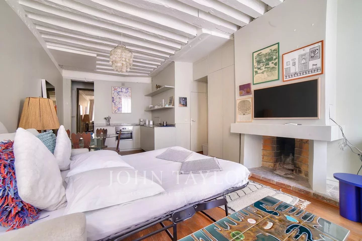 Its stylish renovation allies modern comfort and Marais traditional architectural details such as high ceiling with beams, tall windows, period open fireplace to make it the perfect pied-à-terre or investment property.