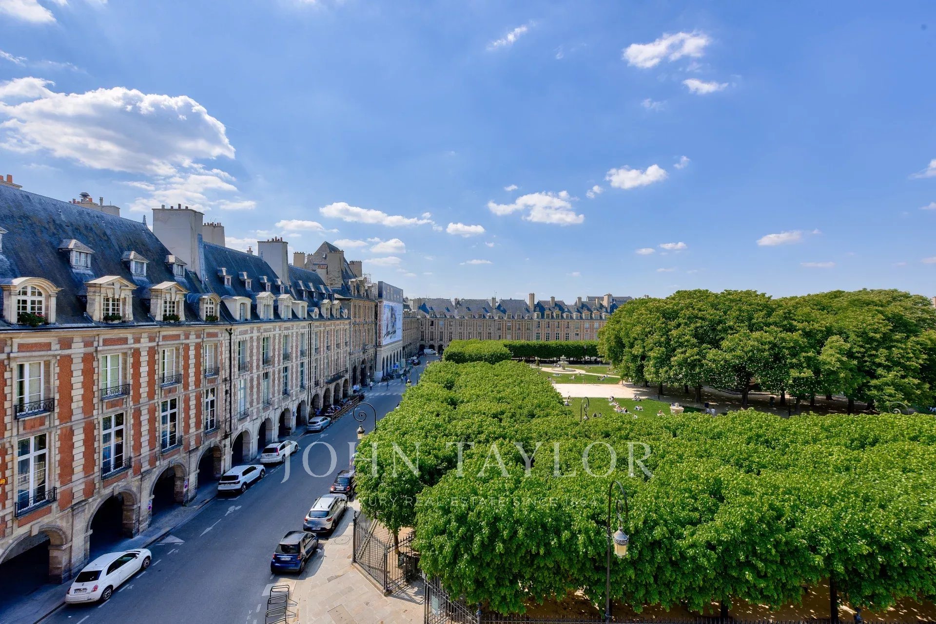 A rare offering with unobstructed views over the gardens of Place des Vosges, just steps from Victor Hugo’s house, in the heart of the historic Marais and near Rue de Turenne.