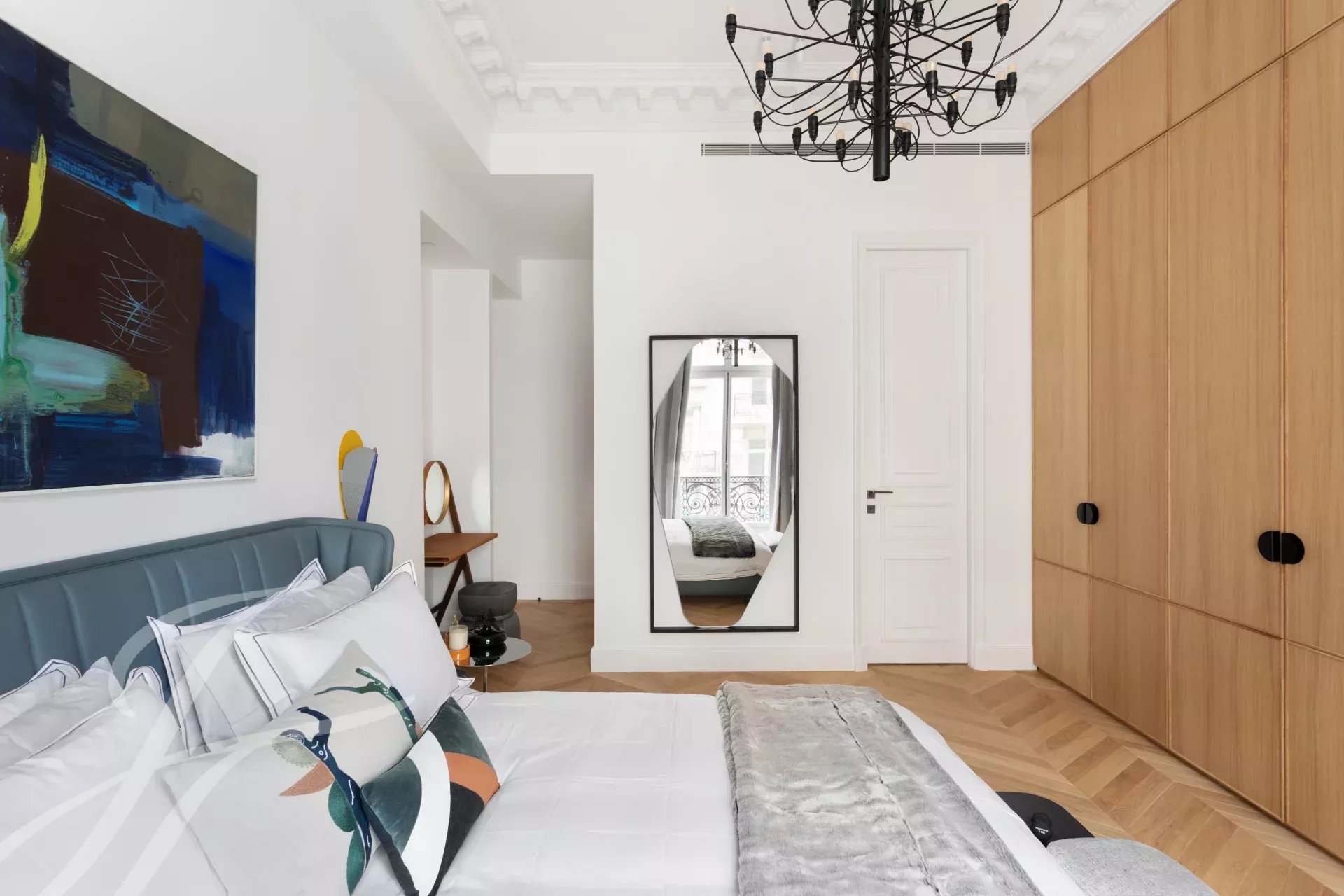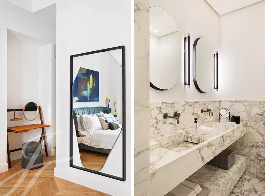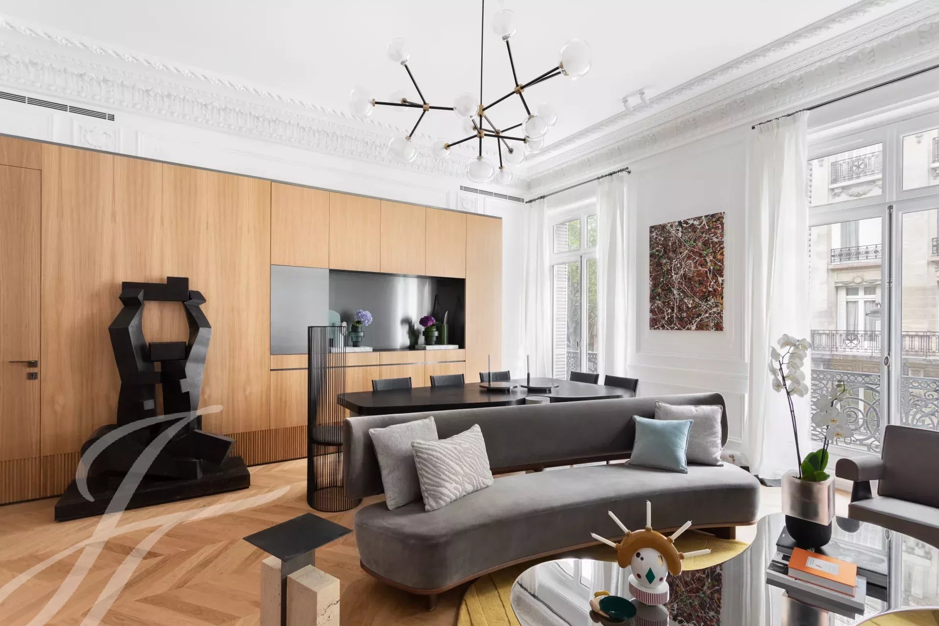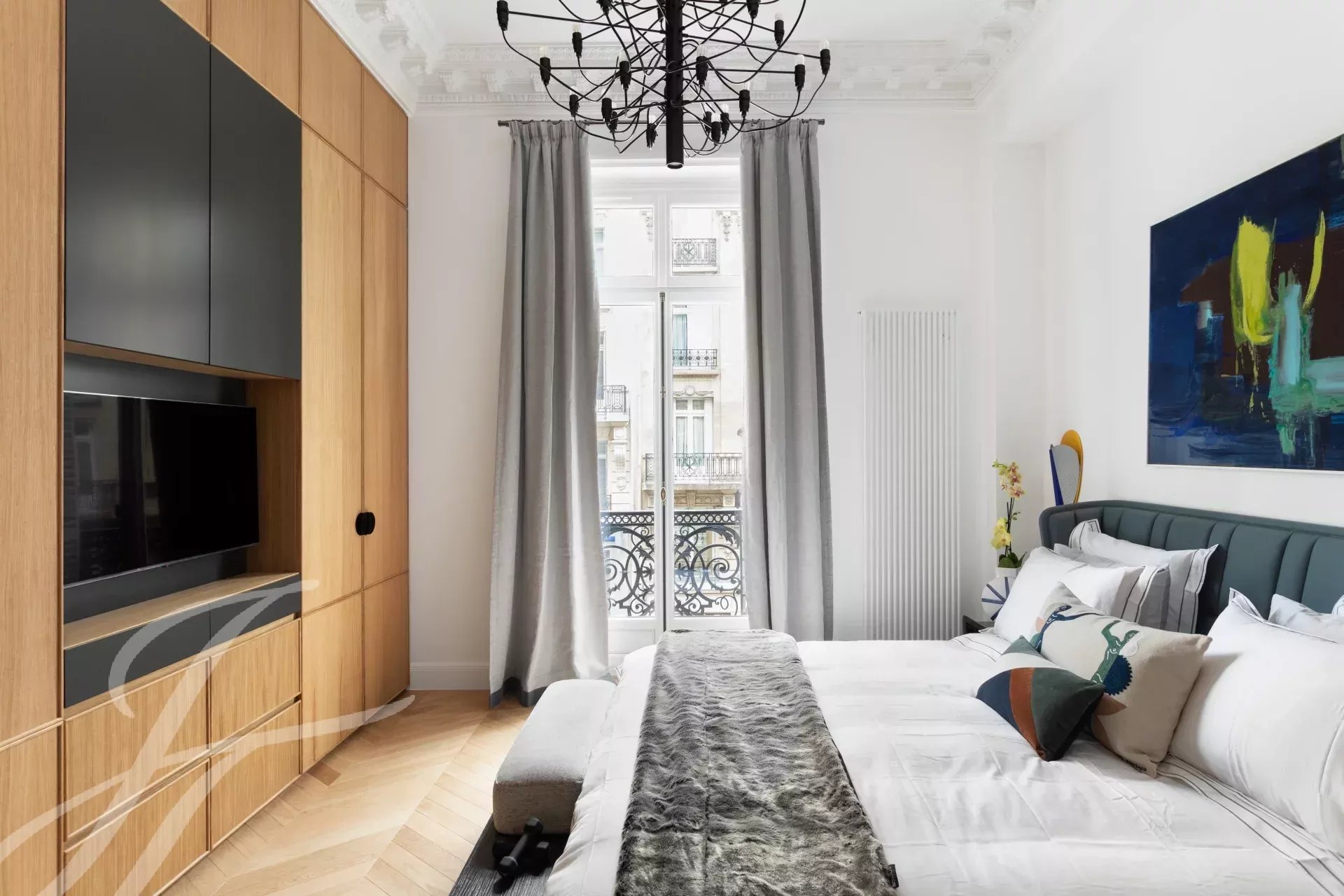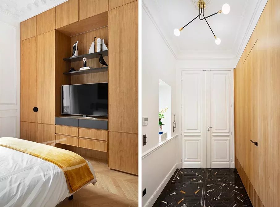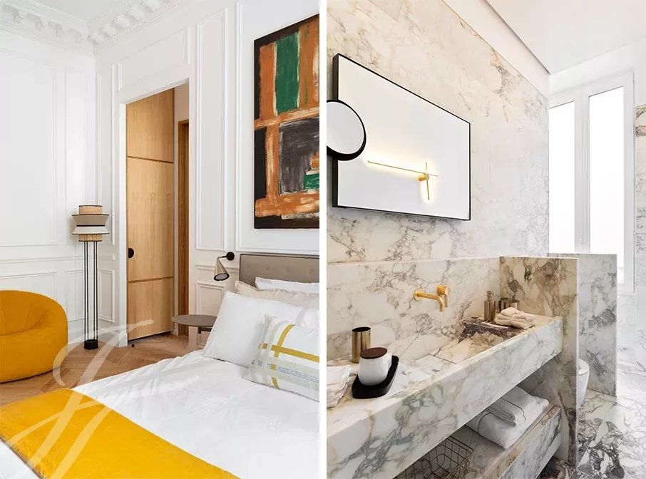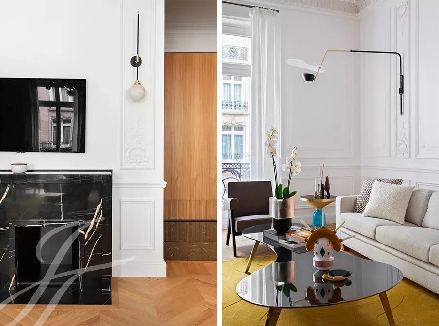 Close to the Four Seasons and Bulgari hotels, between Avenue Marceau and Avenue George V, two bedroom apartment entirely renovated by an architect on the 2nd floor of a period building with beautiful common areas.