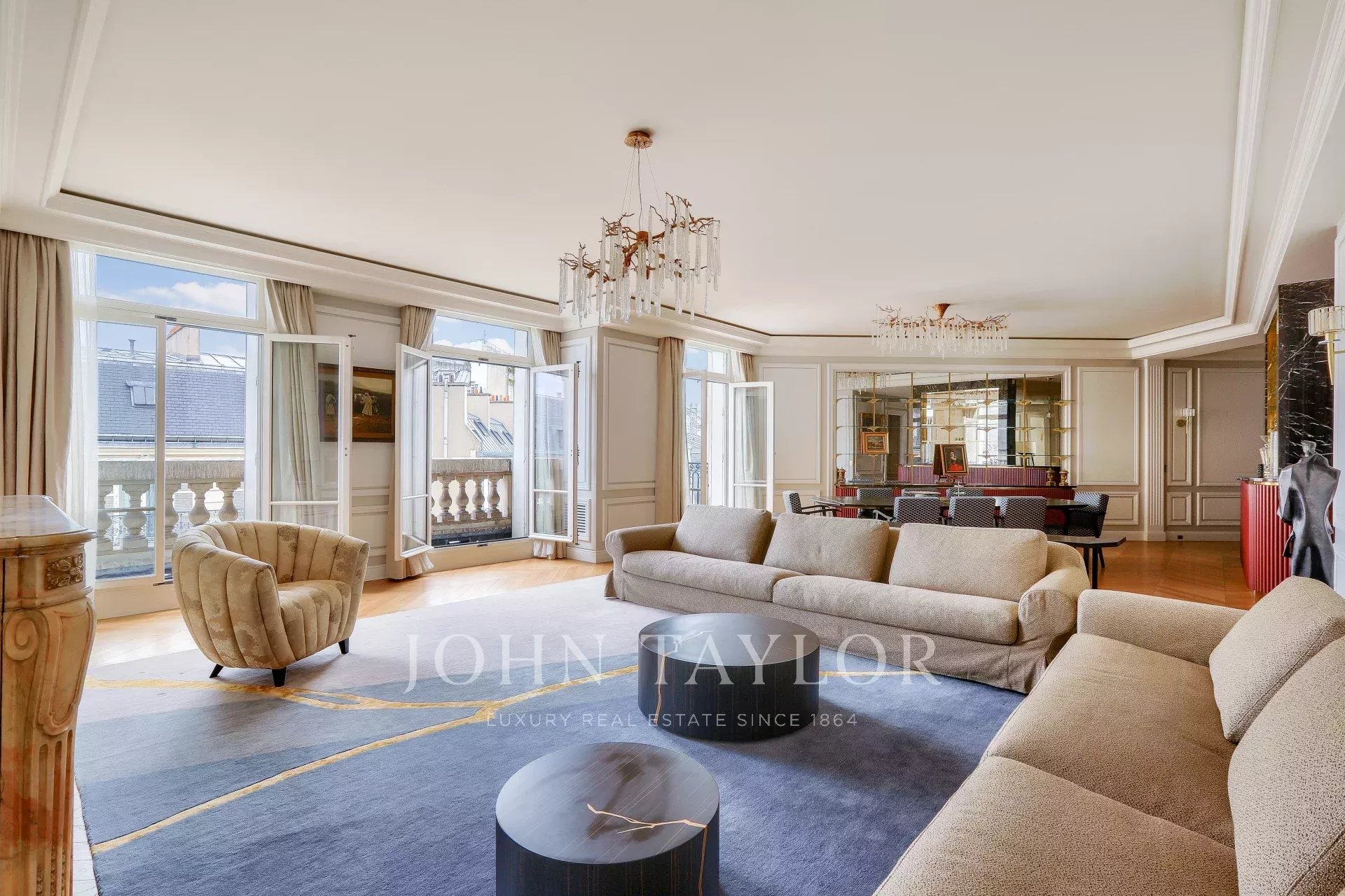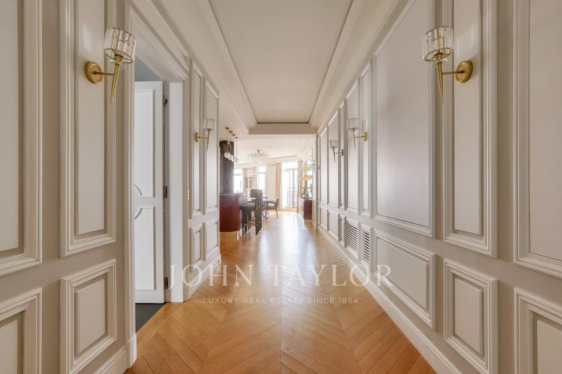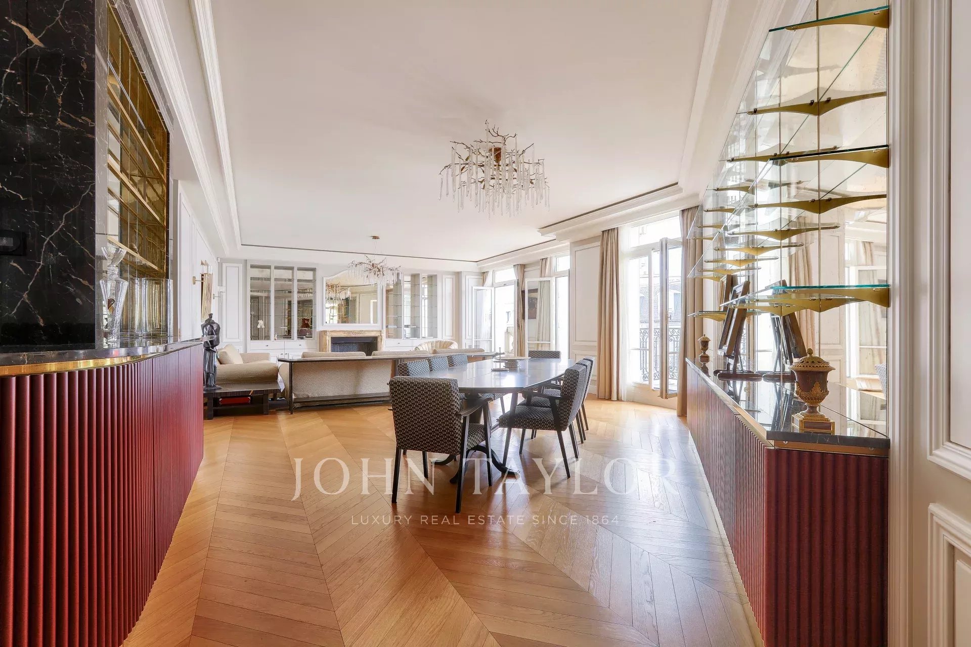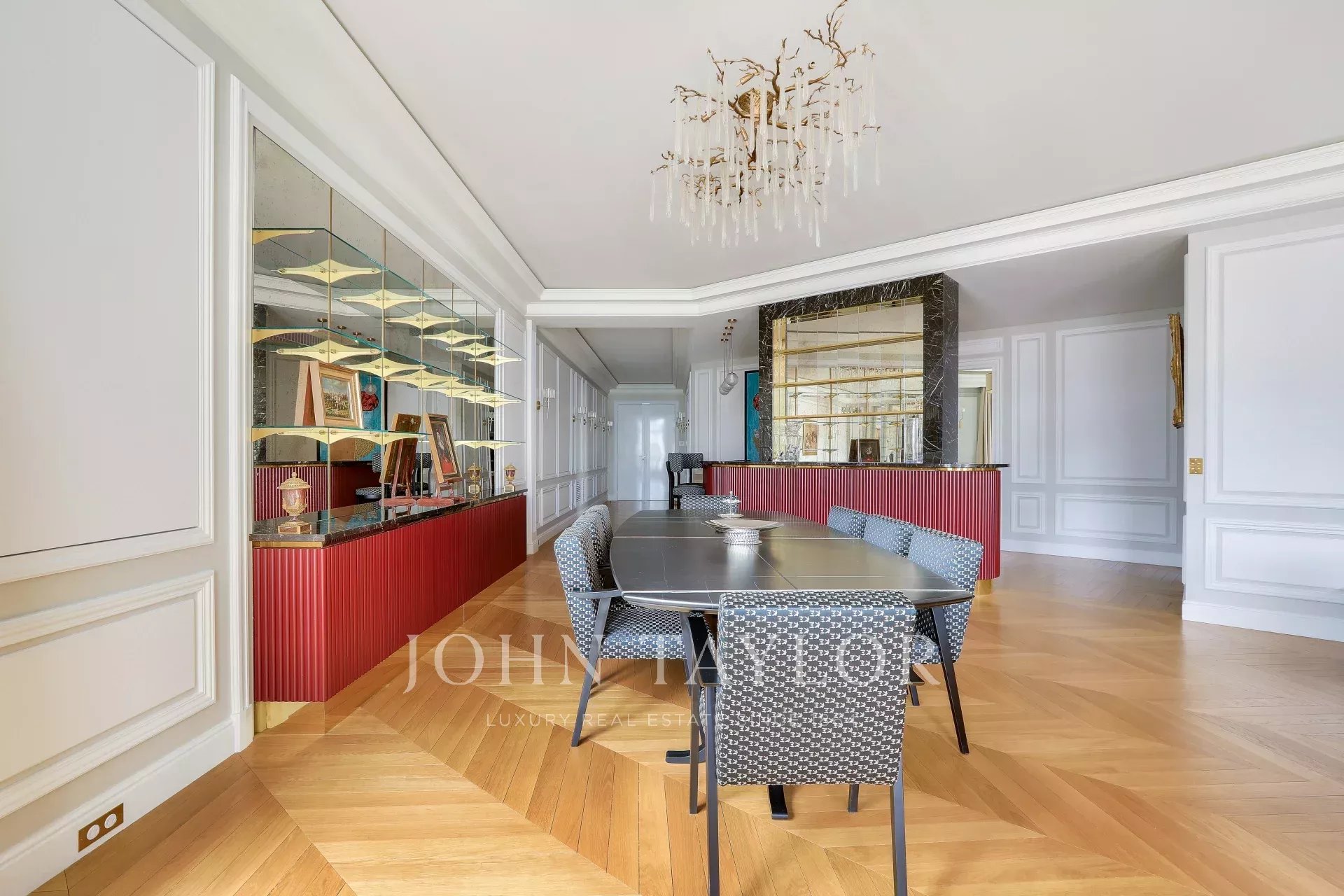 On the fifth floor of an very elegant 19th century building, a superb 278 m² reception apartment, luxuriously renovated and opening onto balconies with unobstructed views of Place François 1er, the Seine and numerous Paris monuments.