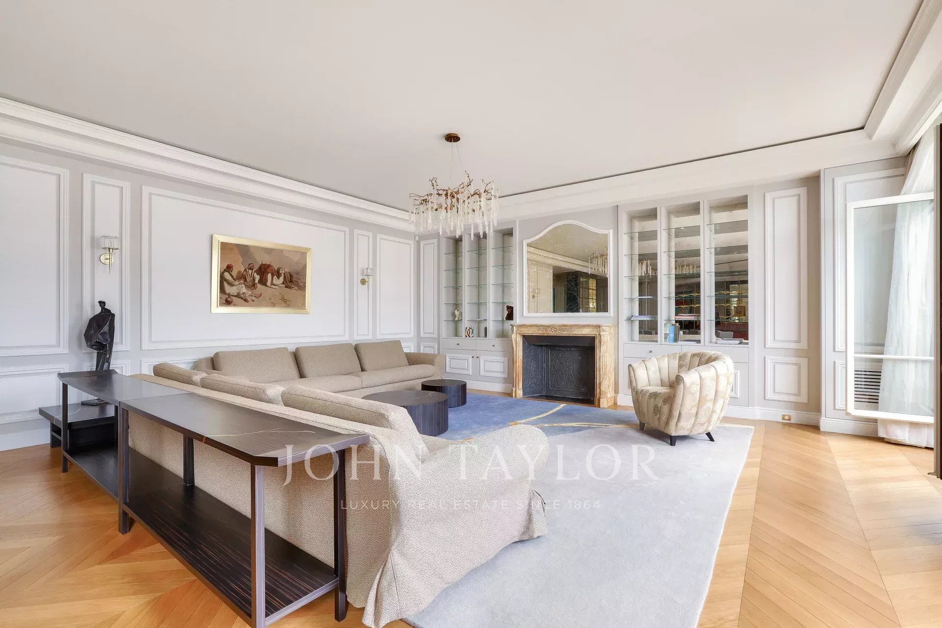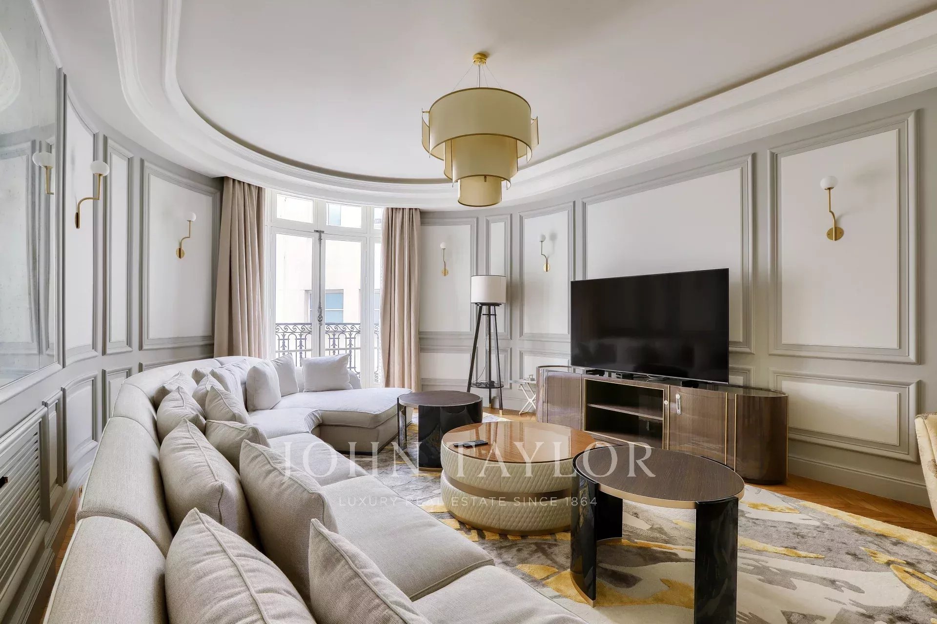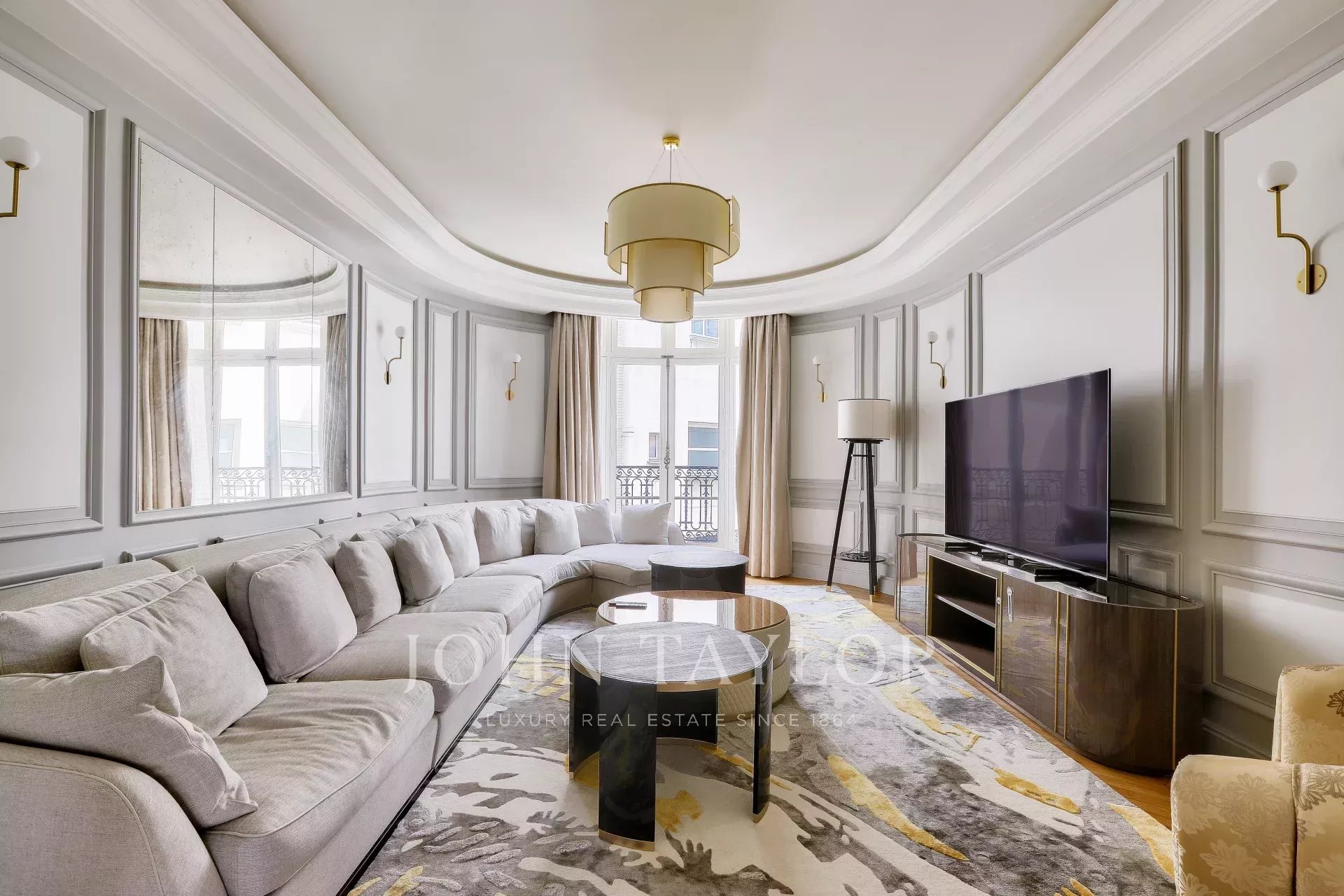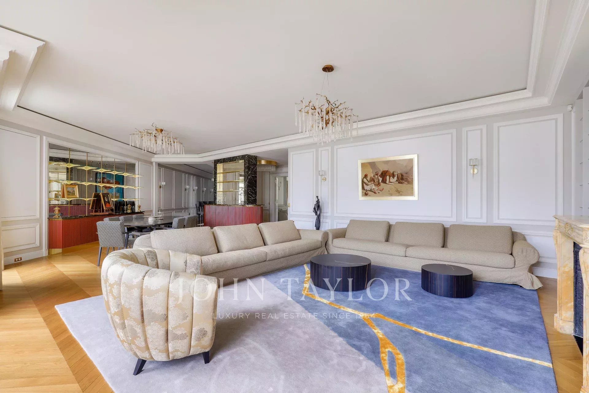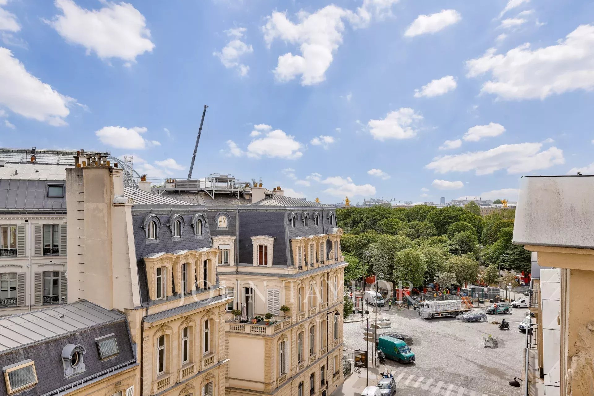 On the fifth floor of an very elegant 19th century building, a superb 278 m² reception apartment, luxuriously renovated and opening onto balconies with unobstructed views of Place François 1er, the Seine and numerous Paris monuments.