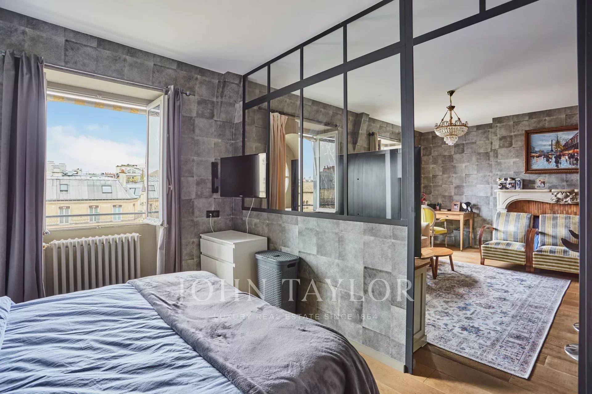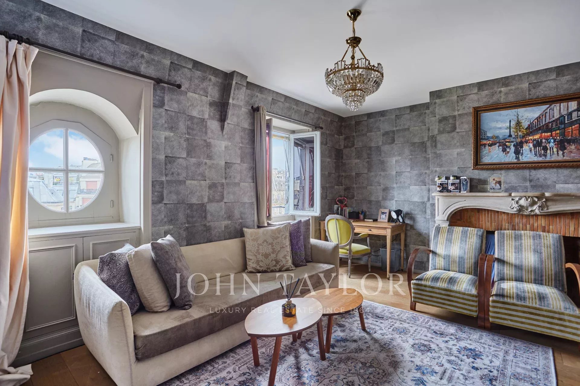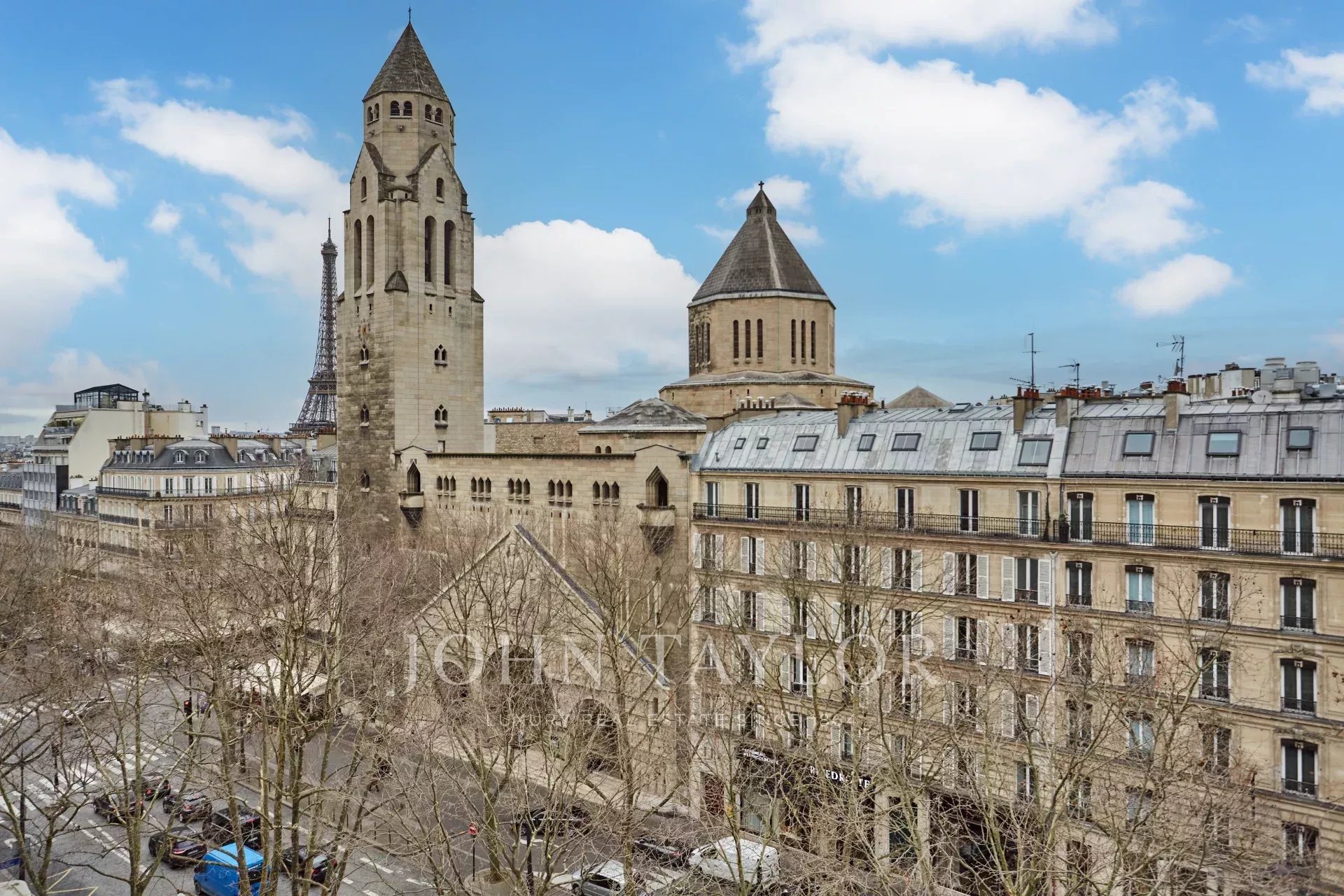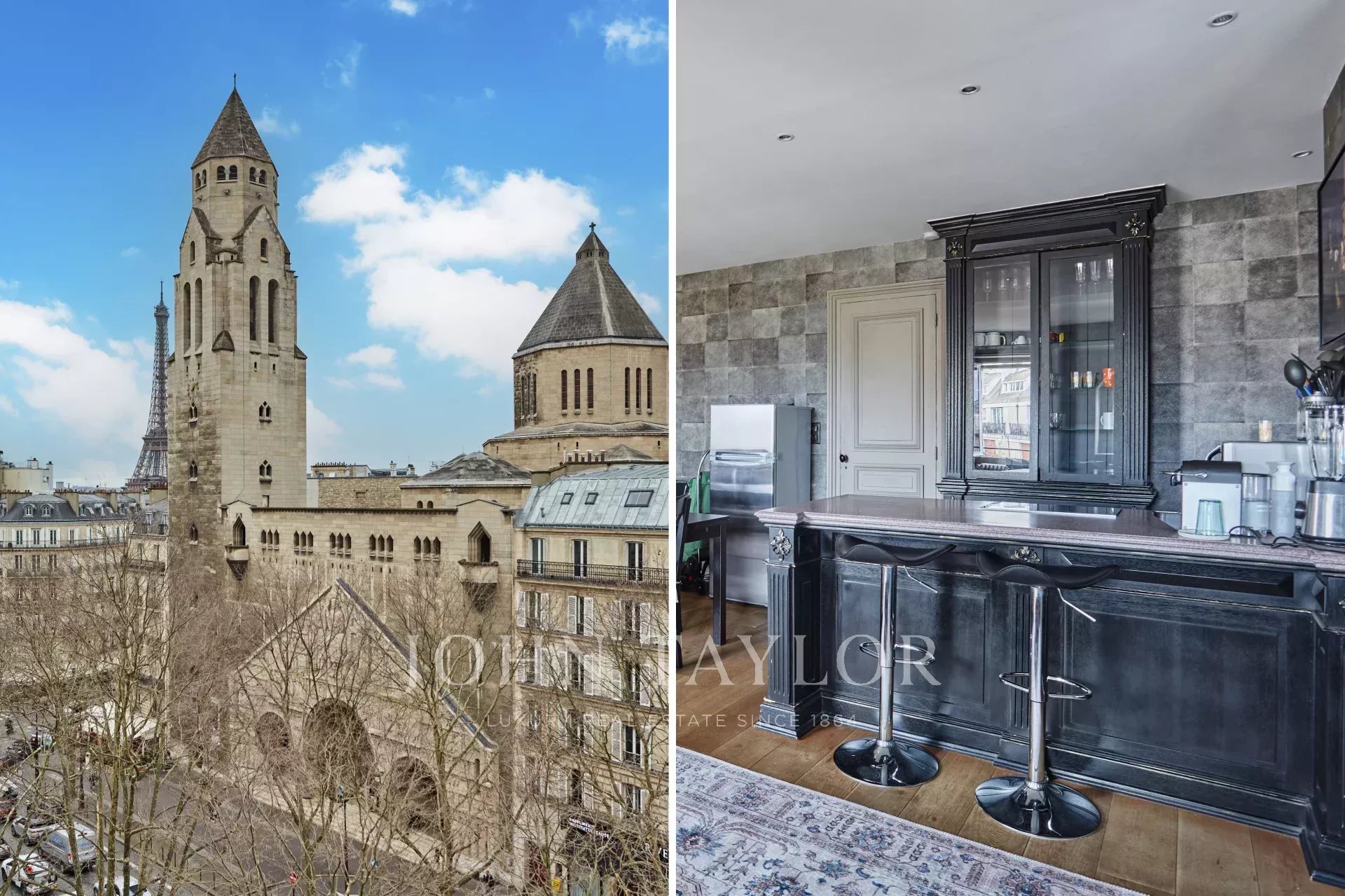 - A stylish living room, boasting two windows with breathtaking views of the Eiffel Tower and Saint-Pierre de Chaillot Church.
