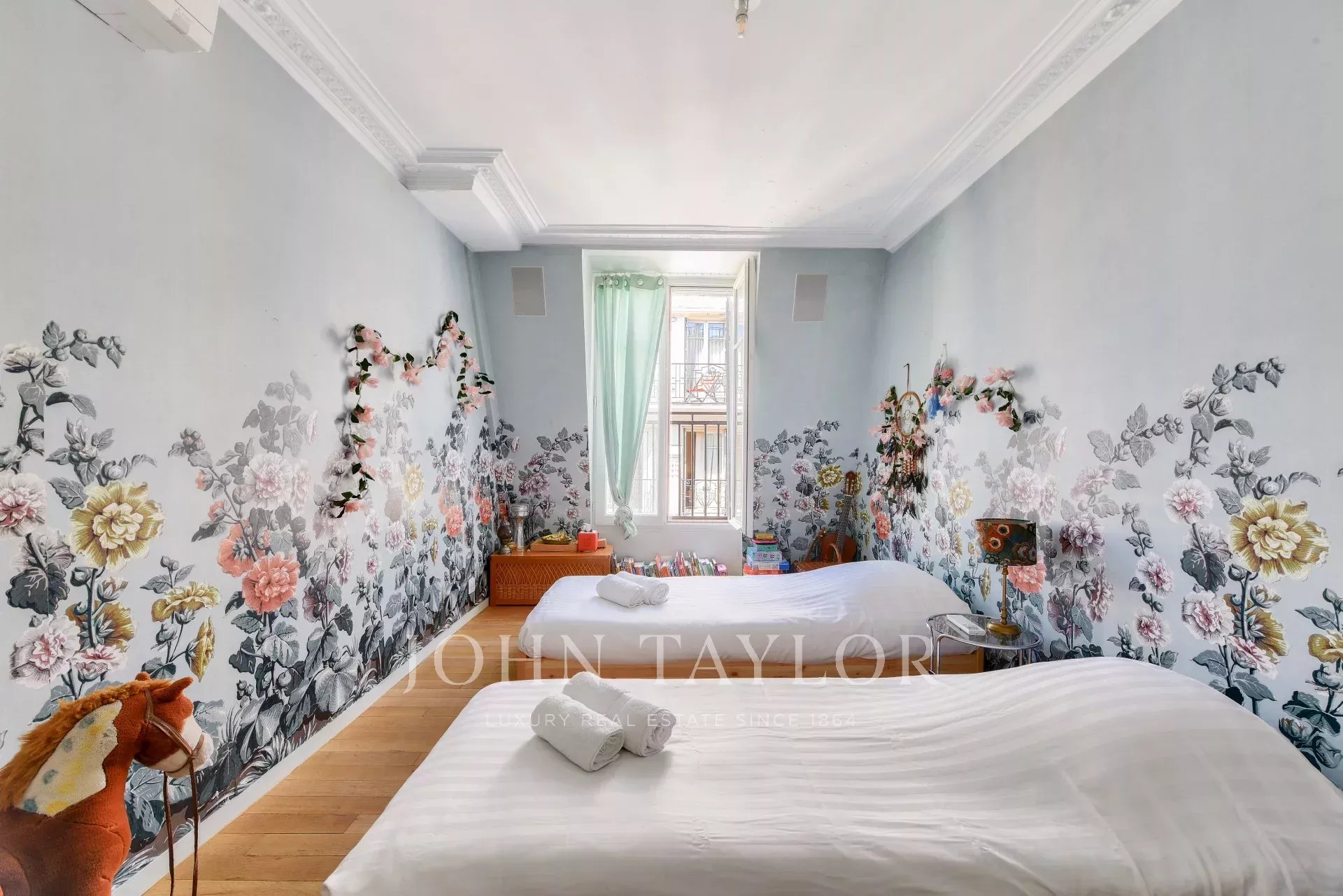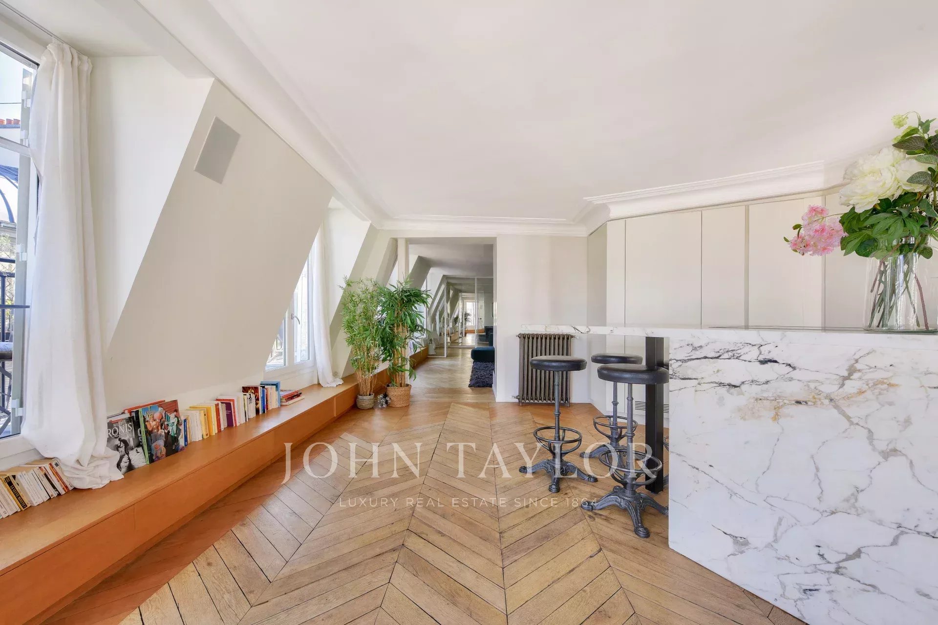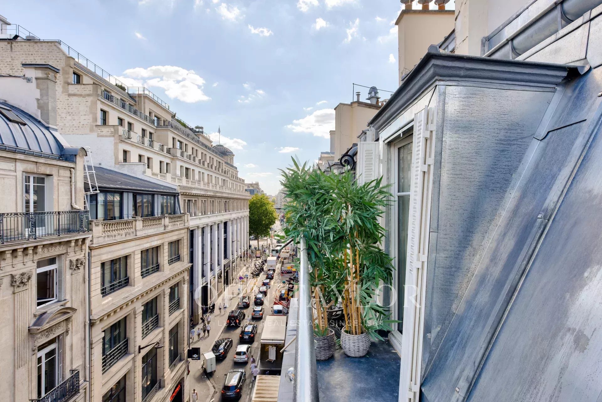 Just a stone's throw from the Champs-Élysées, on the top floor with elevator and boasting a wrap-around balcony of over 20 sq.m., this corner apartment with a surface area of 100 sq.m. Carrez and 107 sq.m. floor space is located on one of the most dynamic streets in the 8ᵉ arrondissement.
