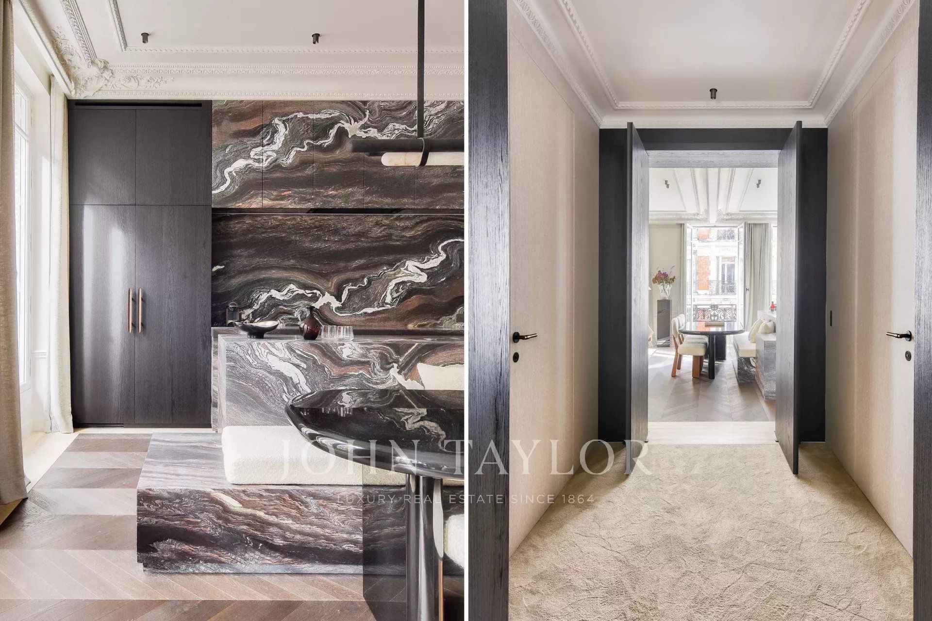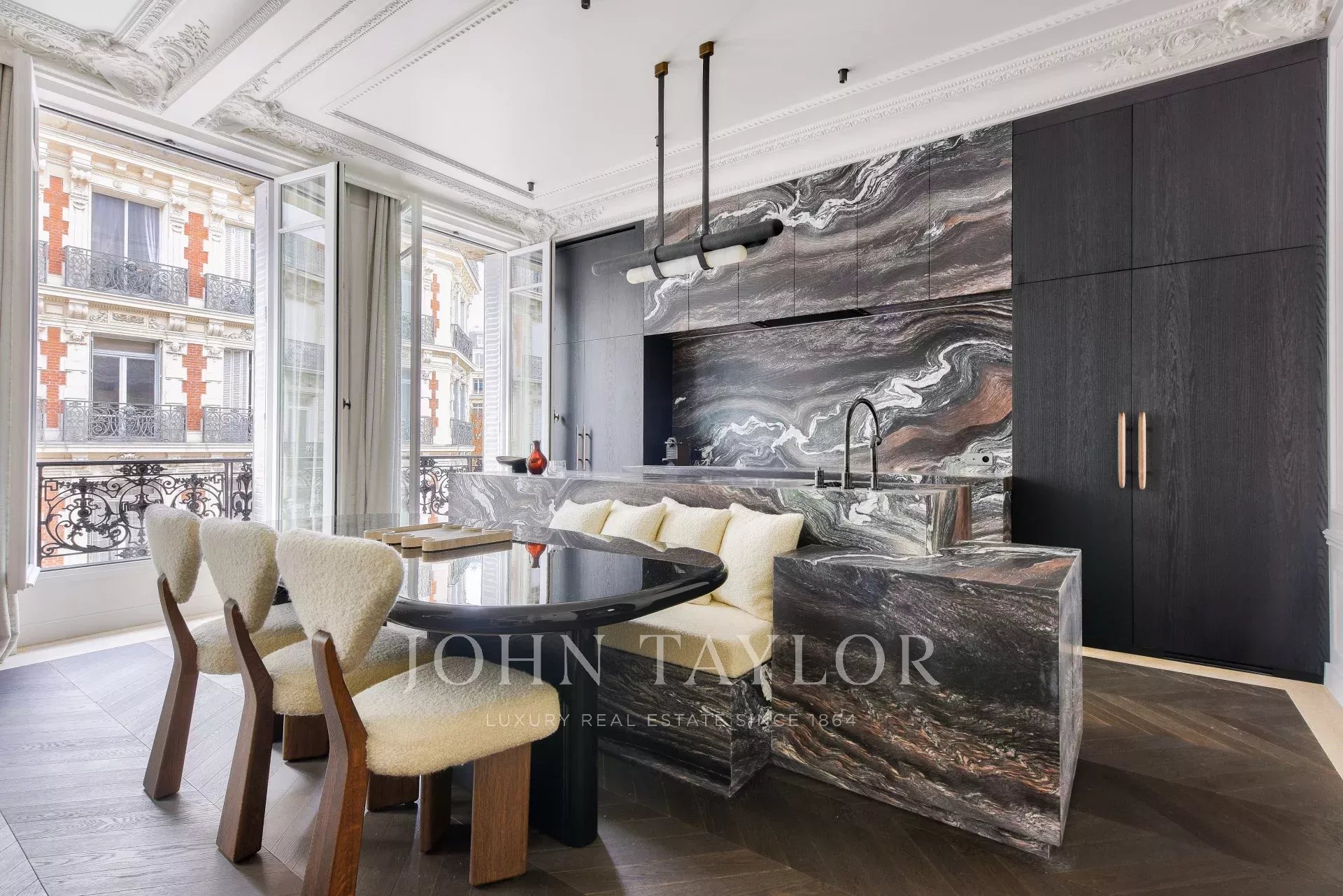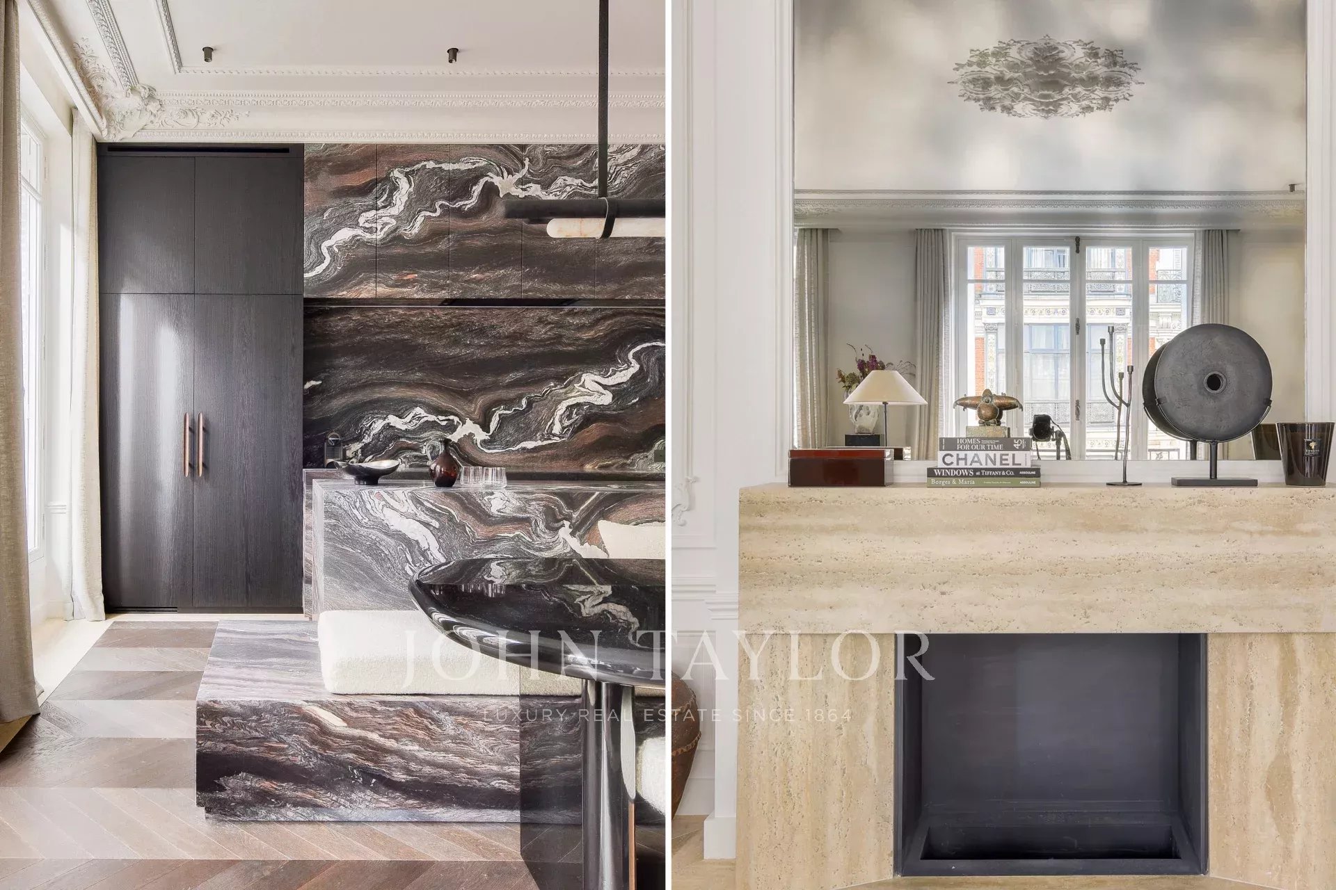 In the heart of the Golden Triangle, just steps from the Four Seasons and the Bvlgari Hotel, on the 3rd floor of a beautiful pierre de taille building emblematic of Parisian architecture, we are pleased to present this magnificent pied-à-terre, fully renovated and decorated by architect Félix Millory, sold furnished and ready to move in.