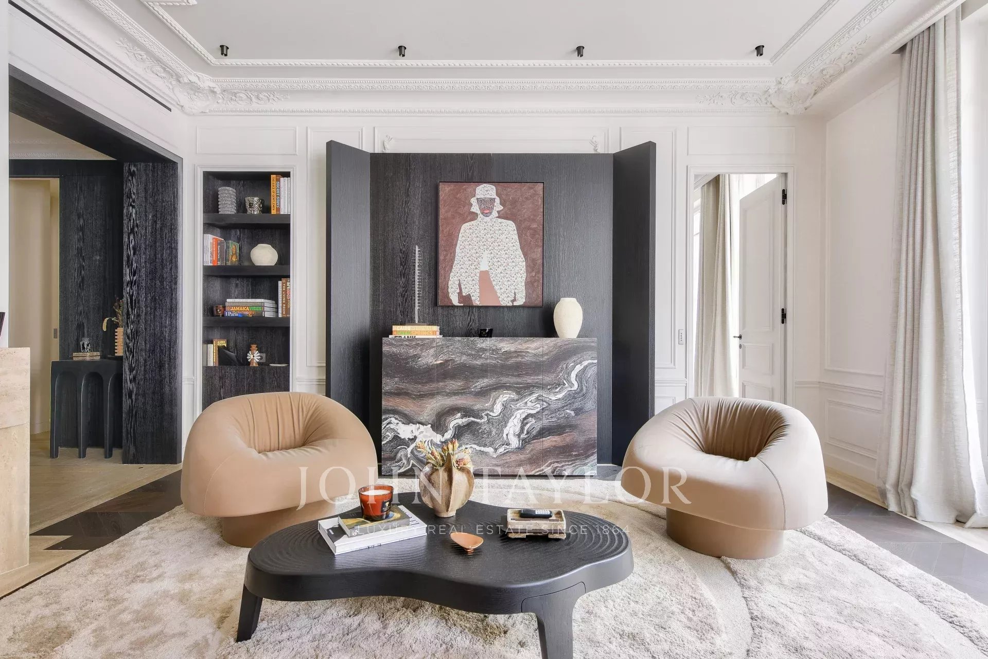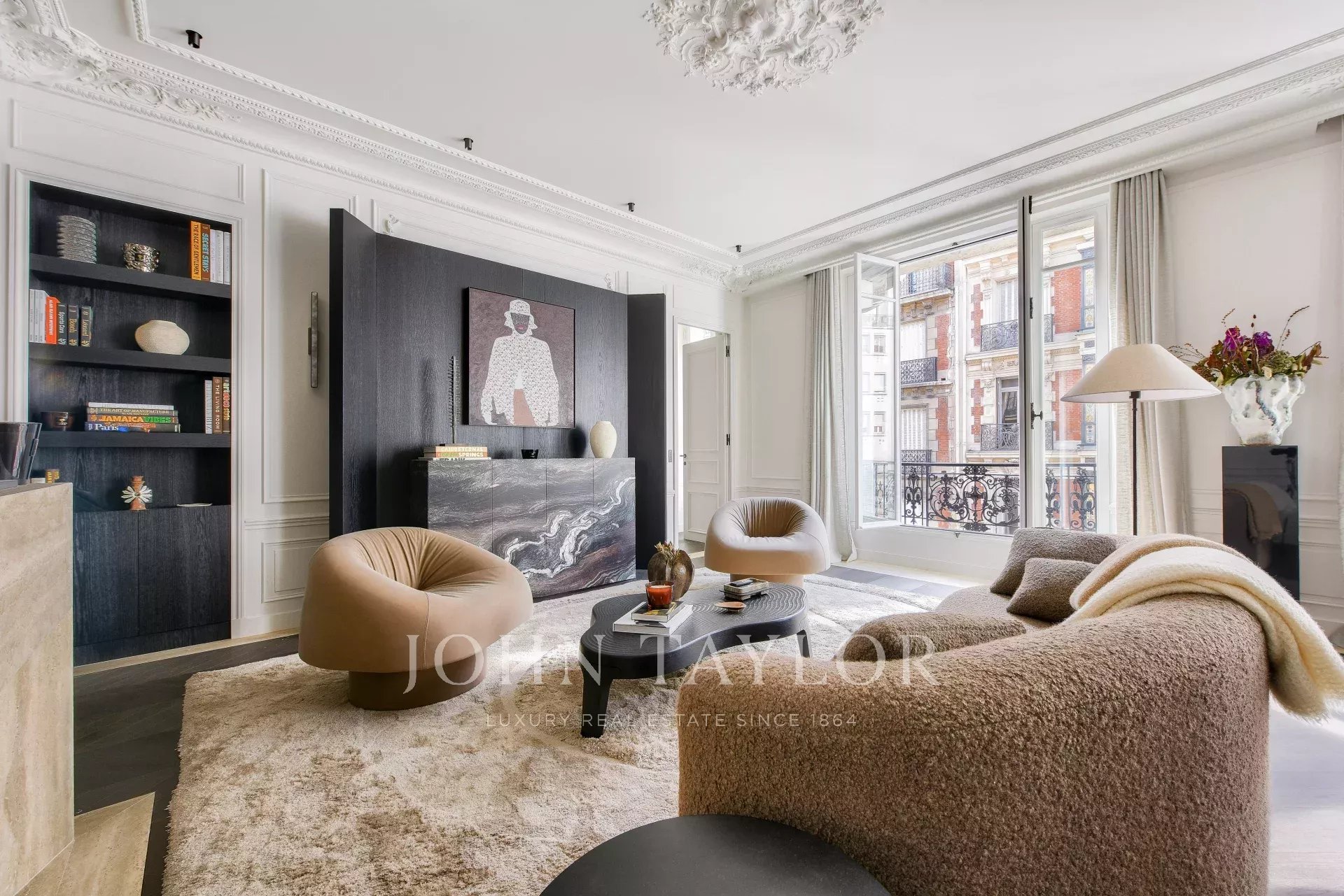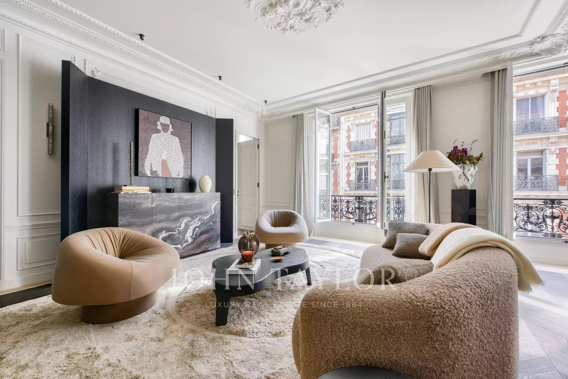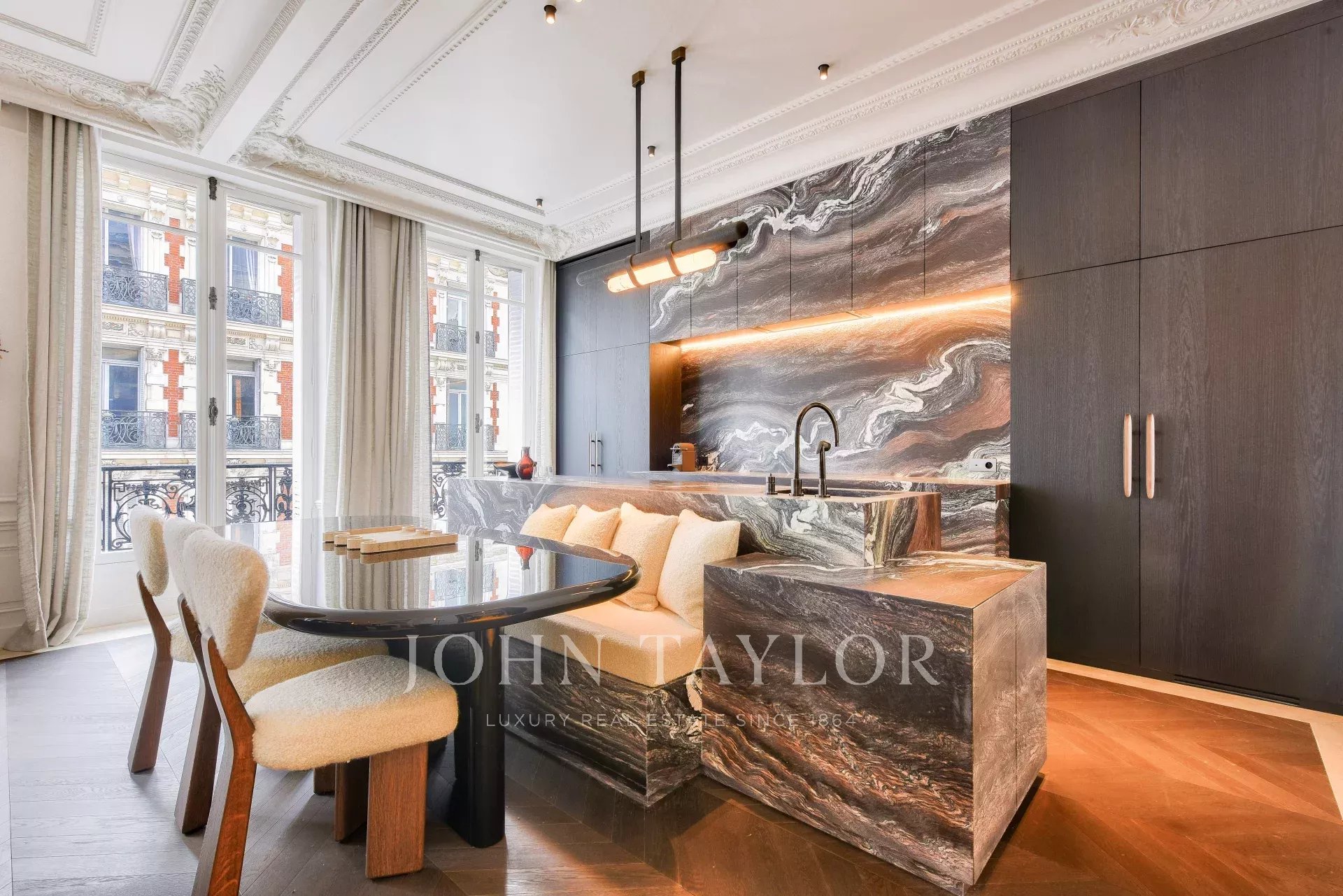 In the heart of the Golden Triangle, just steps from the Four Seasons and the Bvlgari Hotel, on the 3rd floor of a beautiful pierre de taille building emblematic of Parisian architecture, we are pleased to present this magnificent pied-à-terre, fully renovated and decorated by architect Félix Millory, sold furnished and ready to move in.