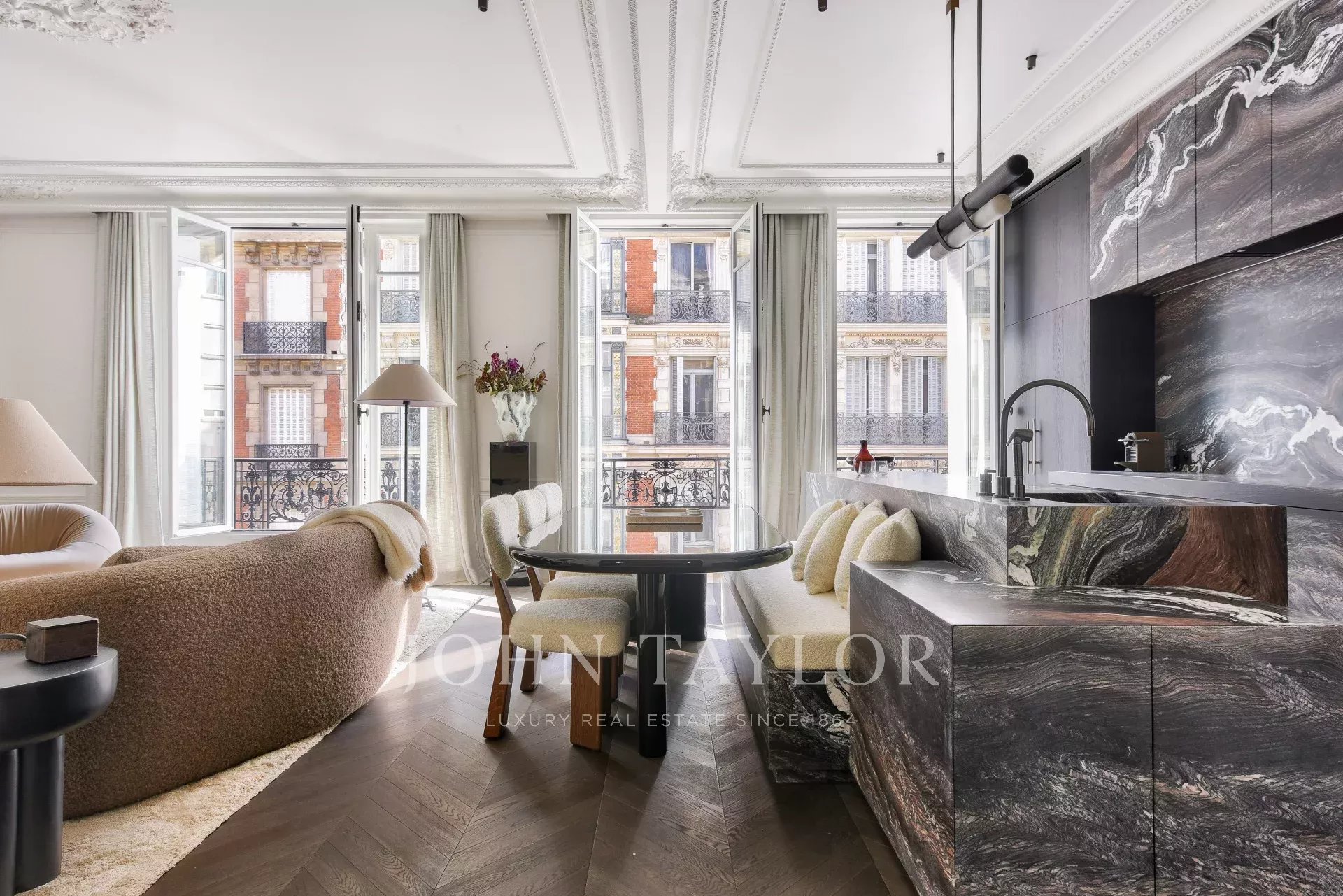 - A bright and spacious living room overlooking the street, with a refined open kitchen and a quartz countertop,
