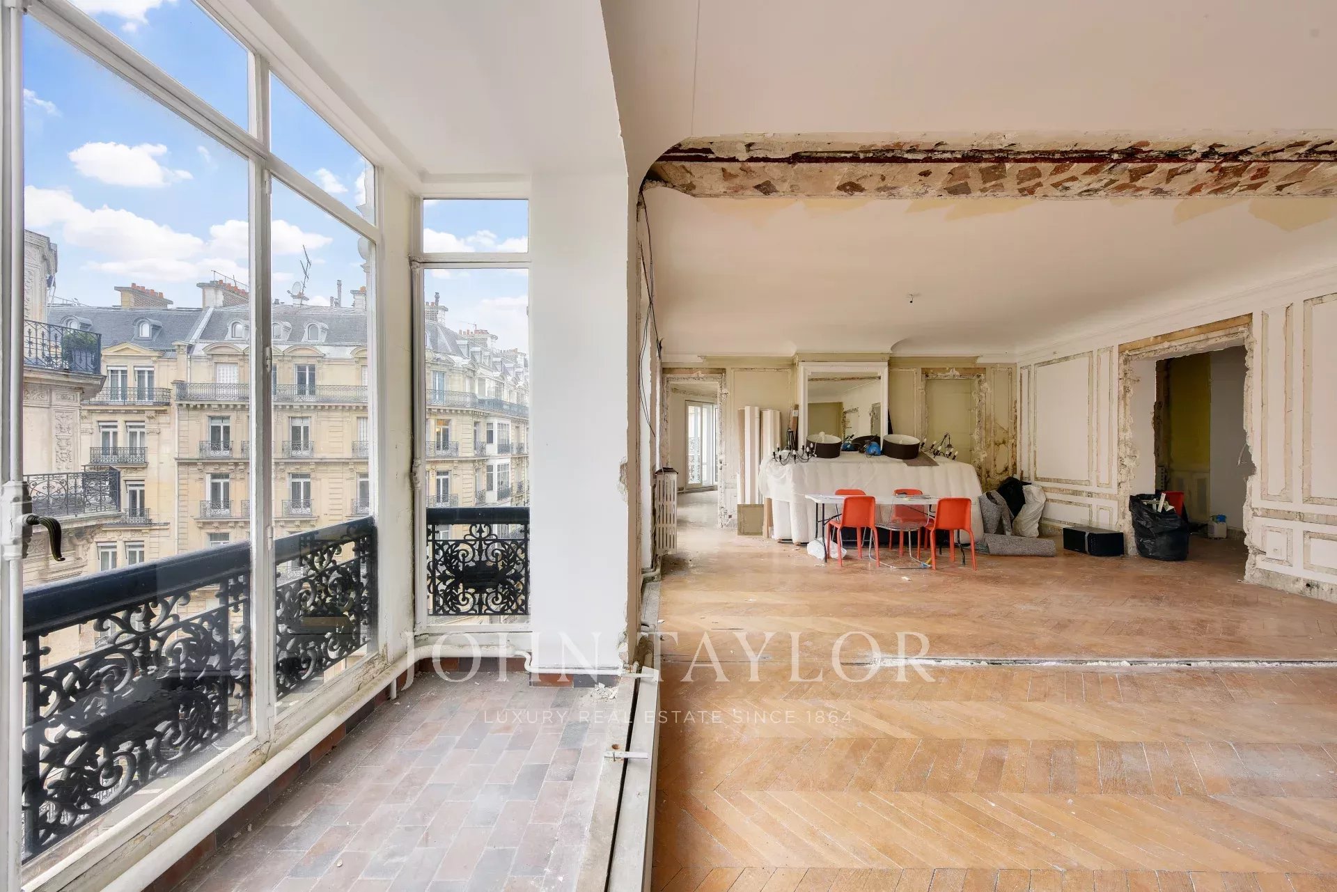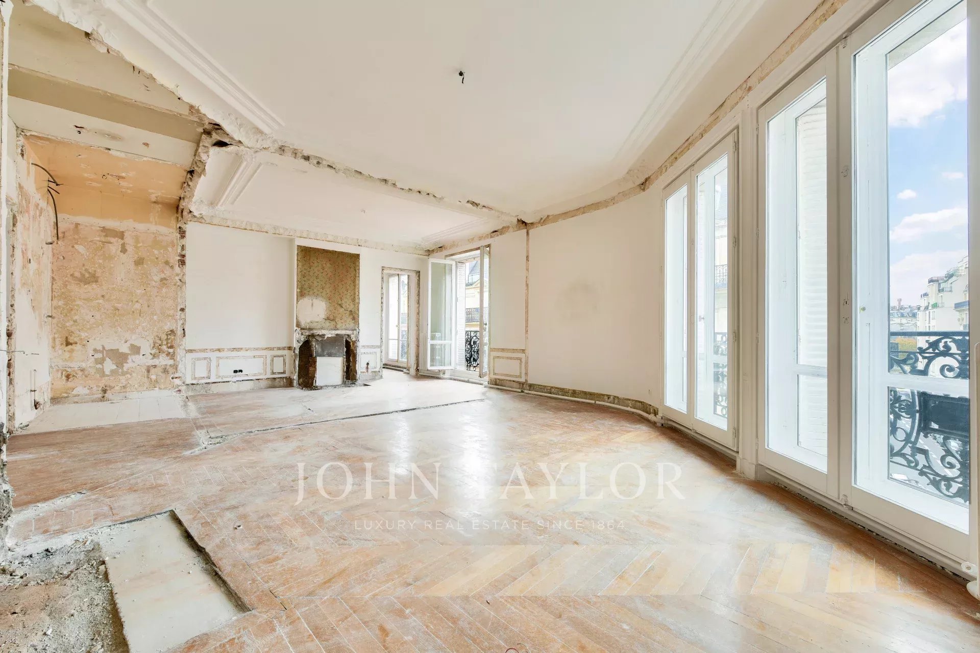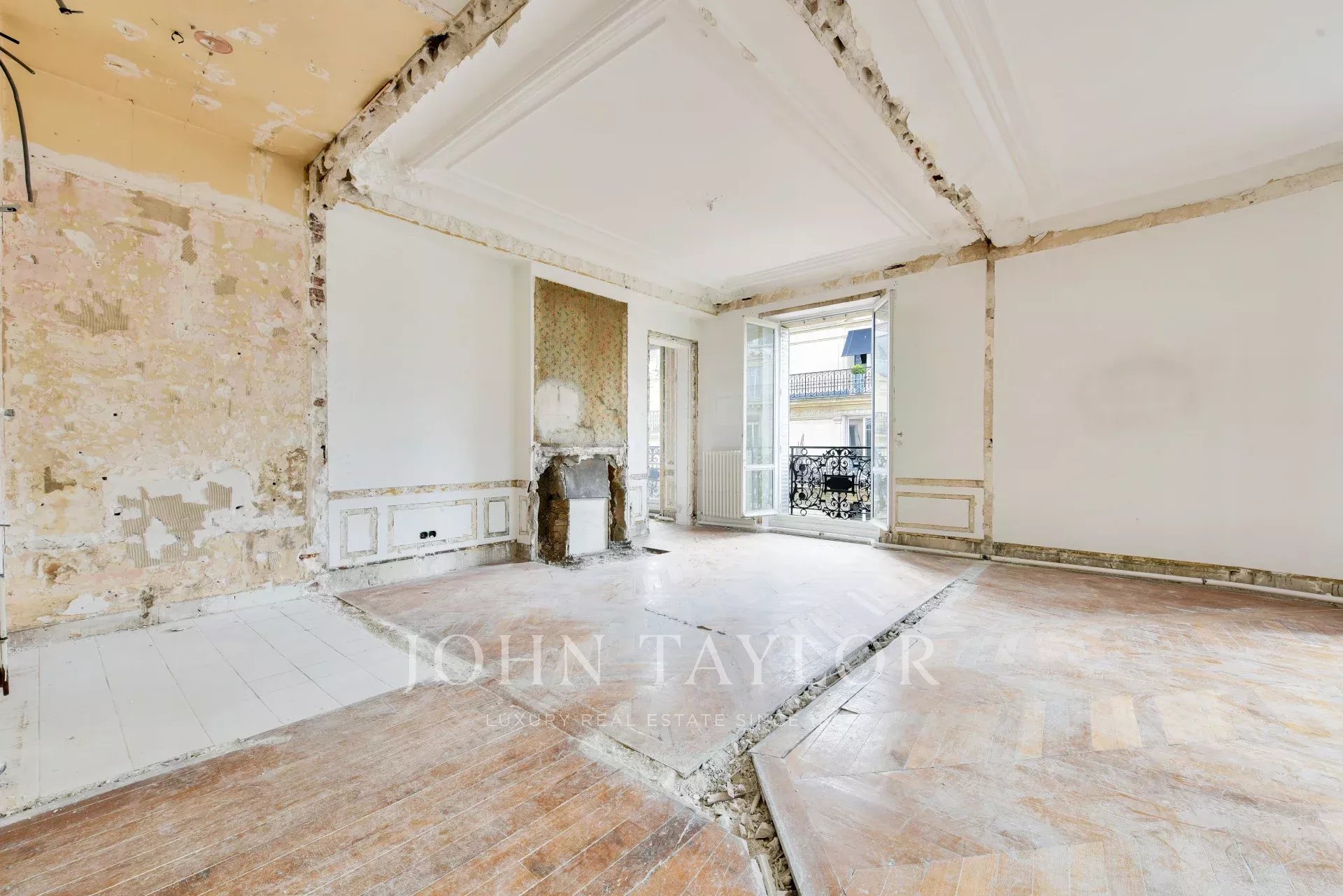 The corner apartment on the 4th floor has retained its period features: marble fireplaces, herringbone parquet flooring, 3.22m high ceilings, and is in need of renovation.