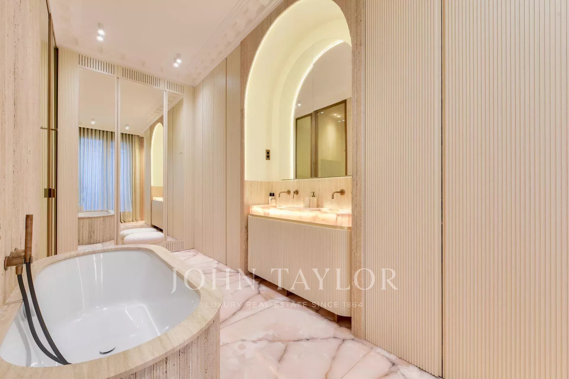 The refined decor, combined with high-quality materials such as travertine and Versailles parquet, gives the apartment a rare elegance.