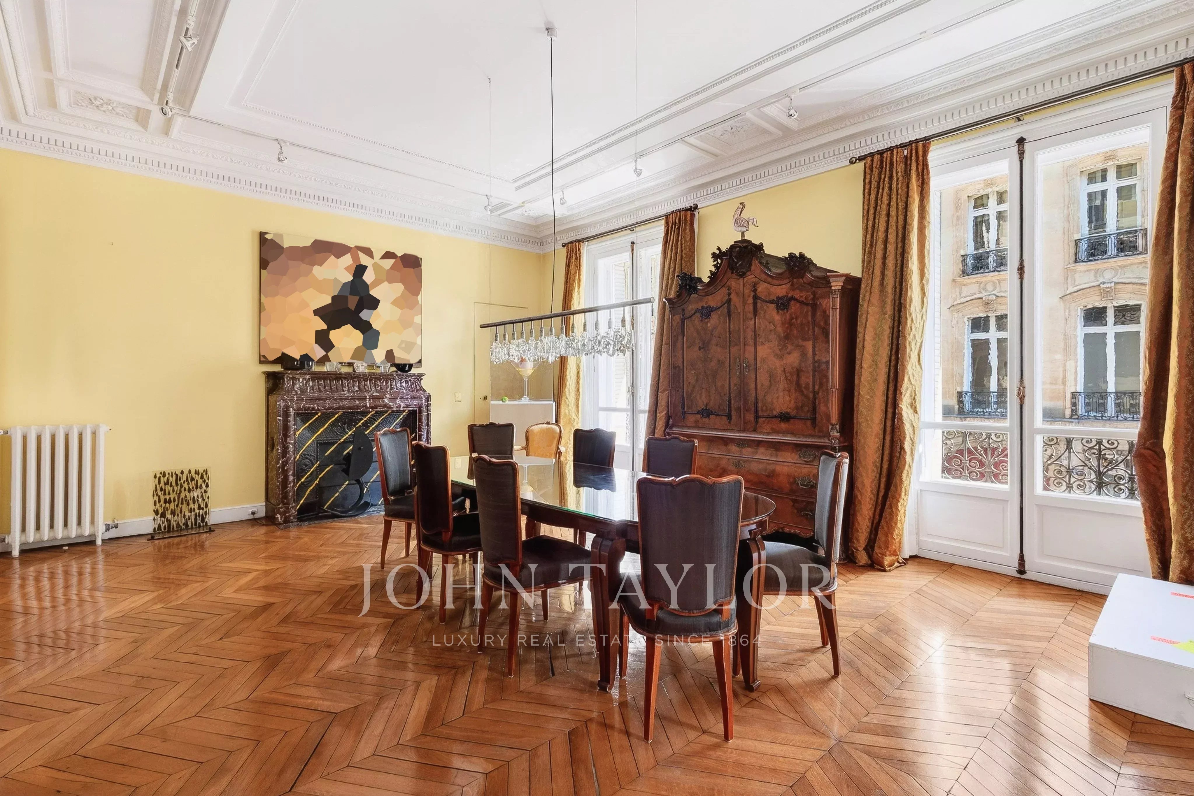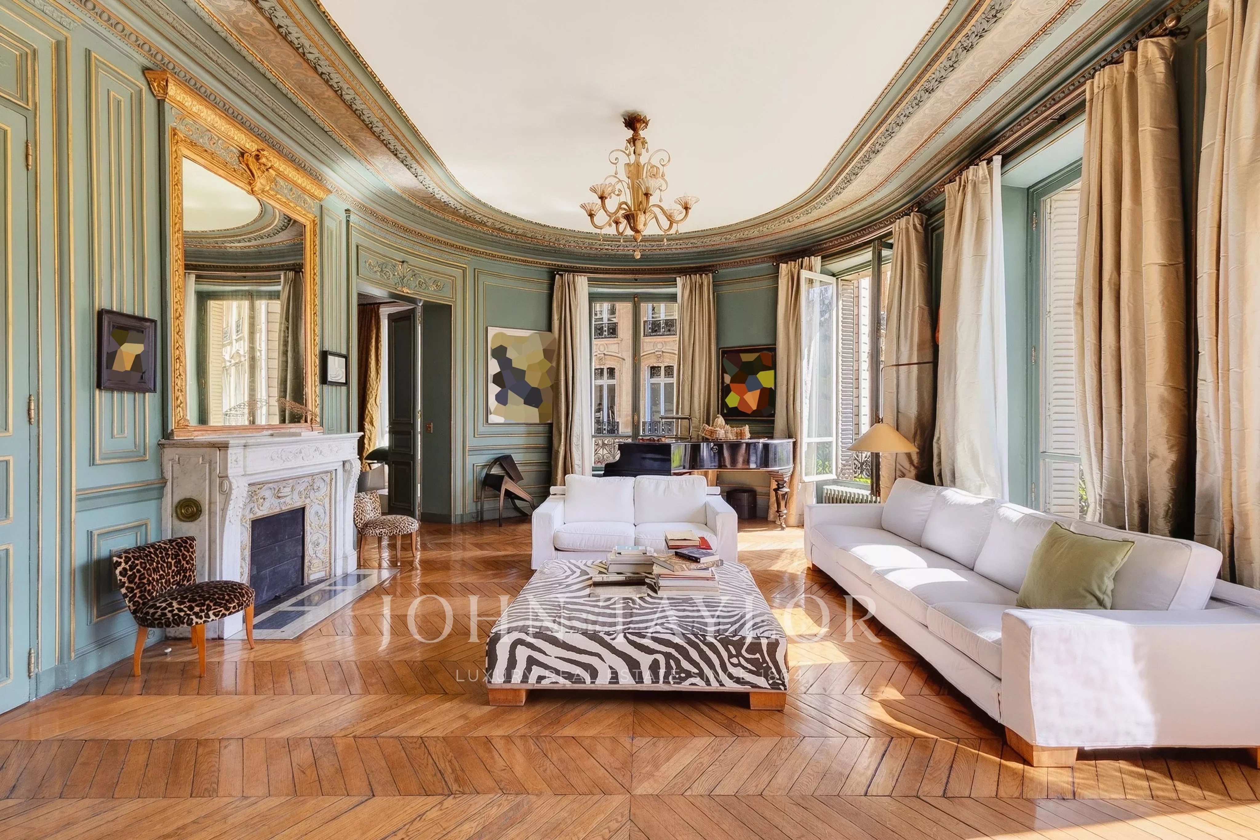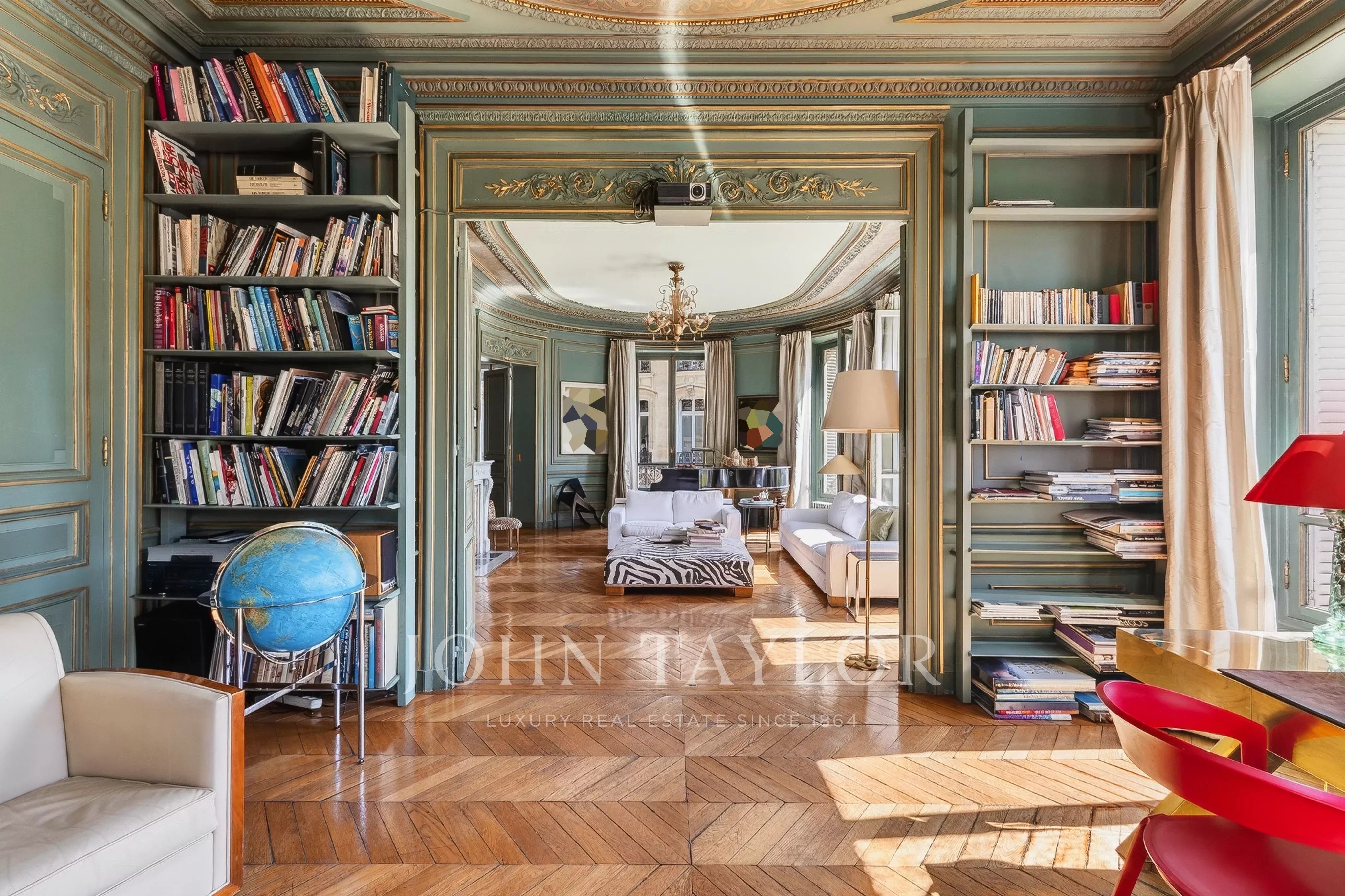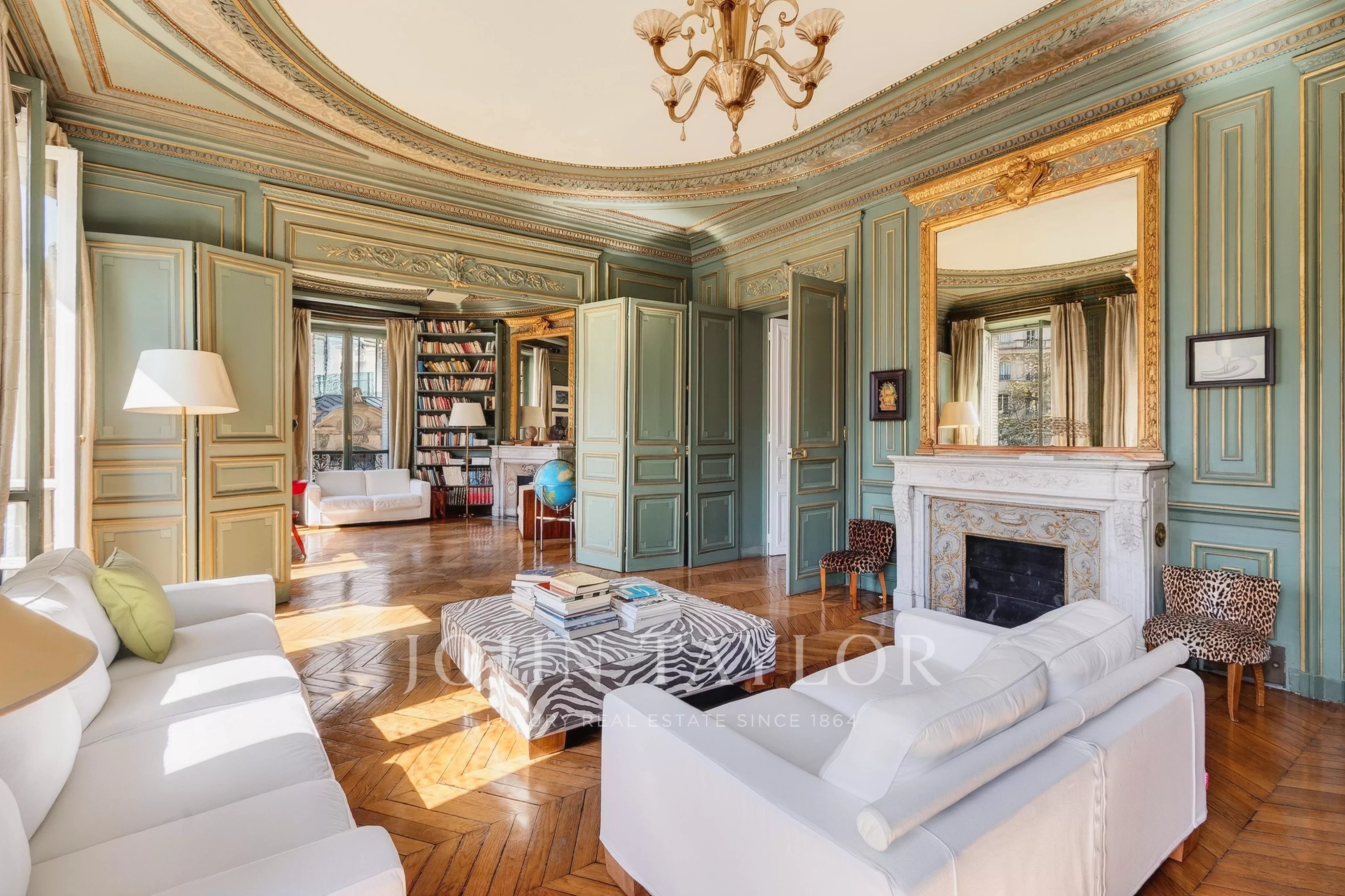Featuring seven floor-to-ceiling windows, the triple reception room boasts a refined and timeless décor with its mouldings, gilding and fireplaces.