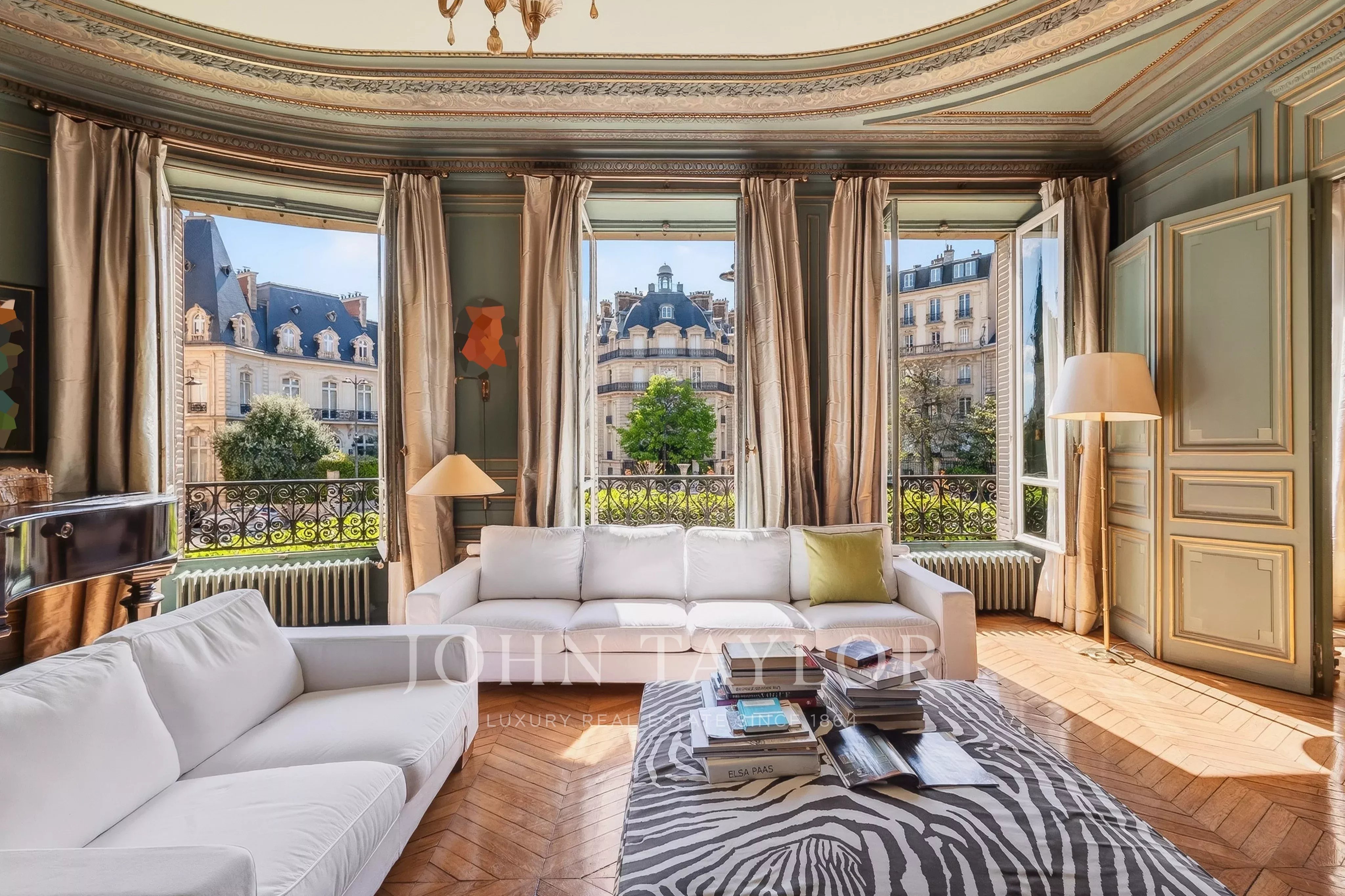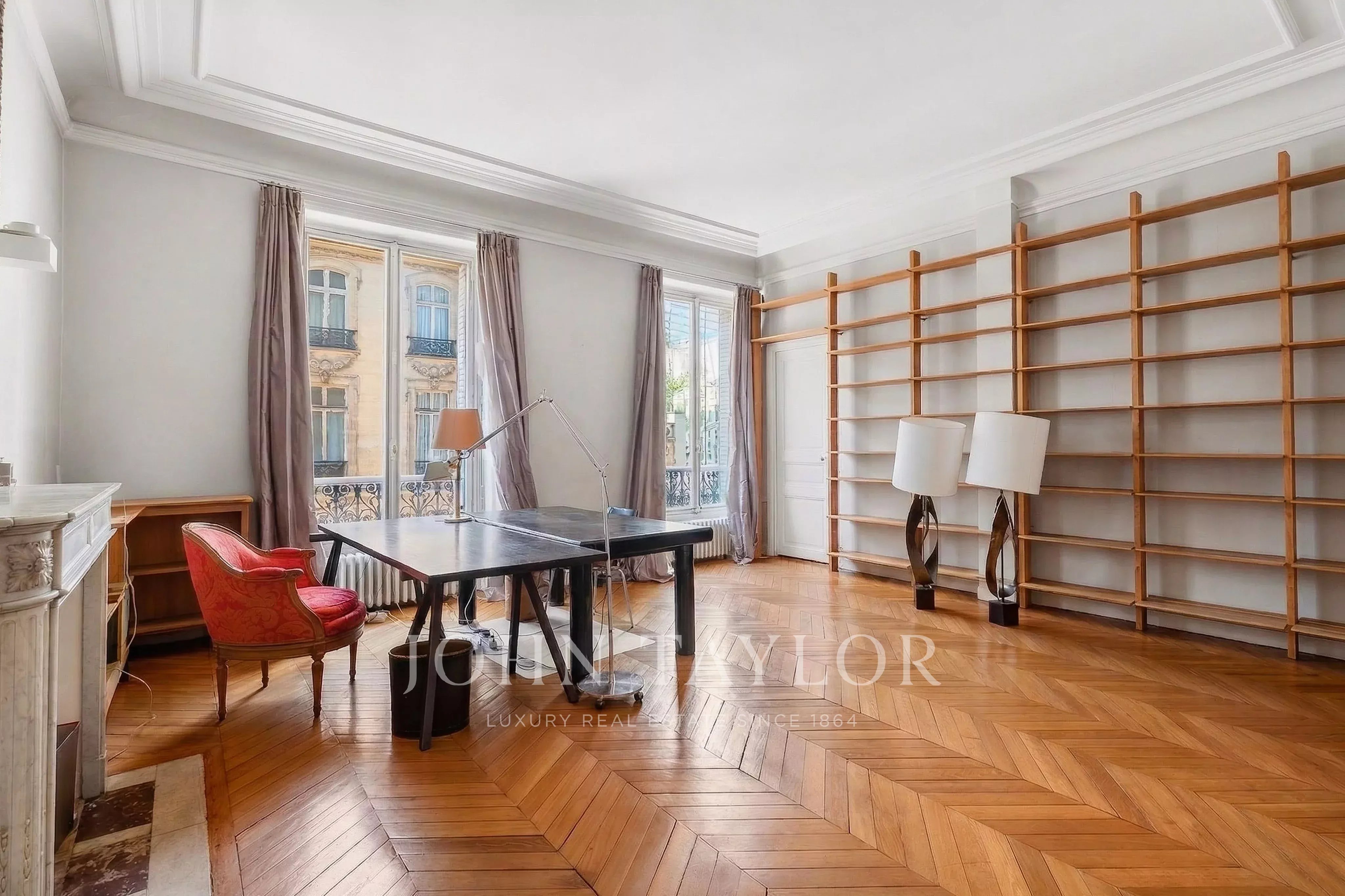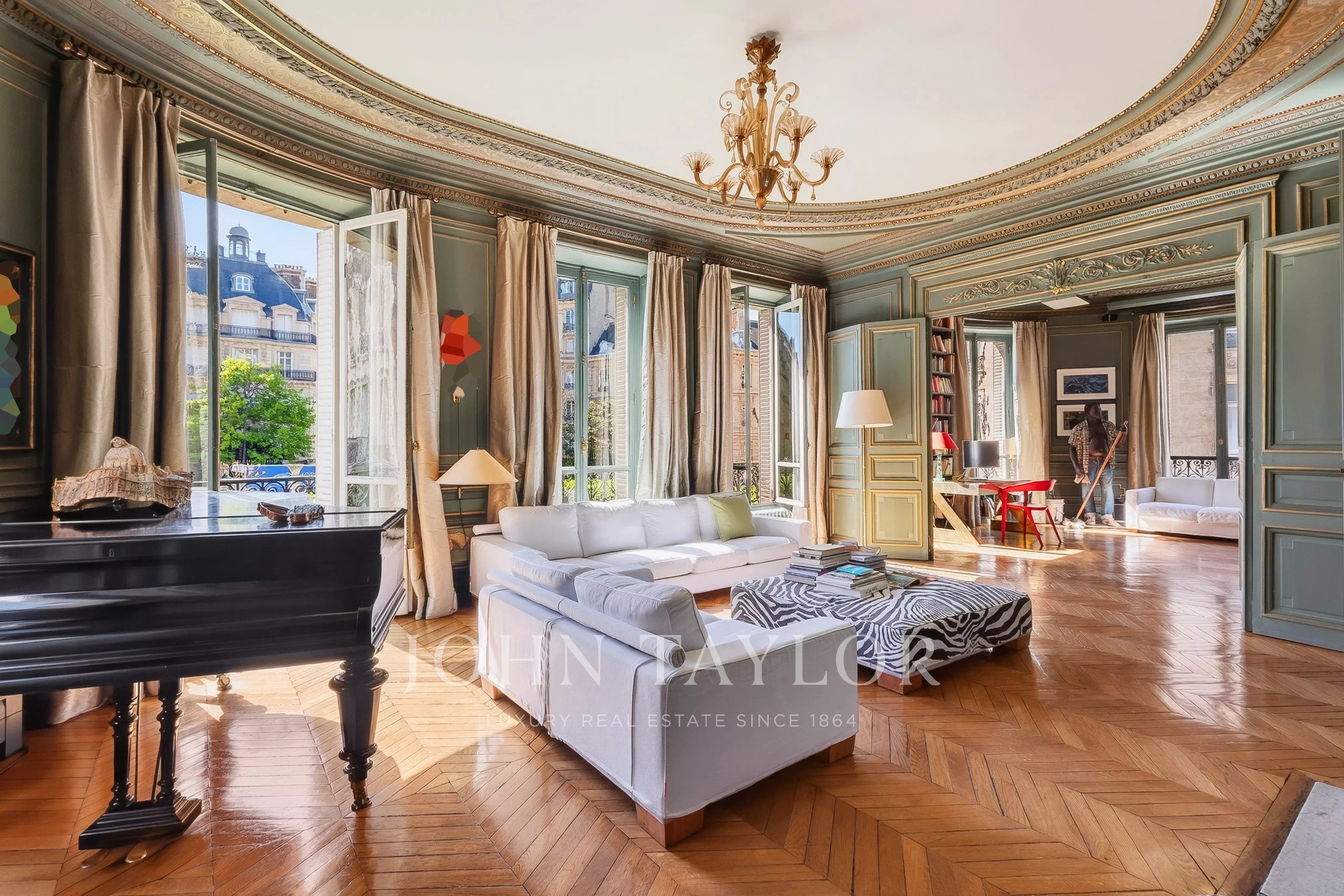 Featuring seven floor-to-ceiling windows, the triple reception room boasts a refined and timeless décor with its mouldings, gilding and fireplaces.