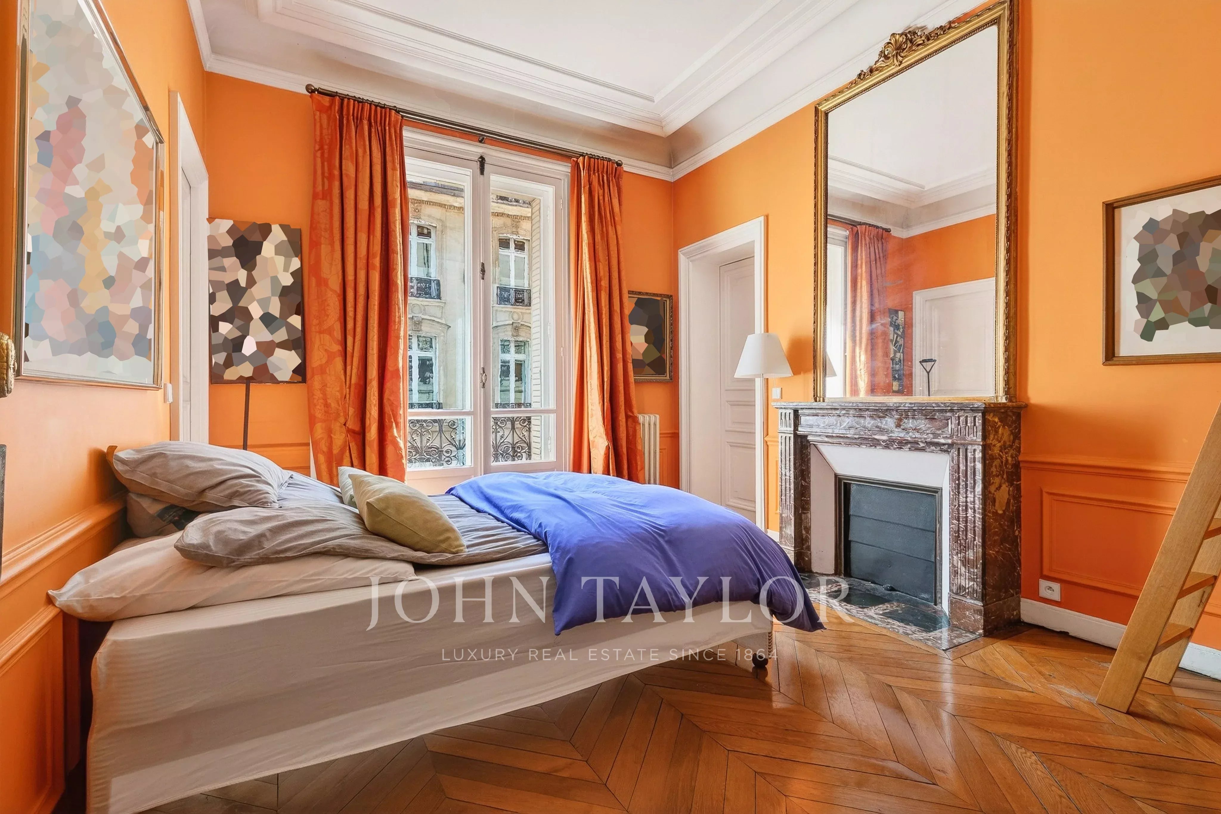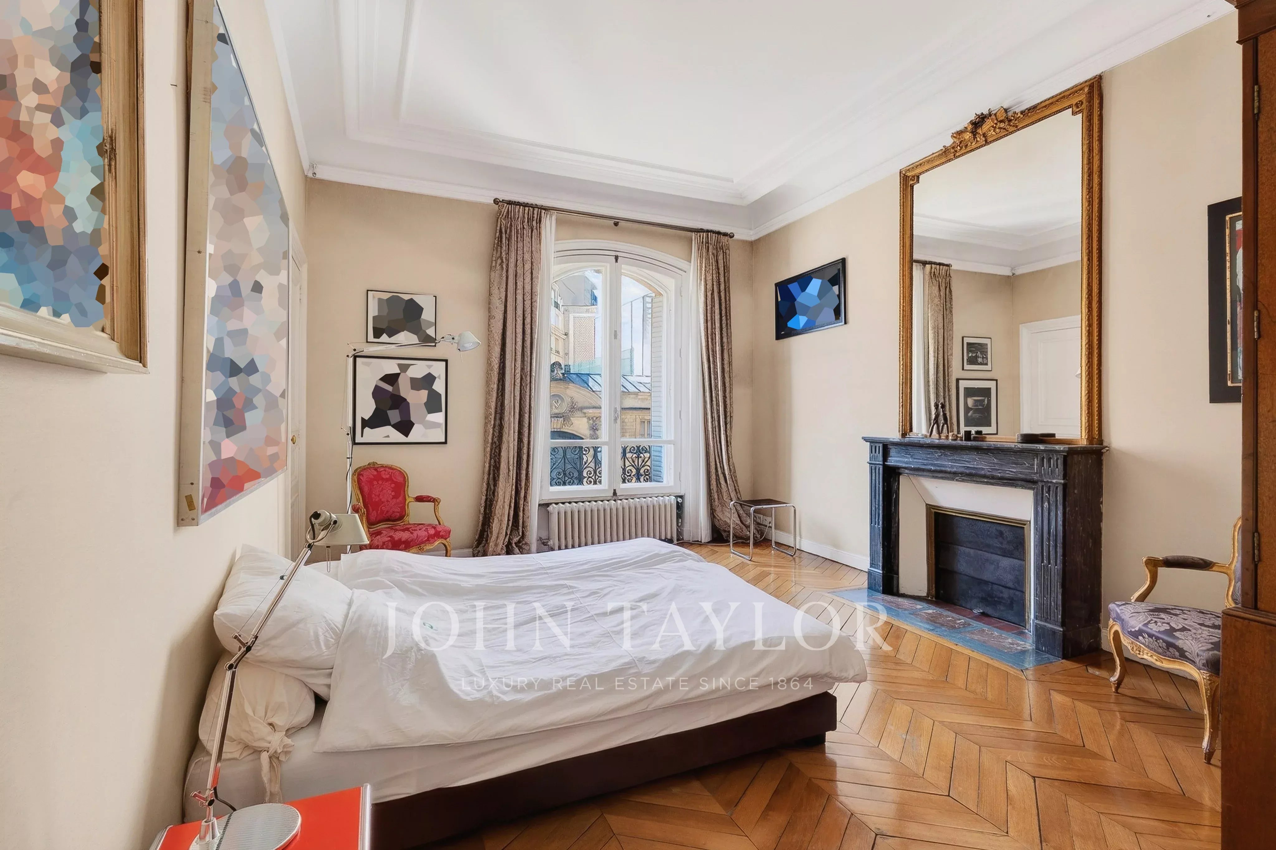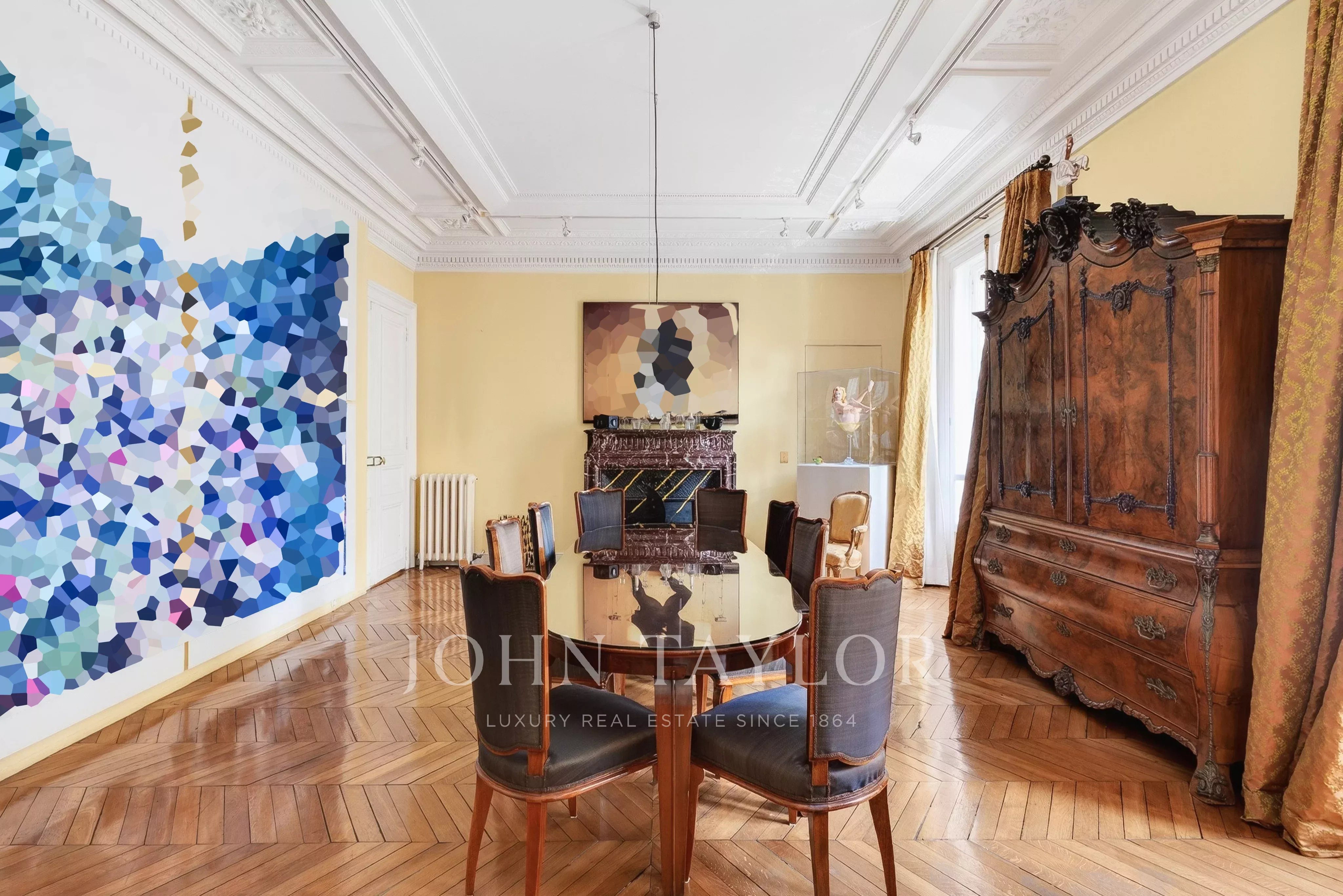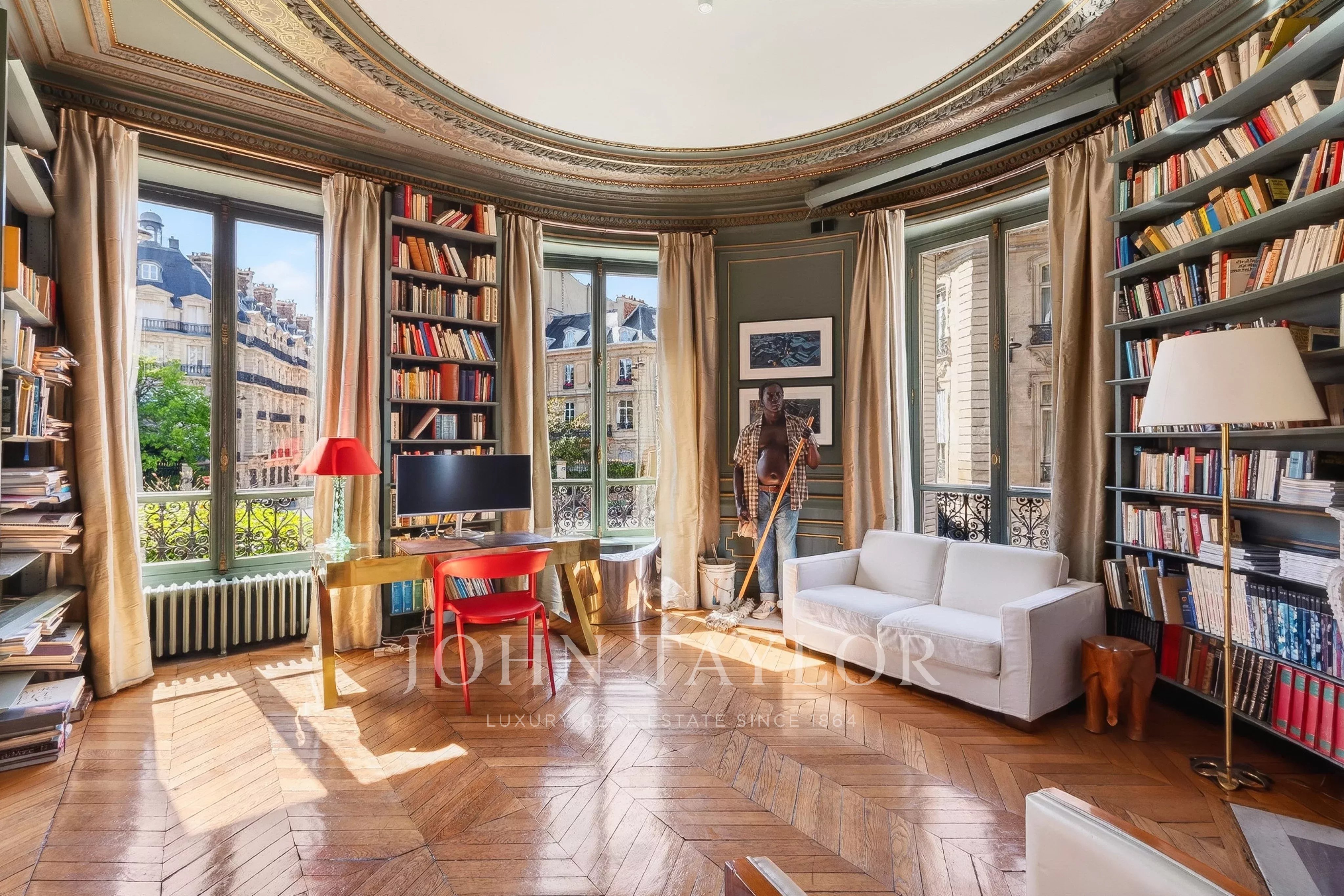 Featuring seven floor-to-ceiling windows, the triple reception room boasts a refined and timeless décor with its mouldings, gilding and fireplaces.