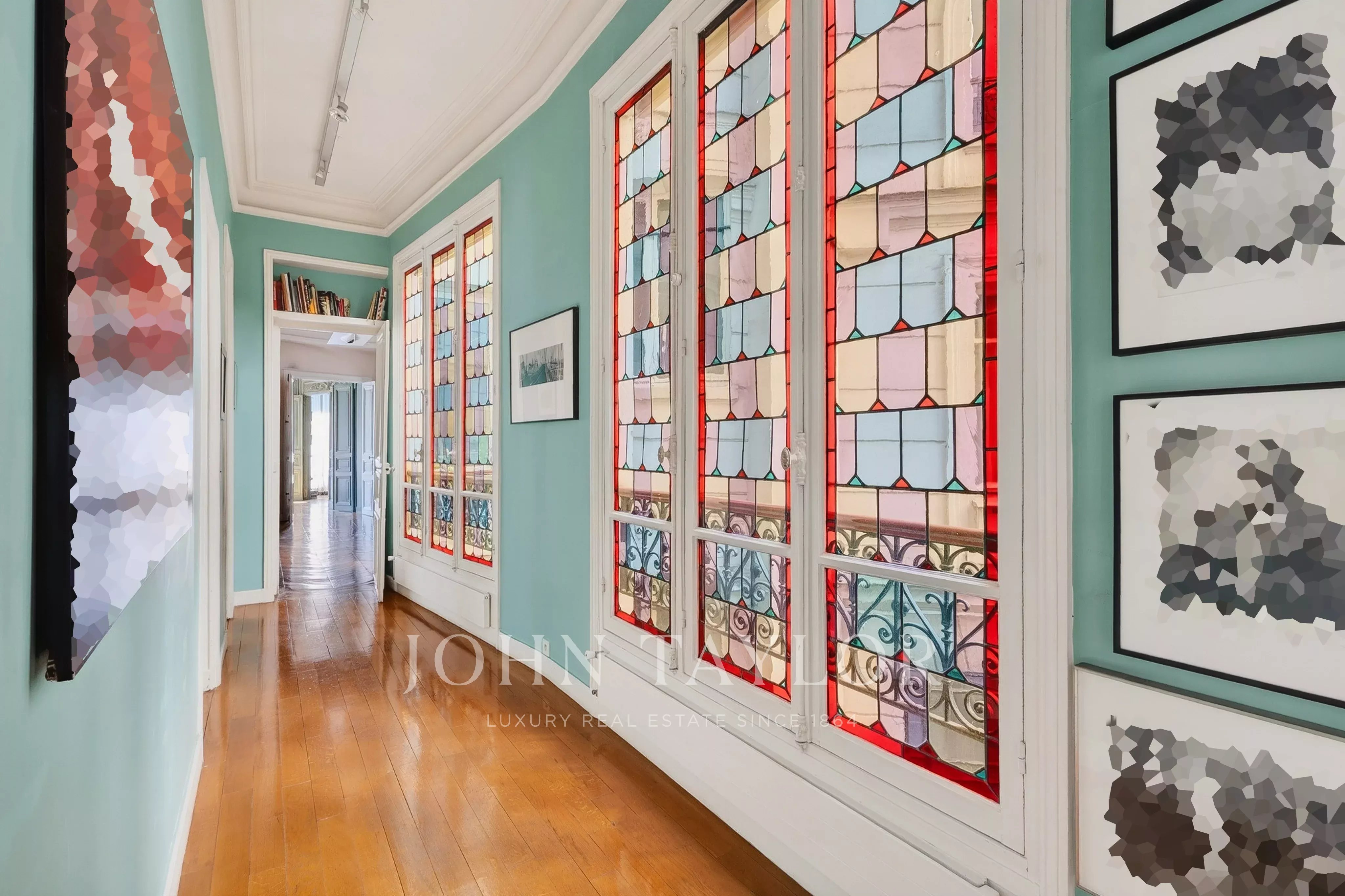 - a hallway with magnificent antique stained-glass windows