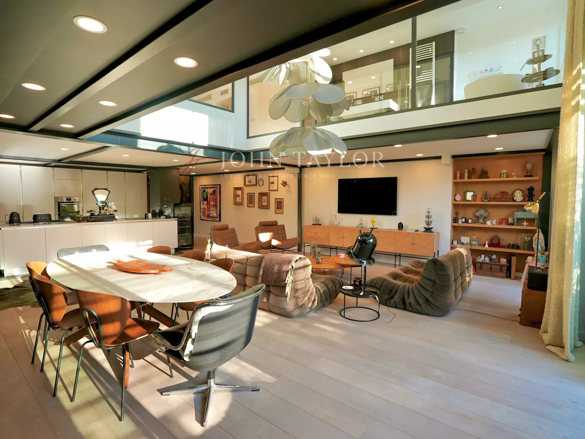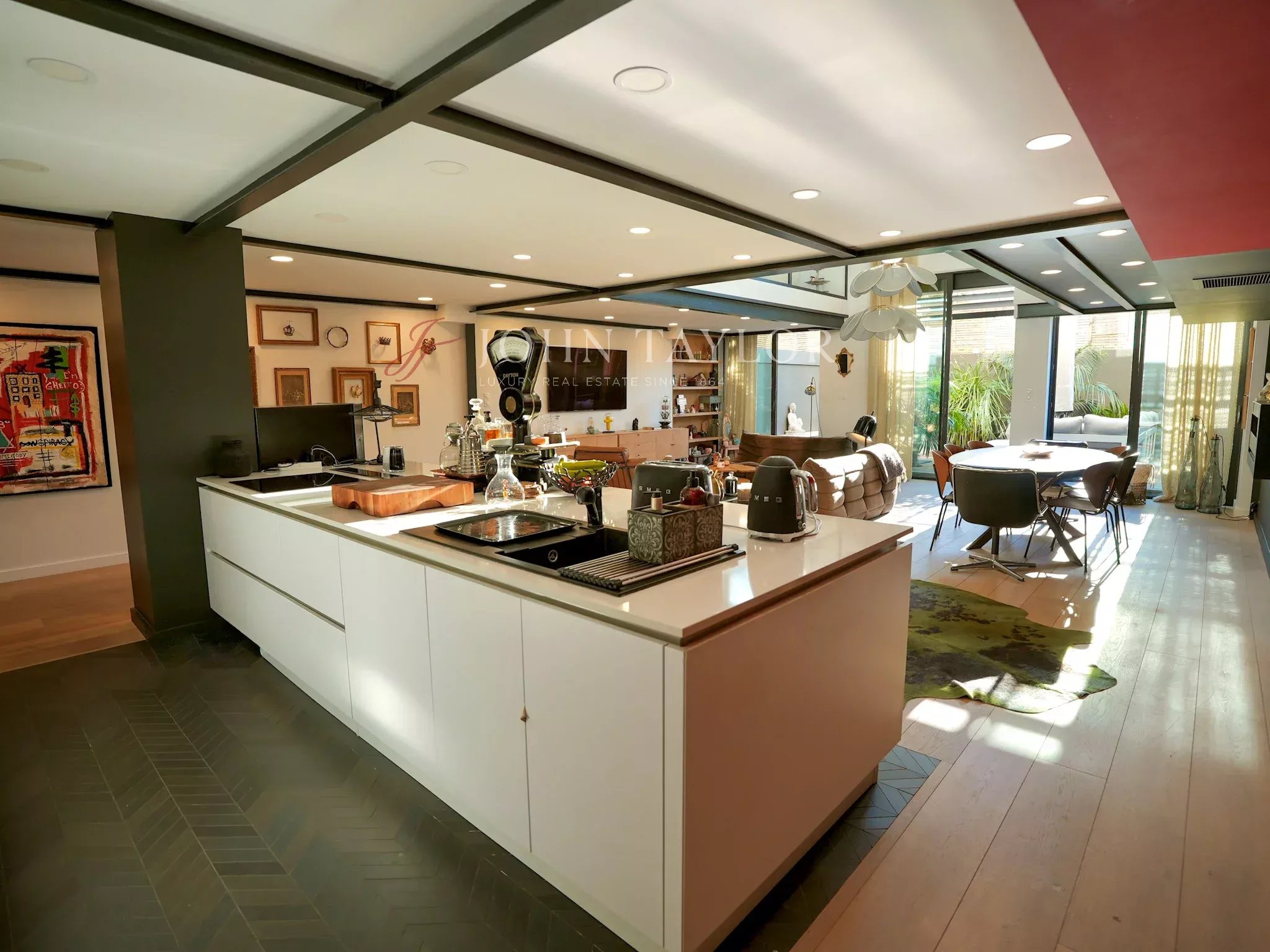 Located in a high-end residence, it reveals itself from the entrance with a well-maintained access, followed by a striking full-height wooden door that sets the tone. Inside, the volumes are immediately impressive: a spacious living area filled with natural light, featuring nearly 5-meter-high ceilings and large openings.