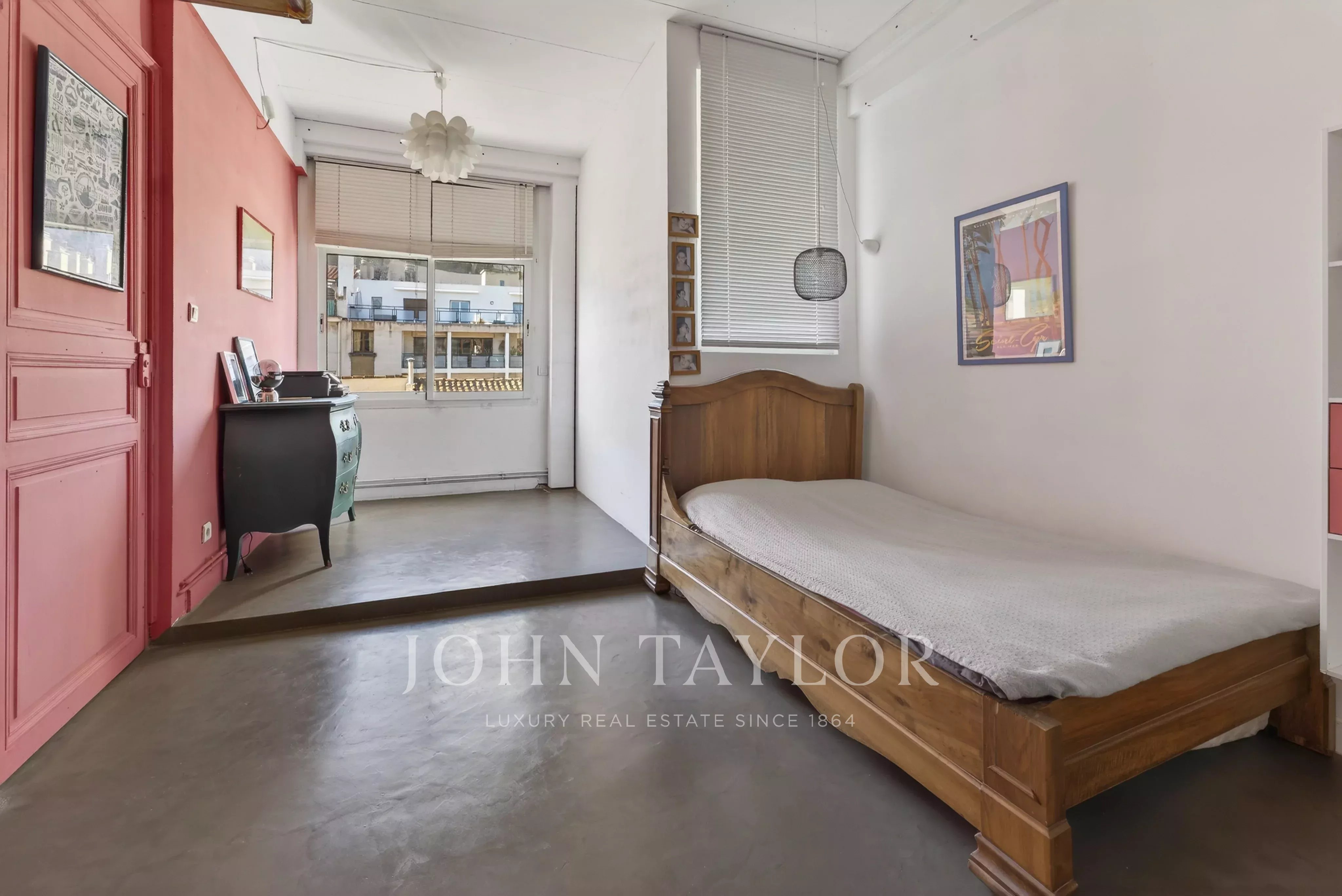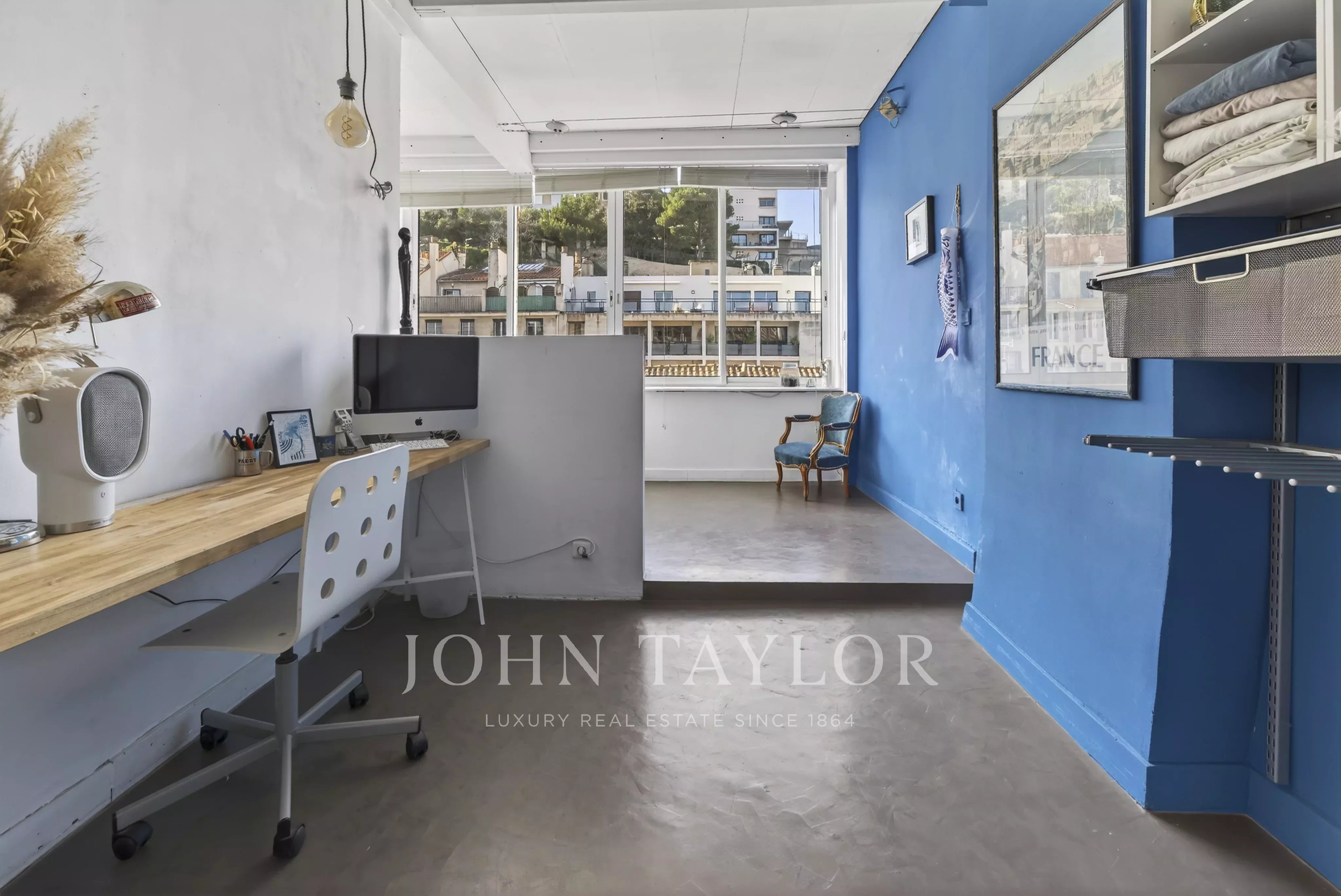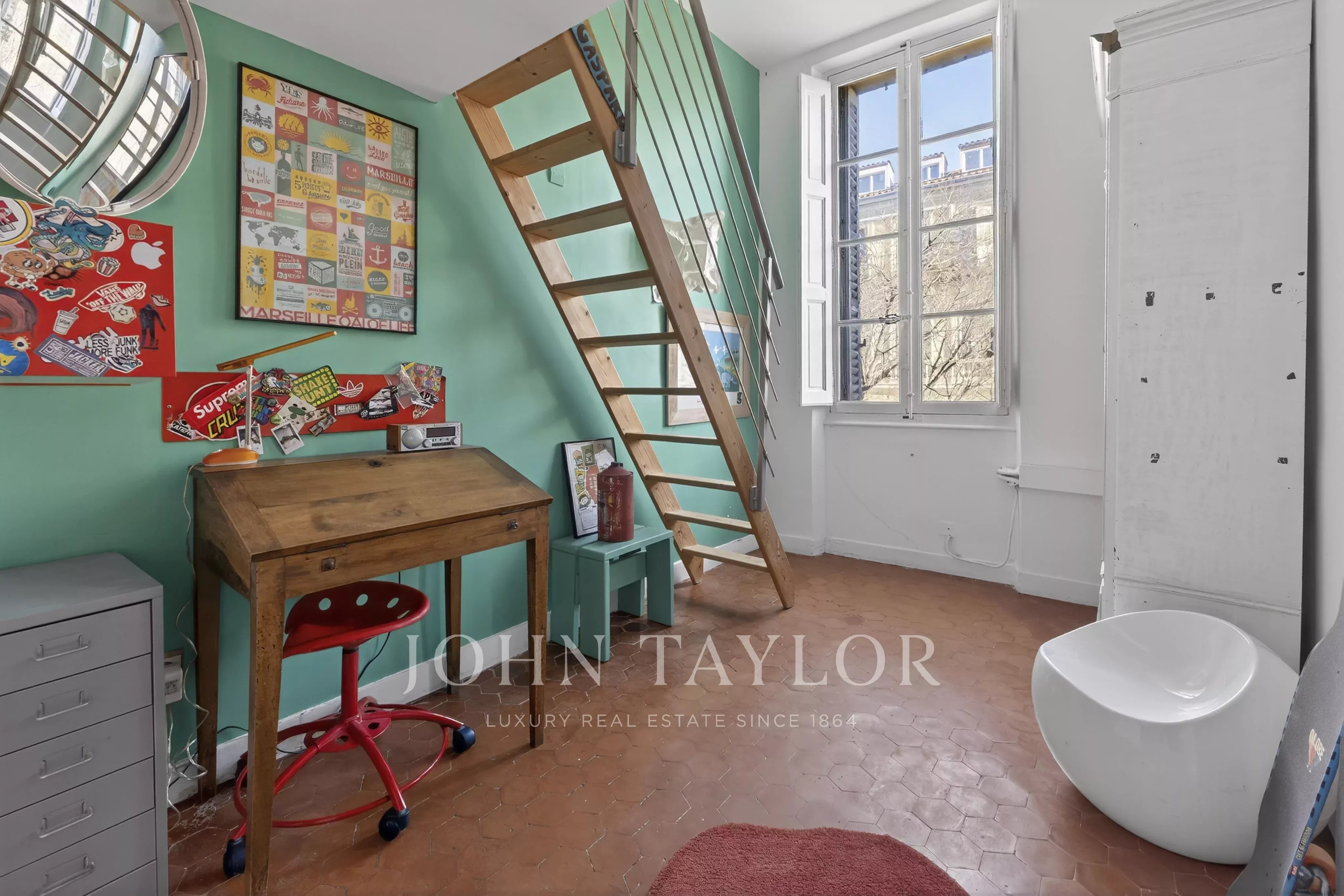 The upper level hosts an independent suite opening directly onto a 50 sqm terrace with views of the iconic “Bonne Mère”, offering a rare outdoor space in the heart of the city. This level, entirely dedicated to the suite, can also be arranged as a home office or a full master suite.