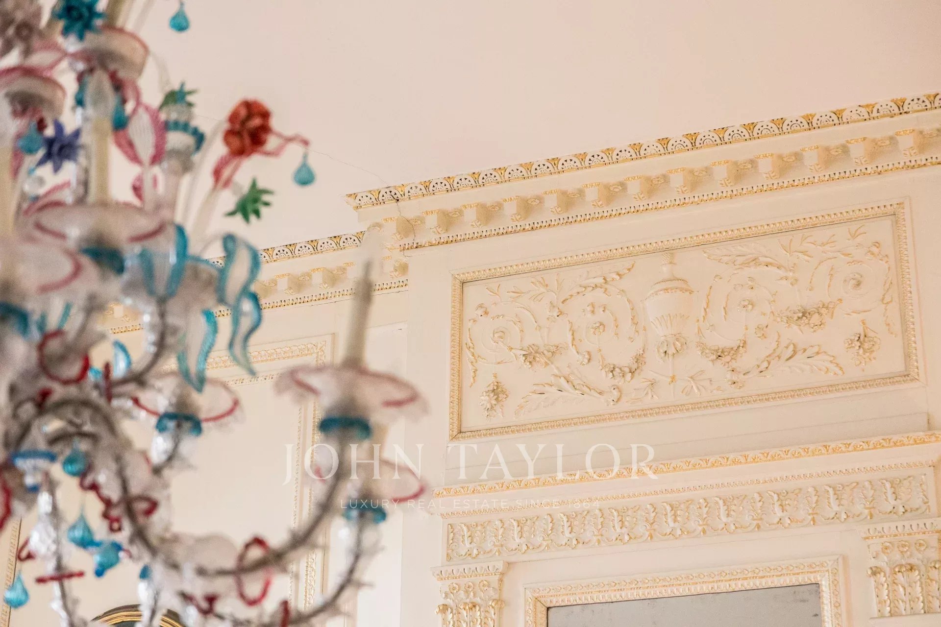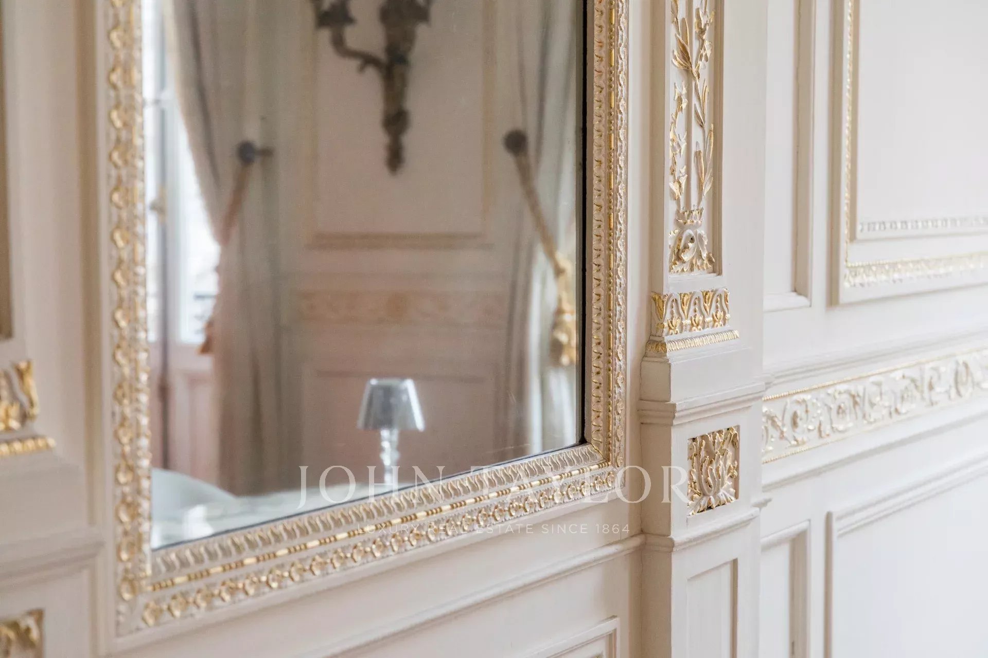 Delicate gilding, hand-carved moldings, and a Murano glass chandelier bring a rare touch of opulence. The herringbone parquet flooring, meticulously crafted, enhances the apartment’s authenticity, while at its center, a listed fireplace, designed by Victor Louis (architect of the Grand Théâtre), underscores the prestige of this historic setting.