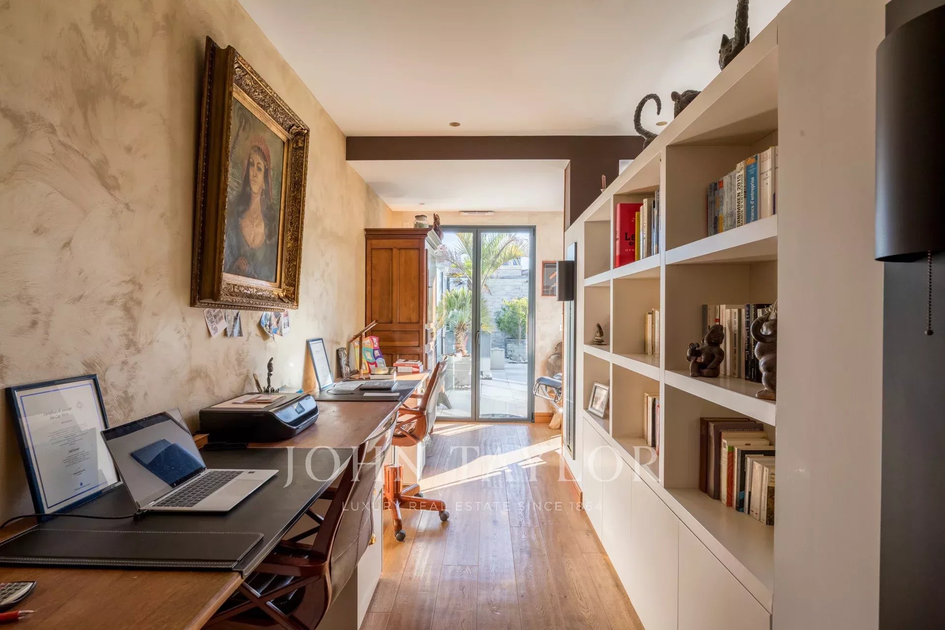 The entrance opens onto a vast living room bathed in light thanks to its large bay windows opening directly onto a magnificent terrace with SPA, offering a perfect extension of the living space. A modern, semi-open kitchen fitted with brand-name appliances, a charming dining room and a large, comfortable office for telecommuting complete this reception area.