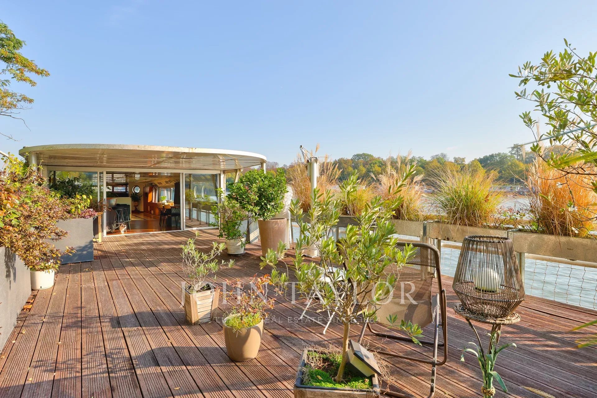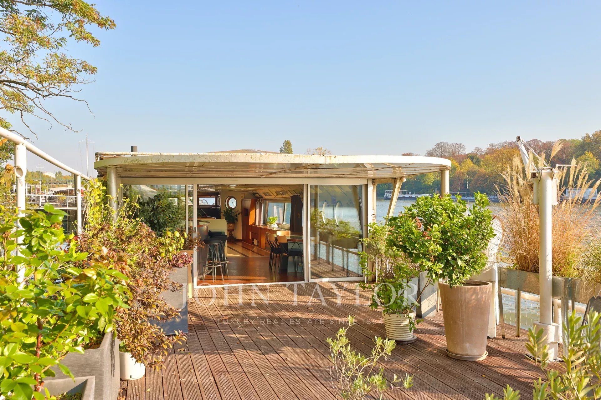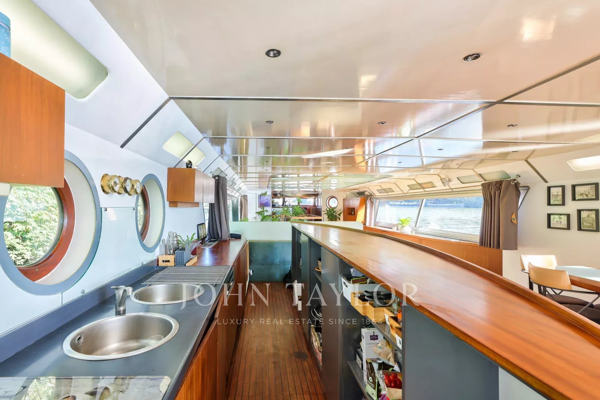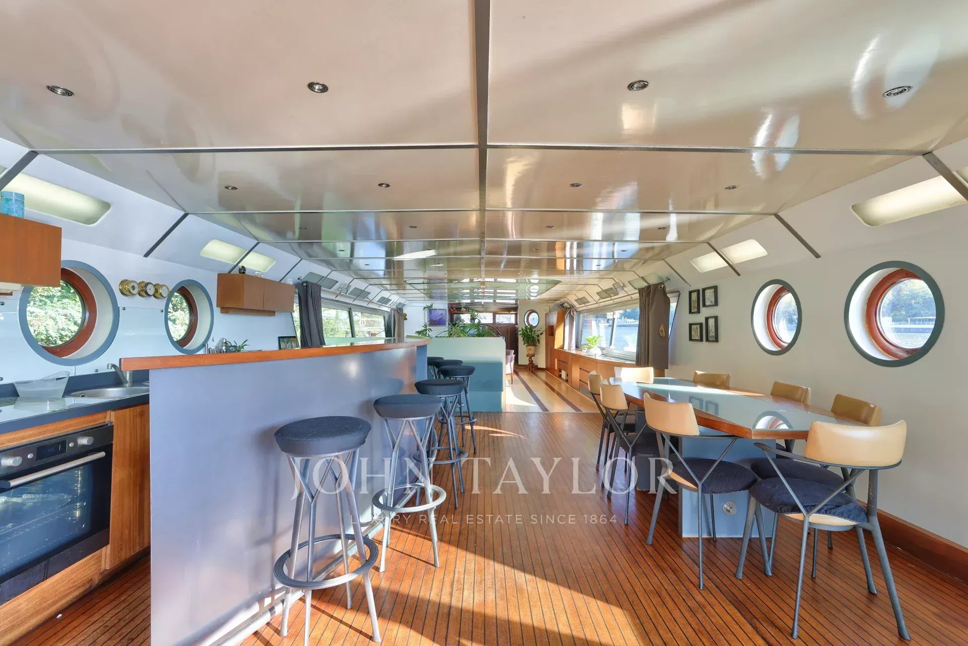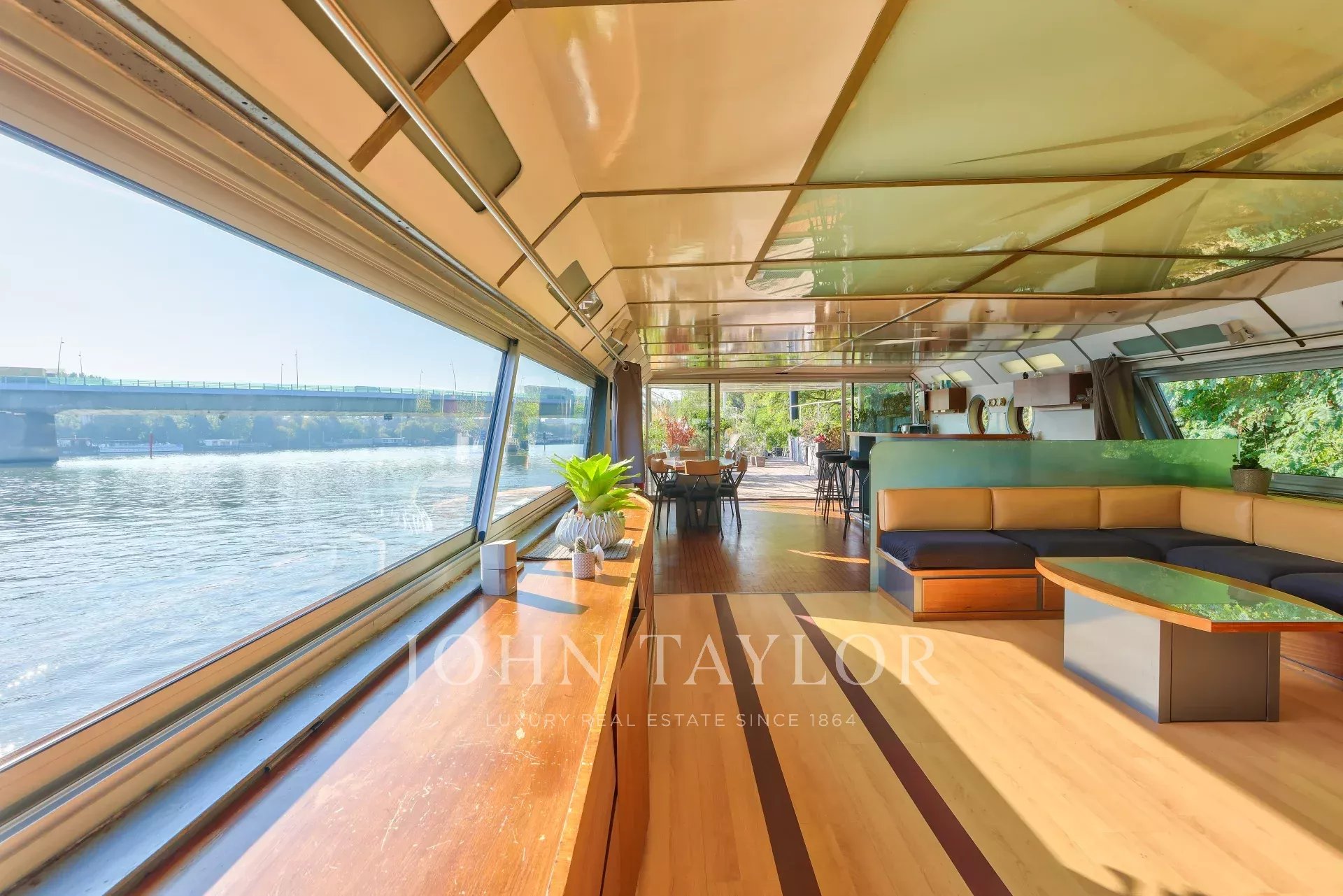 Moored in a peaceful setting close to shops, market and transport, this barge with approx. 196 m² of living space over two levels boasts generous volumes, plenty of light and a large 60 m² terrace.