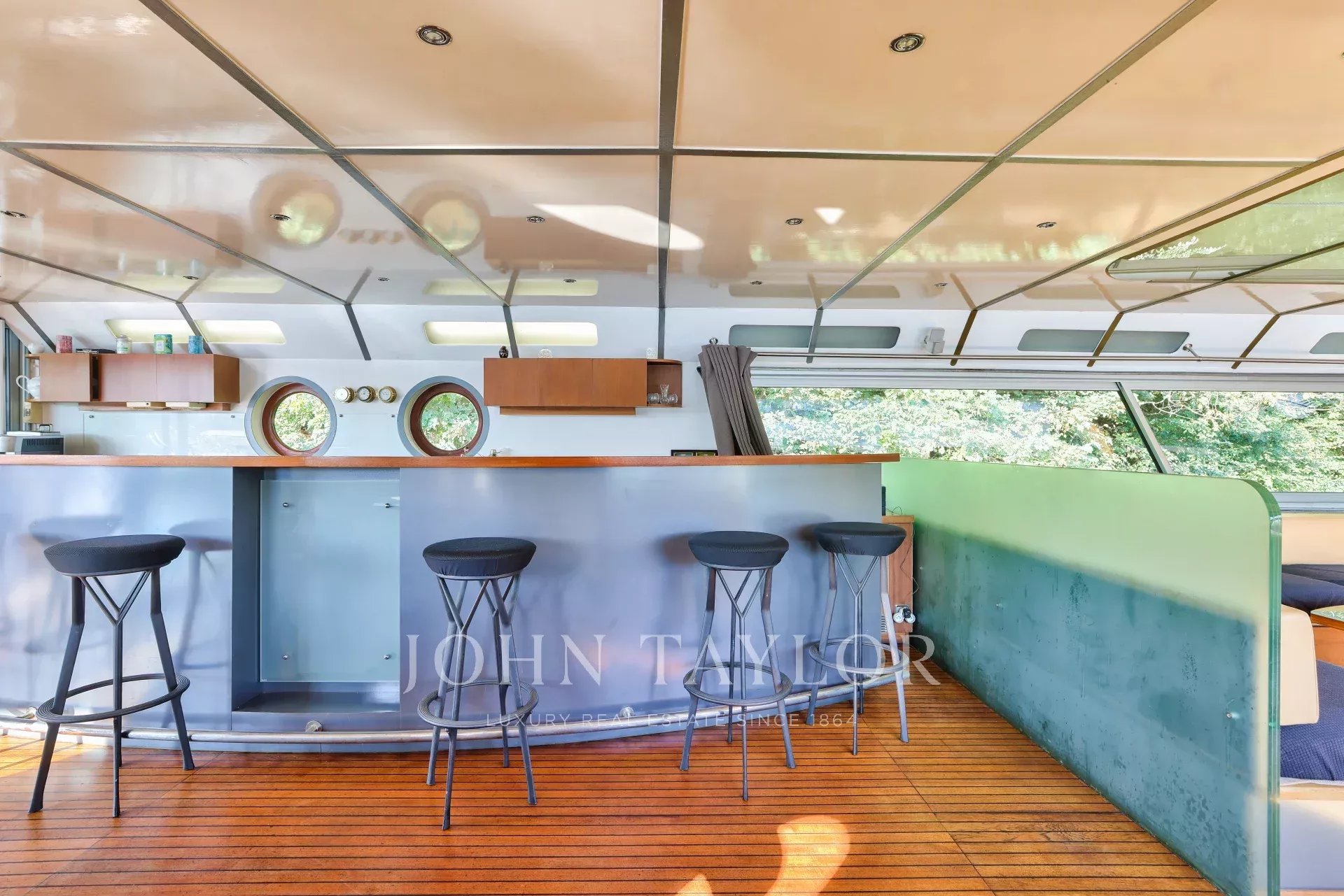 Access is via the upper deck, bathed in light thanks to large bay windows. Here you'll discover :