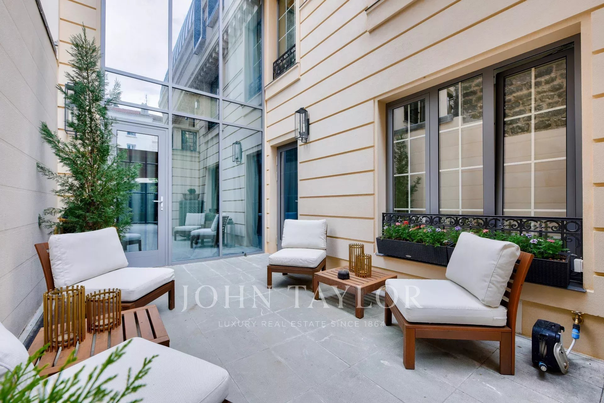 A vast 85 m² reception room opens onto a 43 m² paved courtyard, accessible via an automatic gate, allowing discreet vehicle parking.