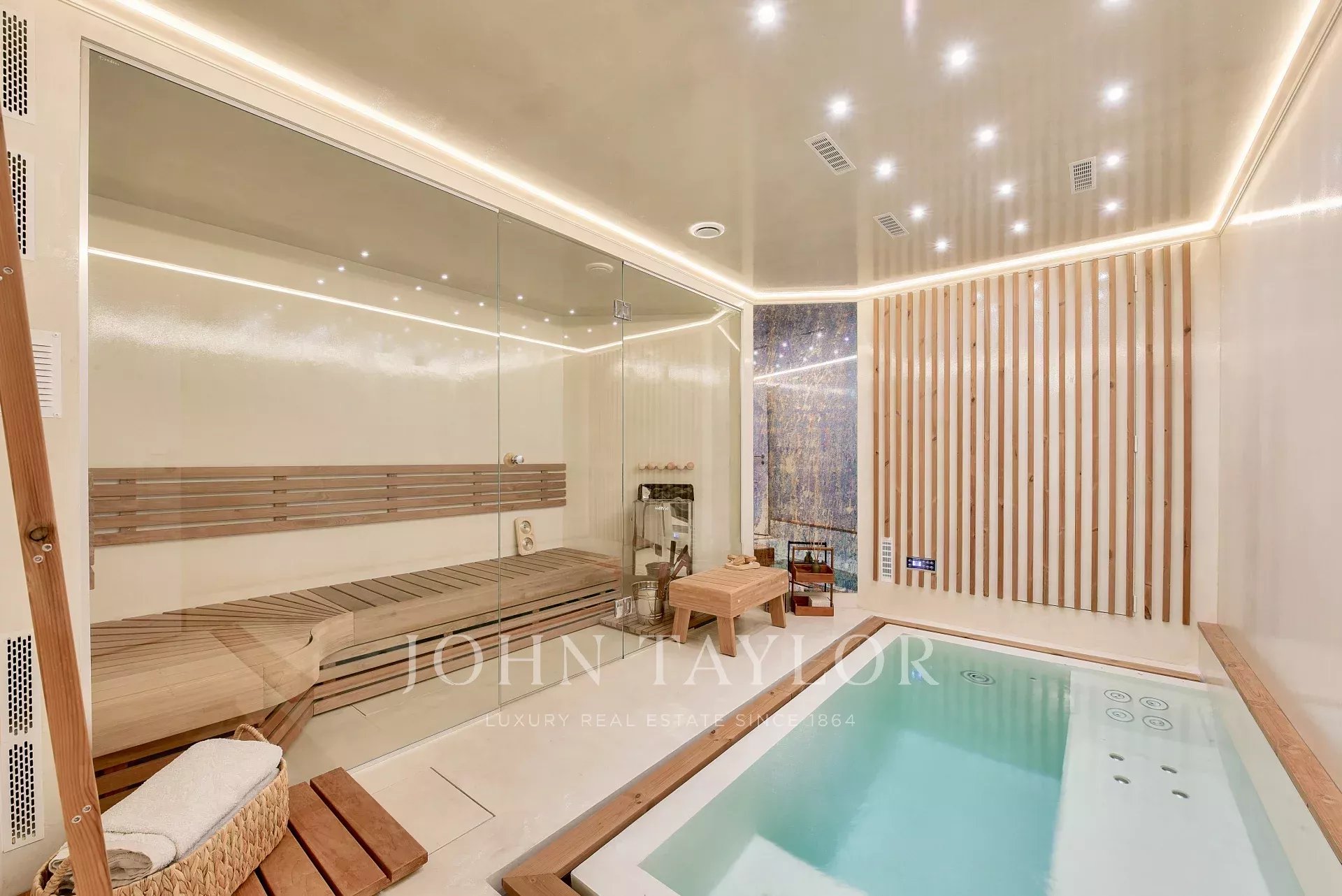 Wellness areas dedicated to relaxation with sauna and spa, a gym, and a separate shower room with toilet.
