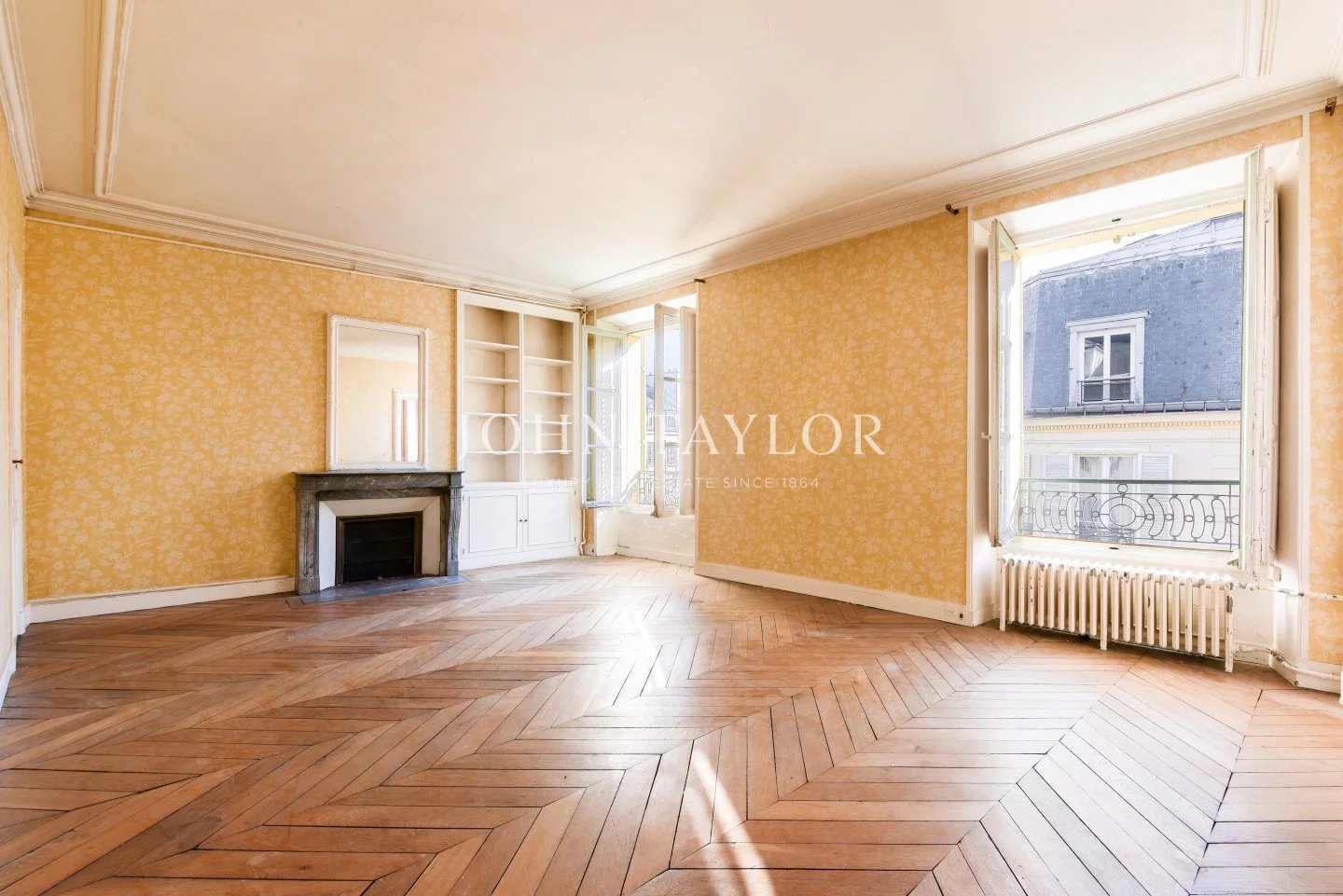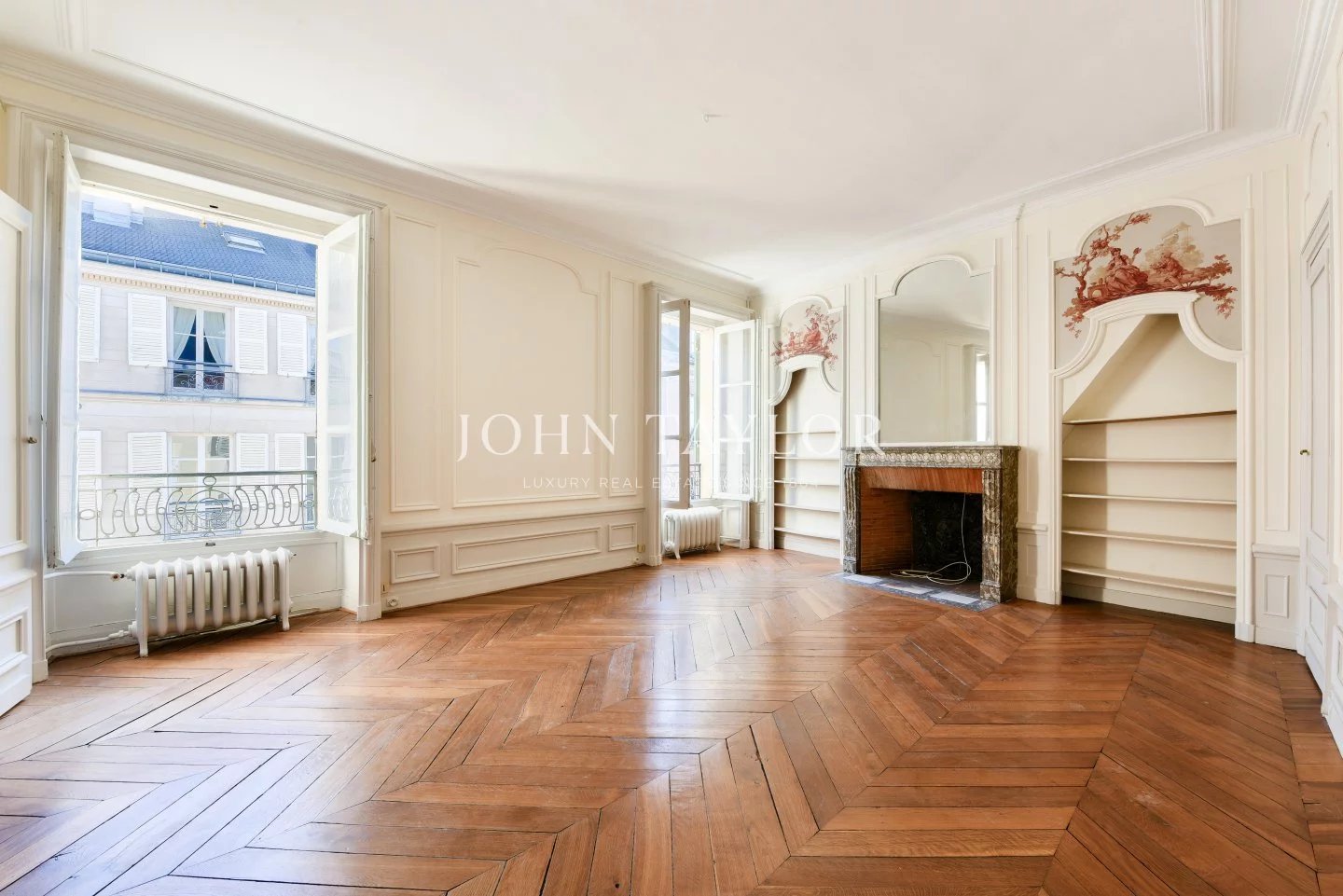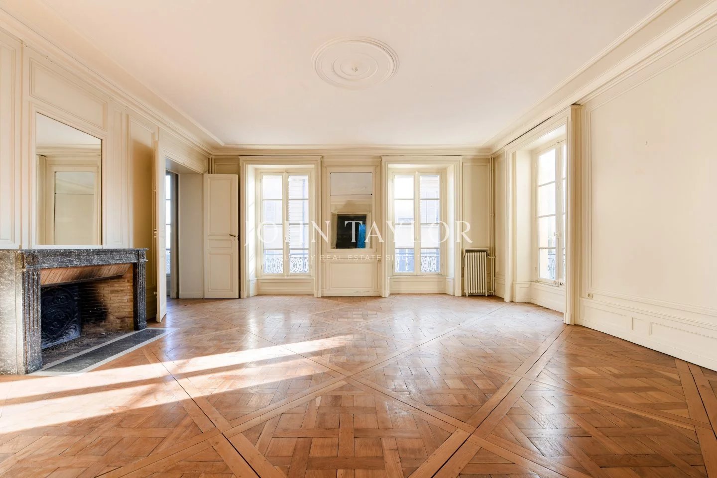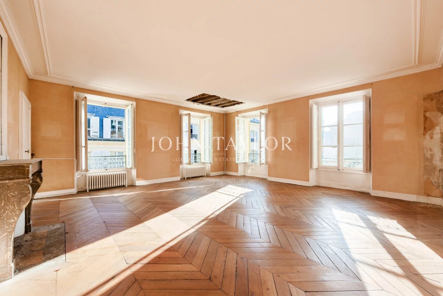 The apartments benefit from high ceilings, uninterrupted light thanks to east-west exposure, and Hausman-style features (solid parquet flooring, moldings, fireplaces).