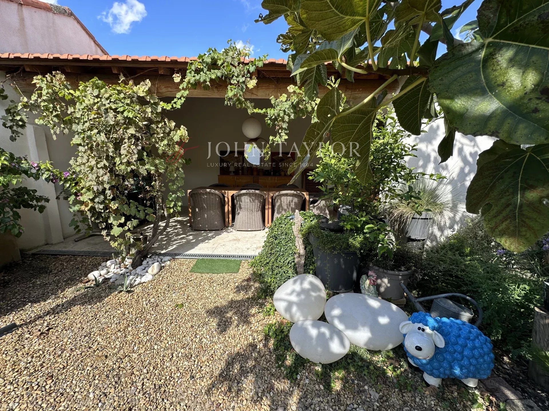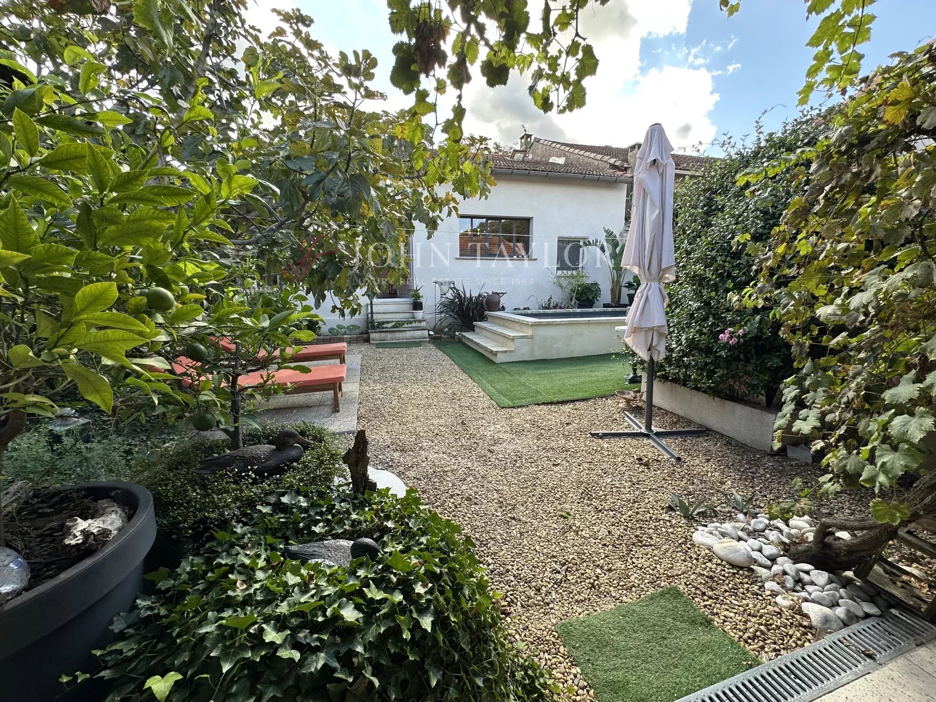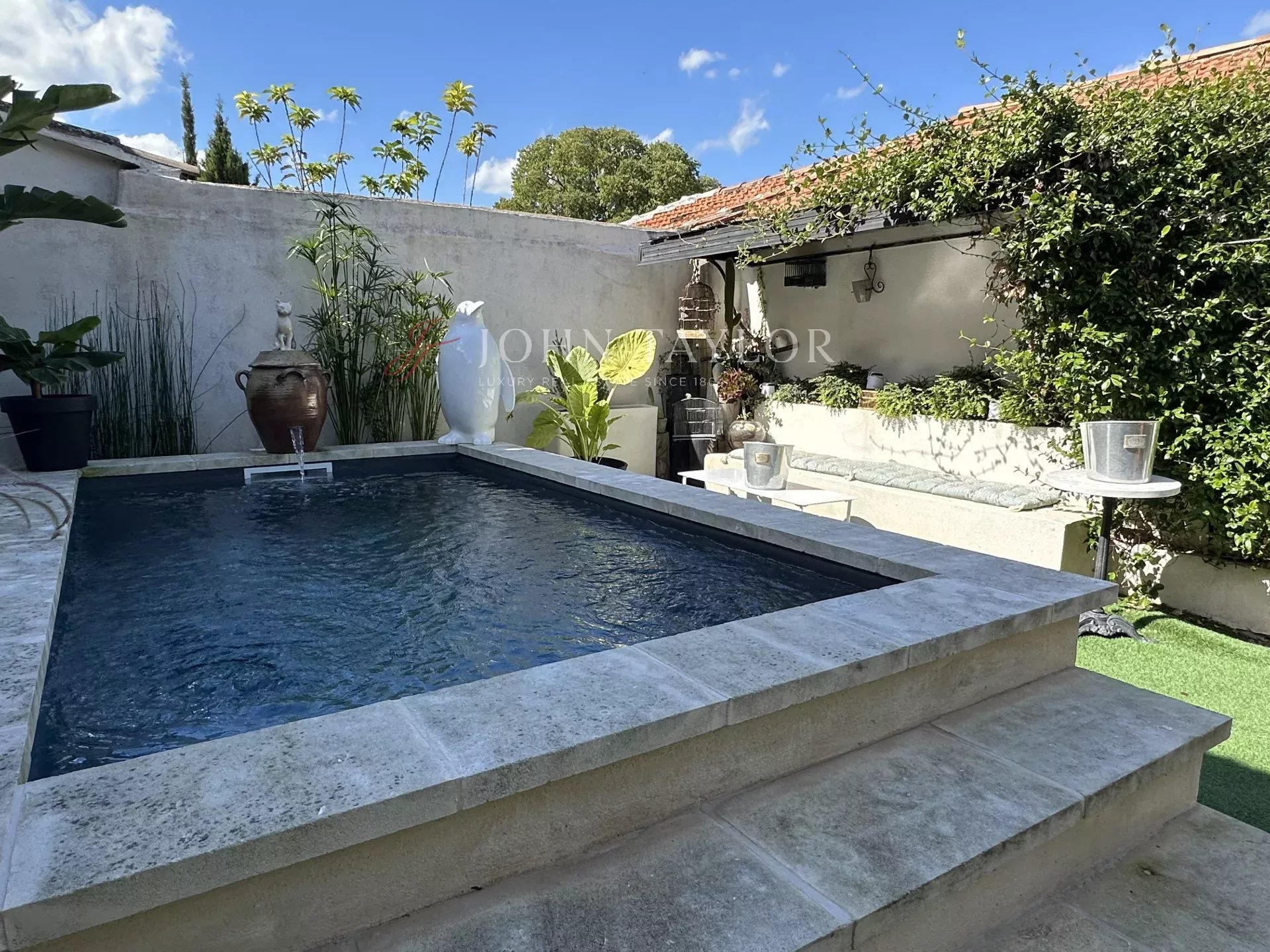 Outdoors, a secluded walled garden offers a haven of peace. The private pool and covered terrace invite you to enjoy sunny days and the gentle atmosphere of summer evenings.