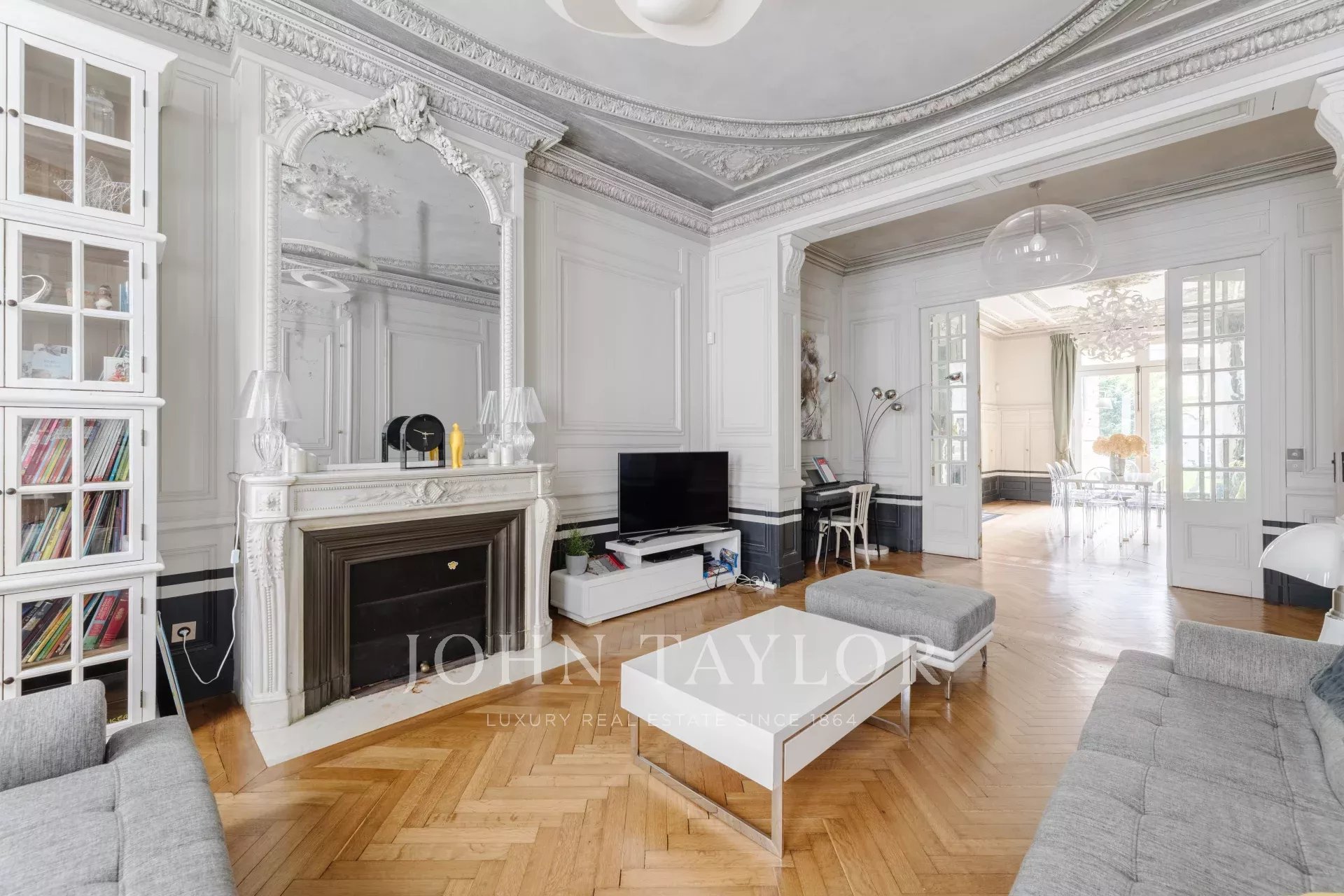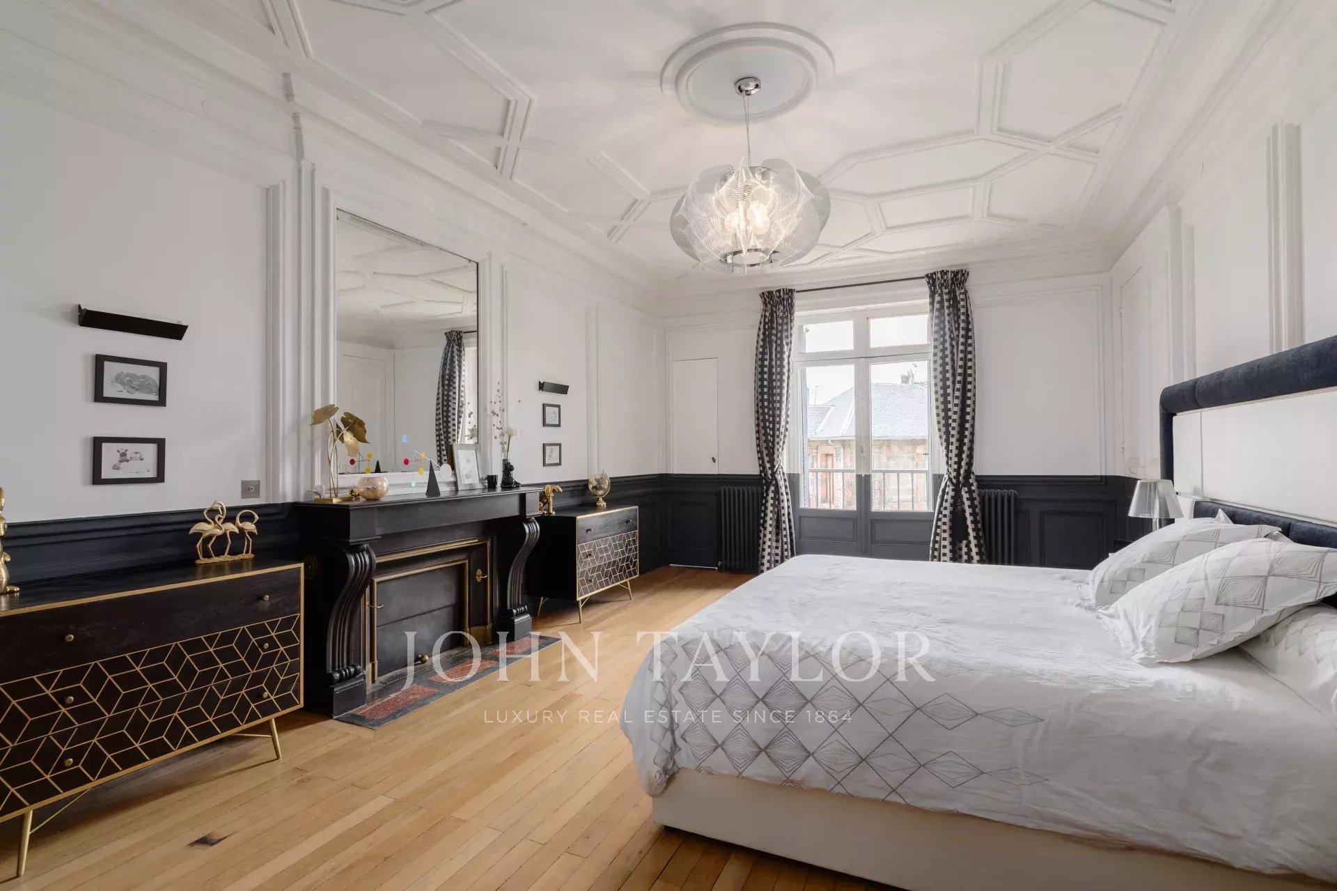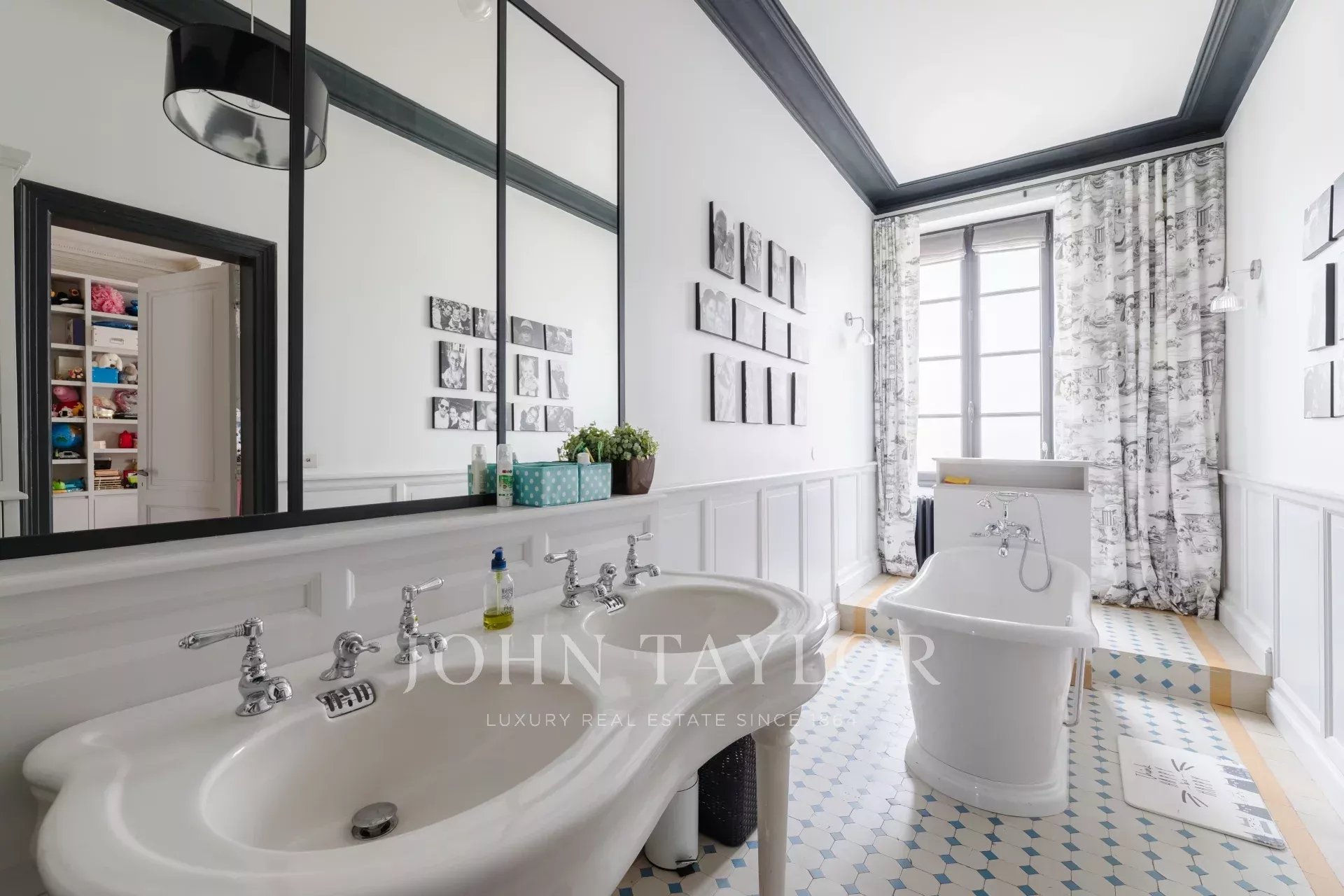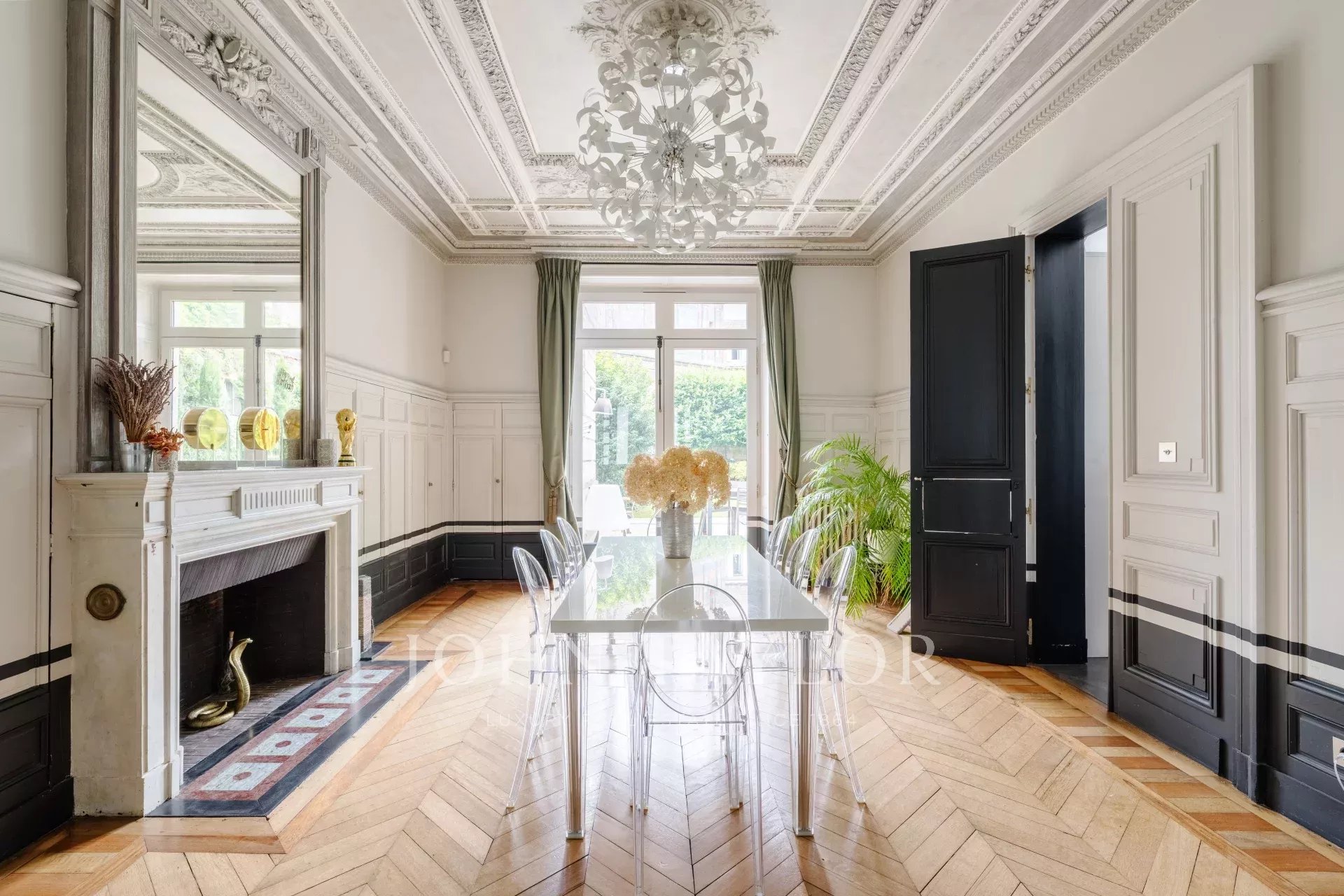 On the ground floor, you'll find a majestic entrance hall leading to a living room with remarkable moldings, parquet flooring and fireplaces, an open-plan dining room and a spacious, fully-equipped kitchen with meticulous finishing touches.
