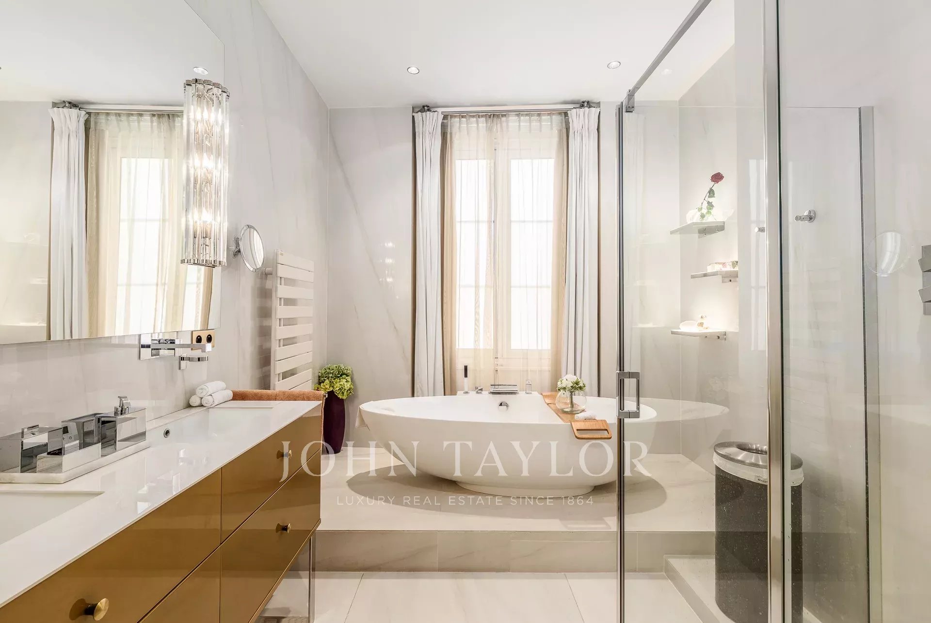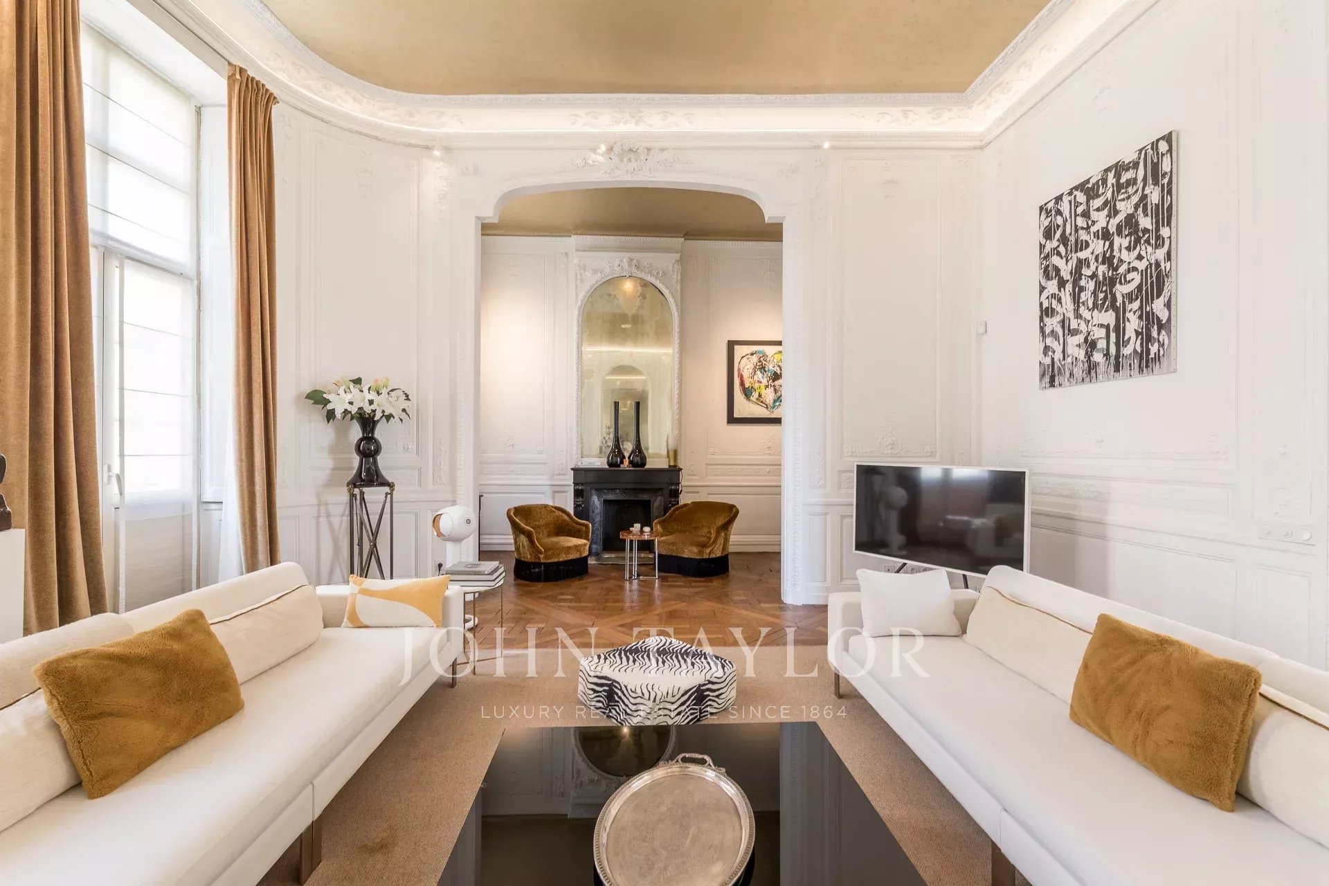 The upper floor features sublime reception rooms, enhanced by refined woodwork, period parquet flooring and high ceilings. An elegant vestibule leads to a double living room, a dining room opening onto a sun-drenched terrace, and a separate kitchen.