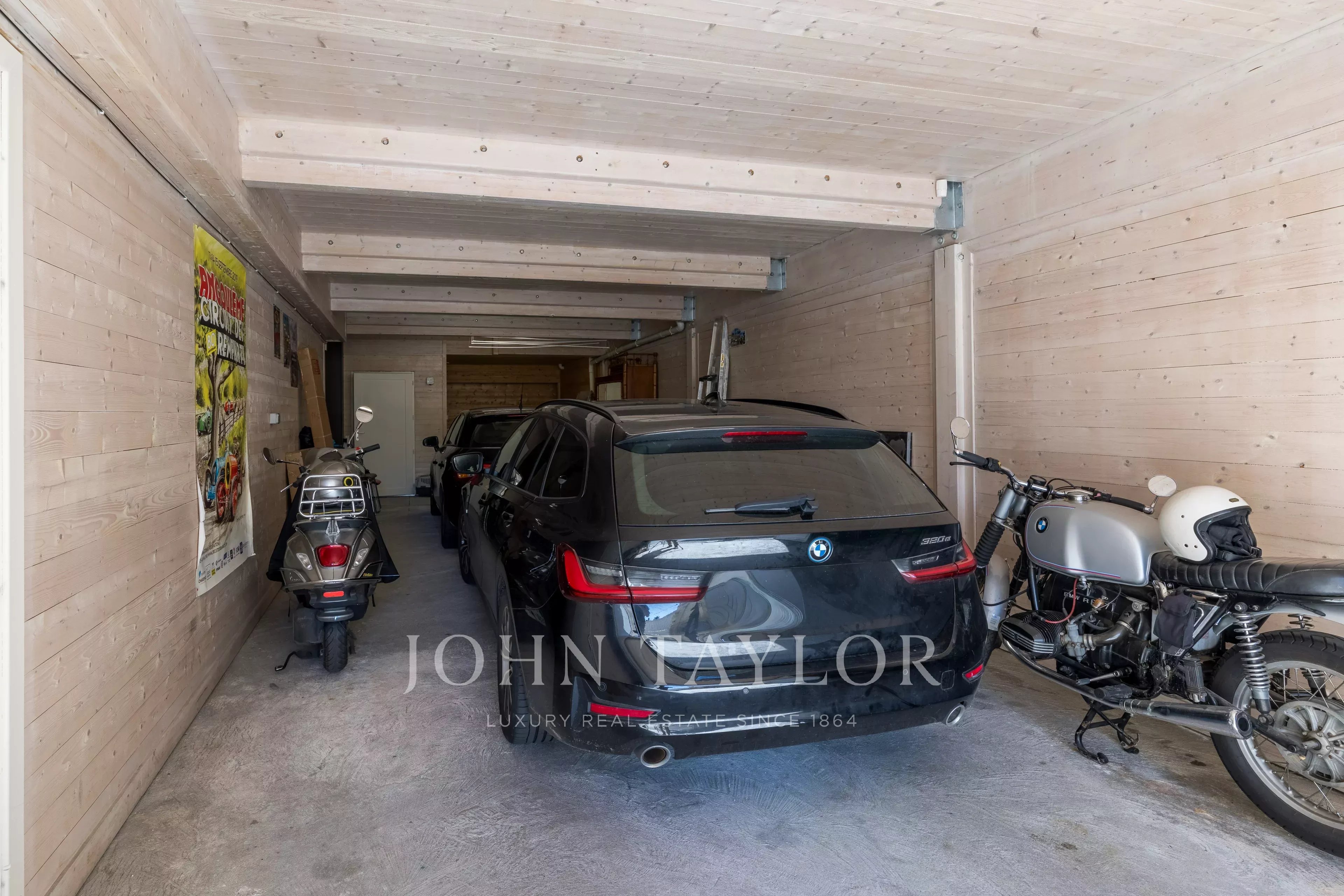 To the right, a truly exceptional feature: an extra-large garage accommodating up to four vehicles, complemented by a black room offering outstanding potential for a private home cinema, leisure space or creative studio.