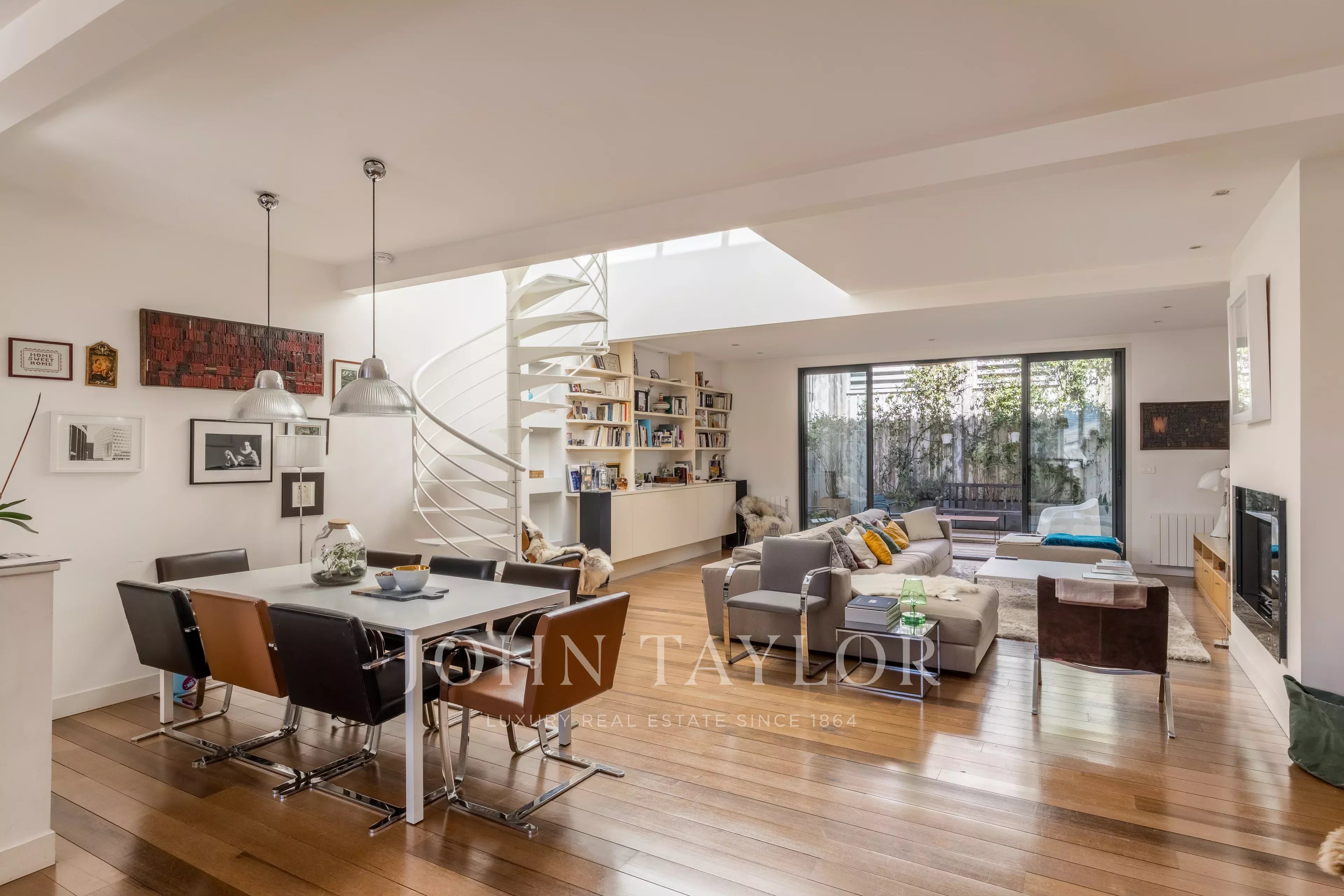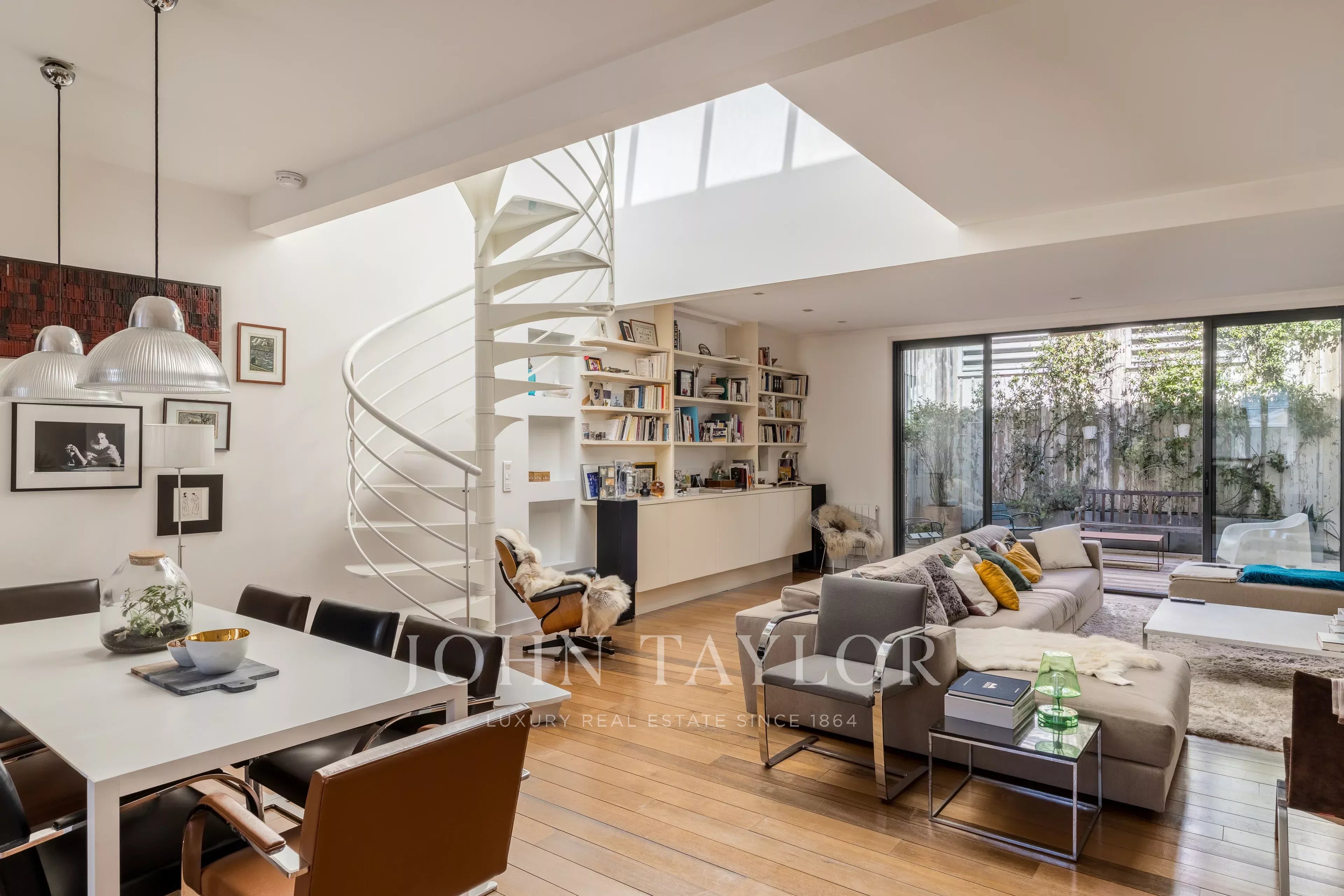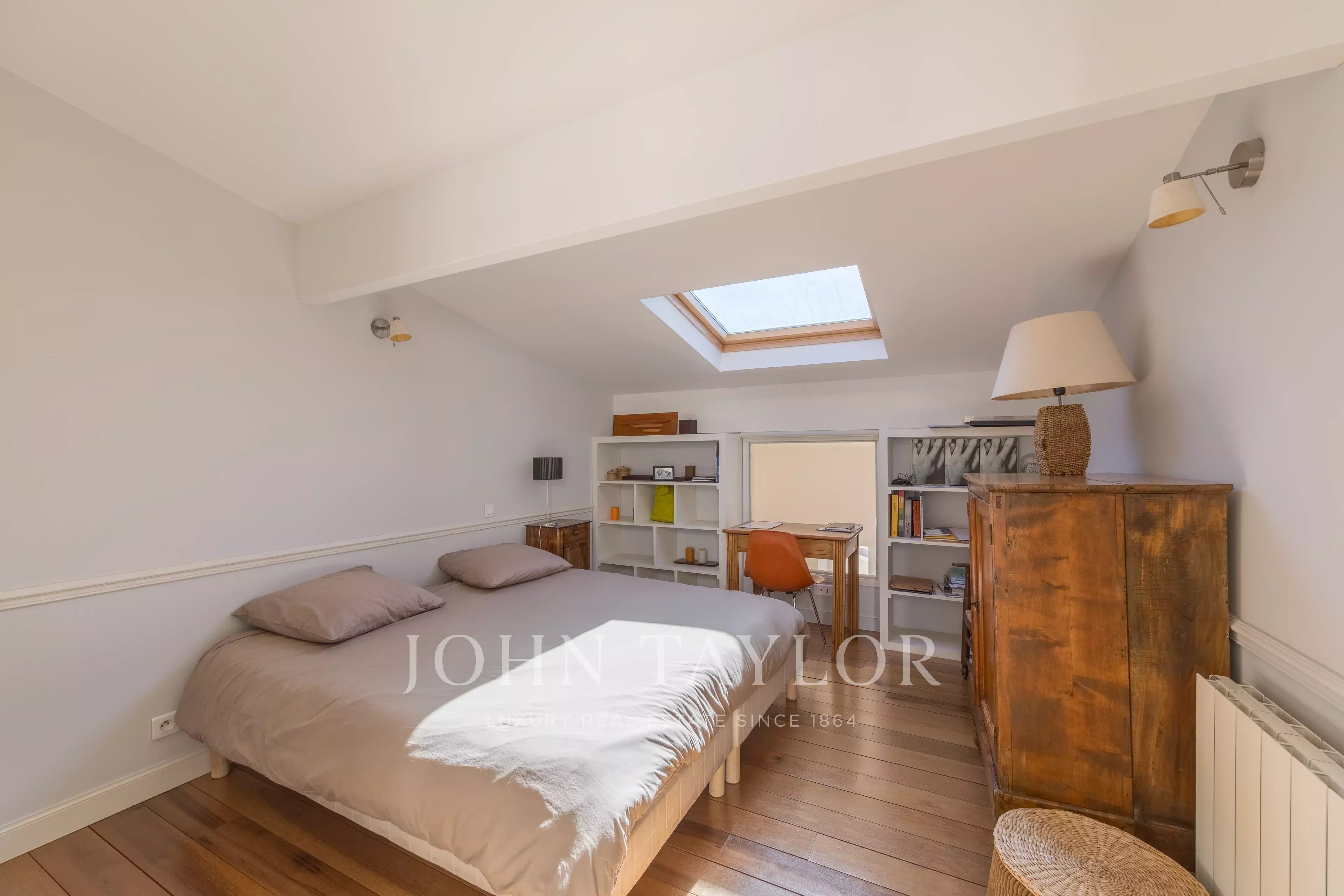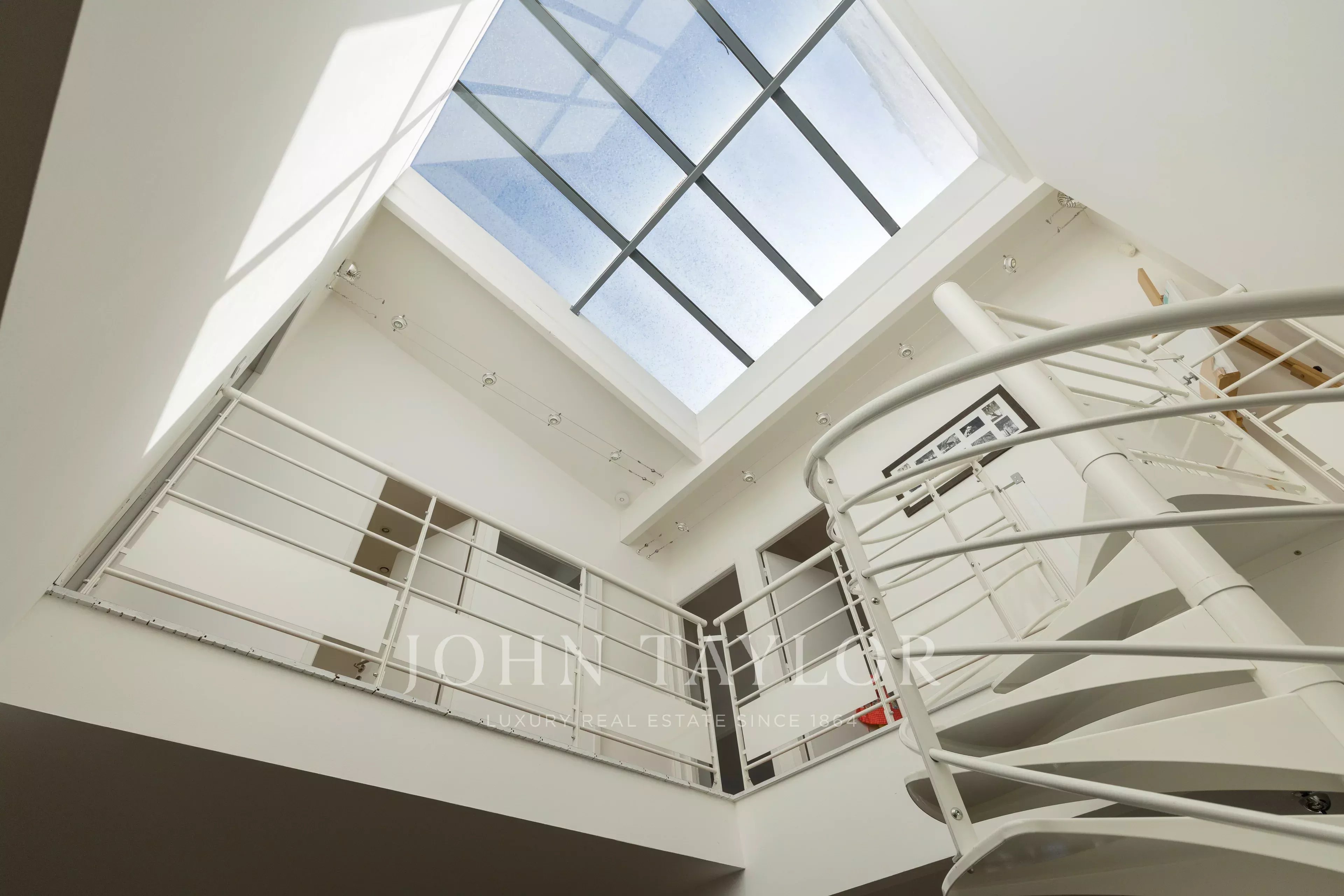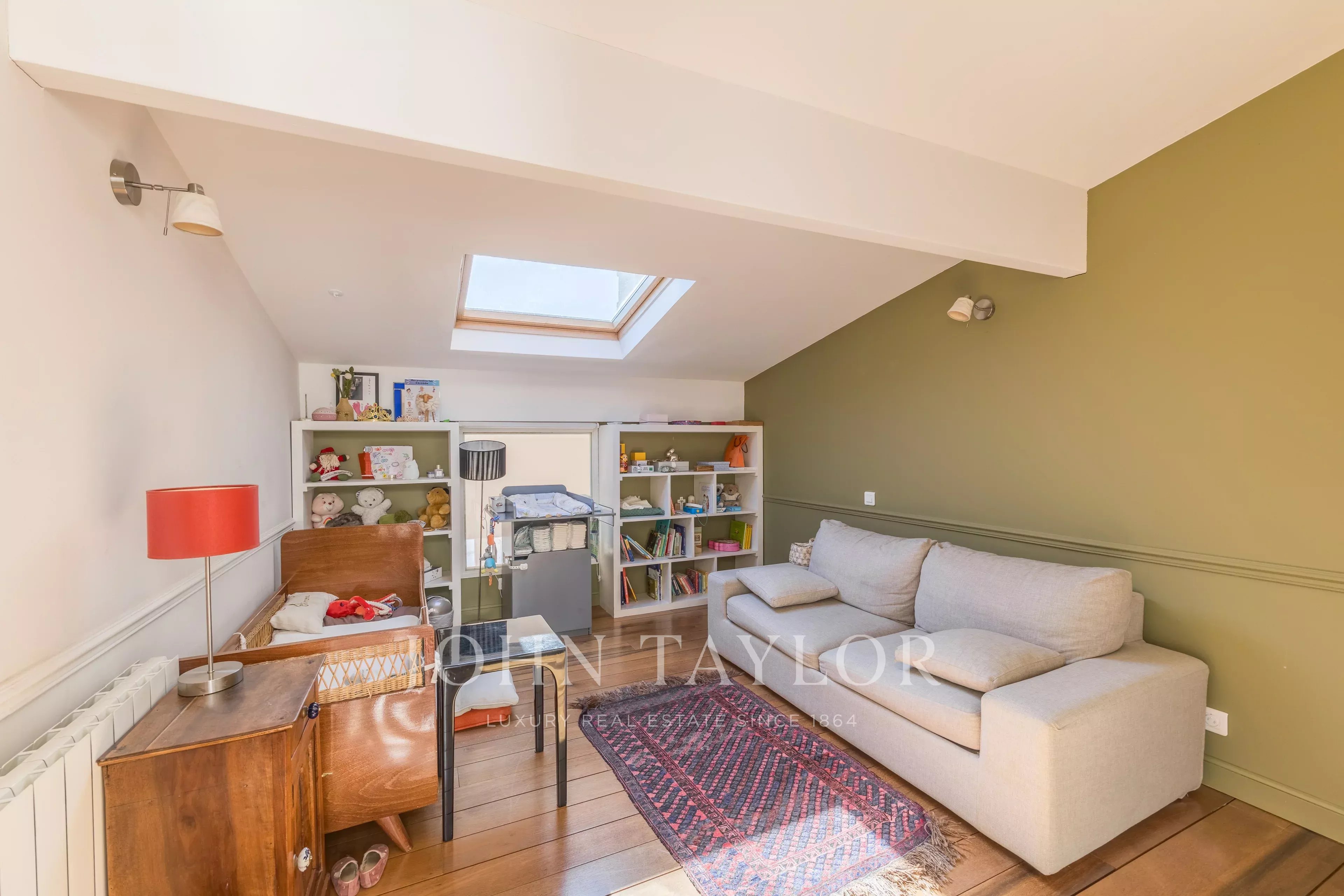 The top floor benefits from a skylight, bringing additional natural light into the living areas. It comprises two bedrooms, a bathroom and separate toilets, as well as a master suite with its own shower room and dressing room.
