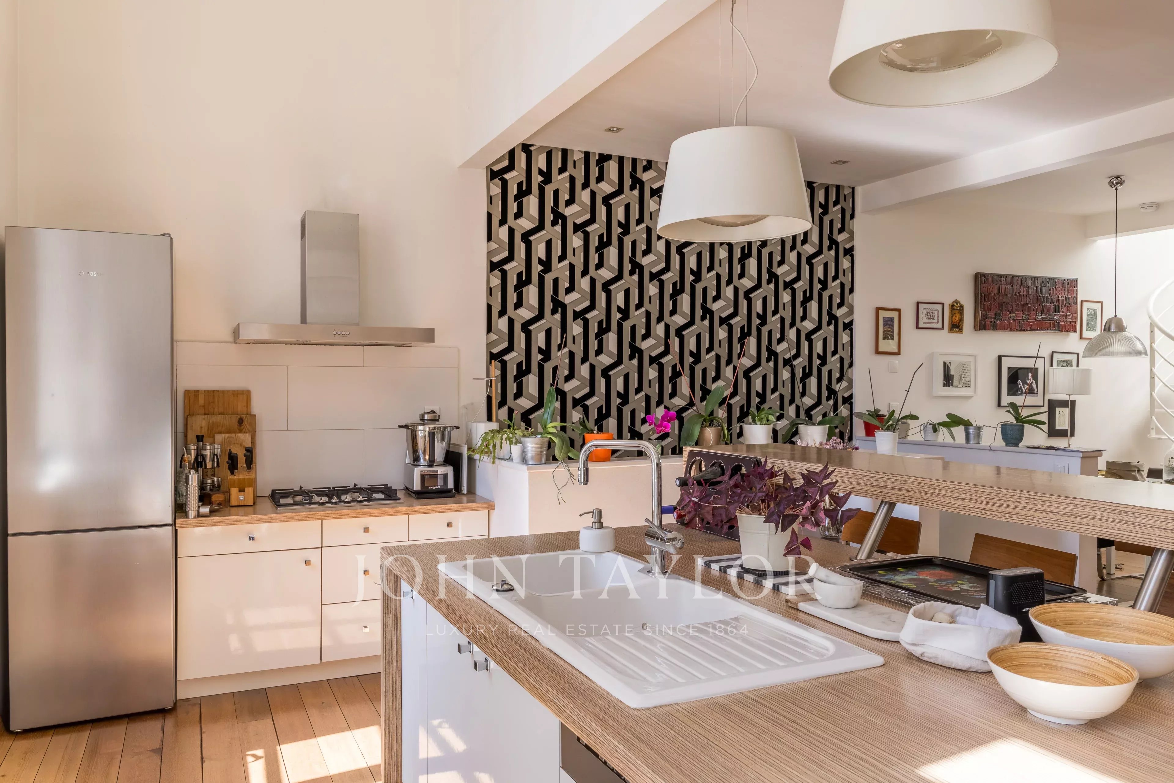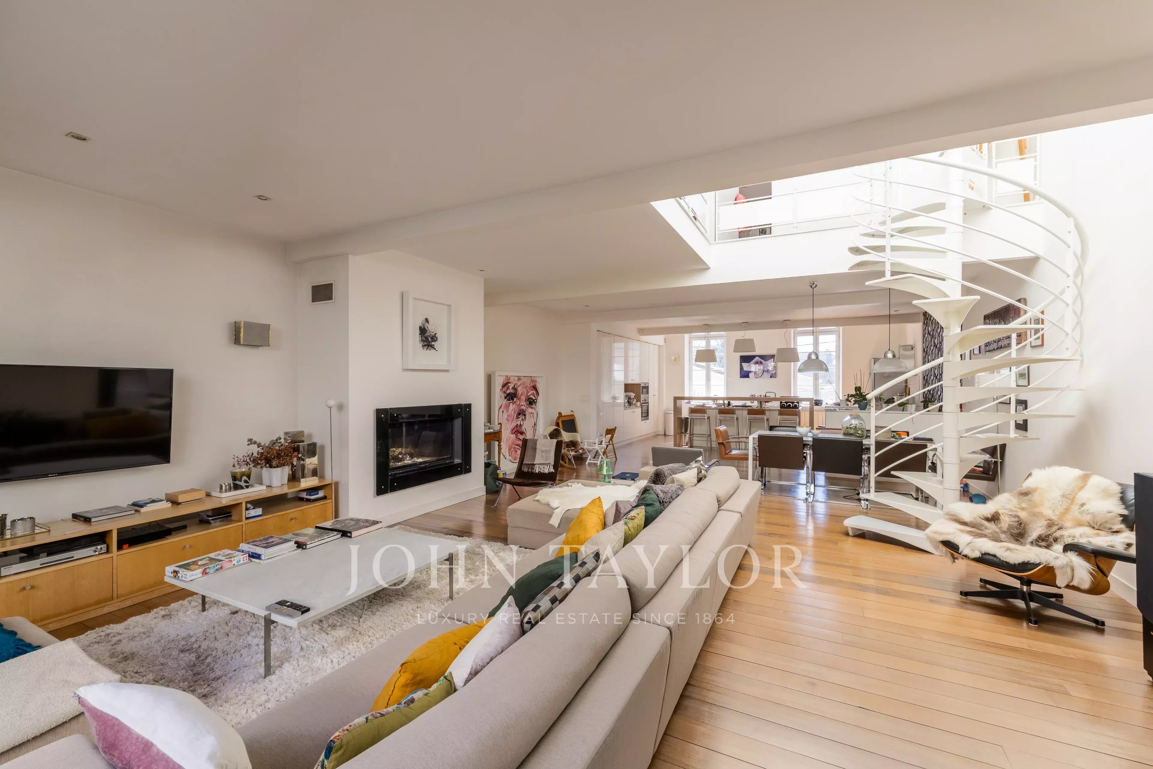 The first floor reveals a magnificent 85 sqm reception area, flooded with natural light thanks to its dual exposure. This luxurious open-plan living space features impressive ceiling height, solid exotic hardwood flooring, a fireplace with insert, and a modern open kitchen.
