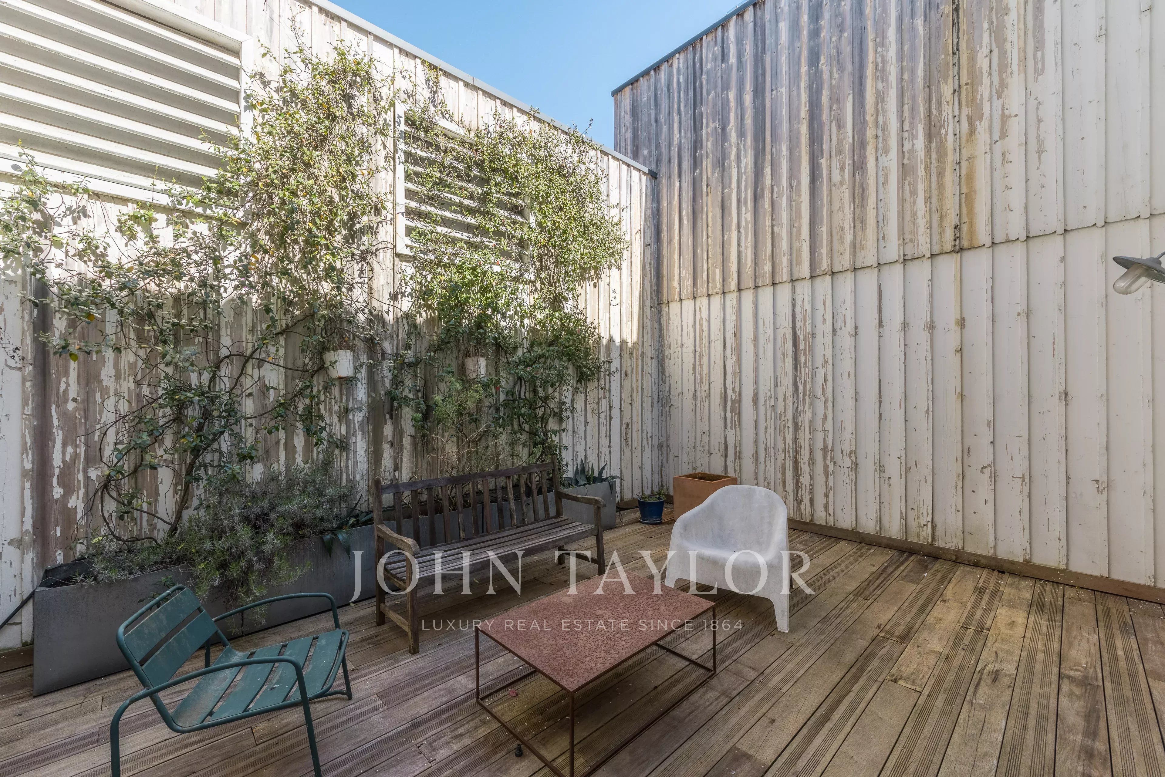 Large south-facing windows, with no overlooking, extend the living area, while to the north, a private patio terrace, also sheltered from view, provides an intimate outdoor retreat.