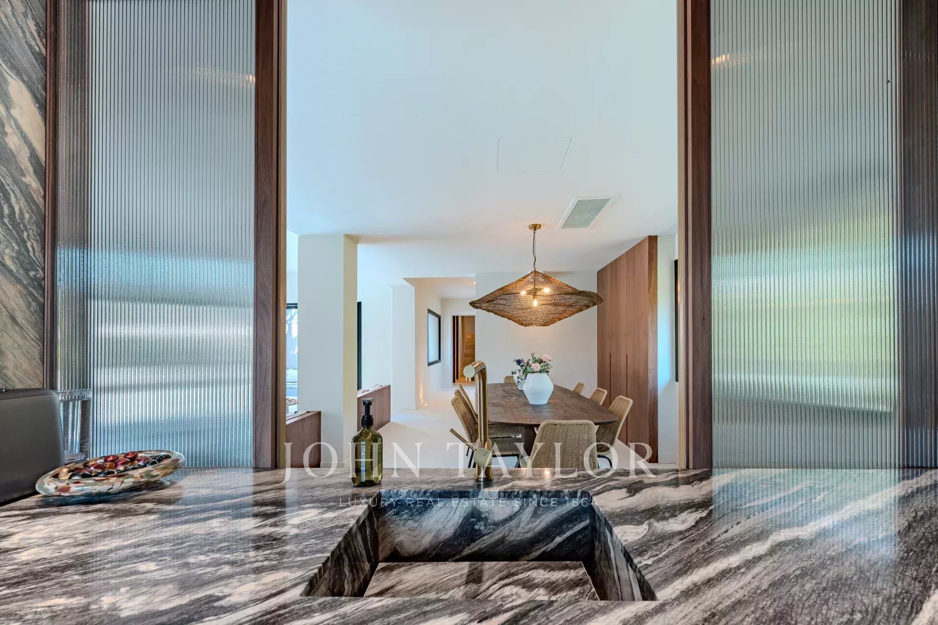 Elegant volumes open to the outdoors, a bright living room with a fireplace, a dining room, and a high-end equipped kitchen.