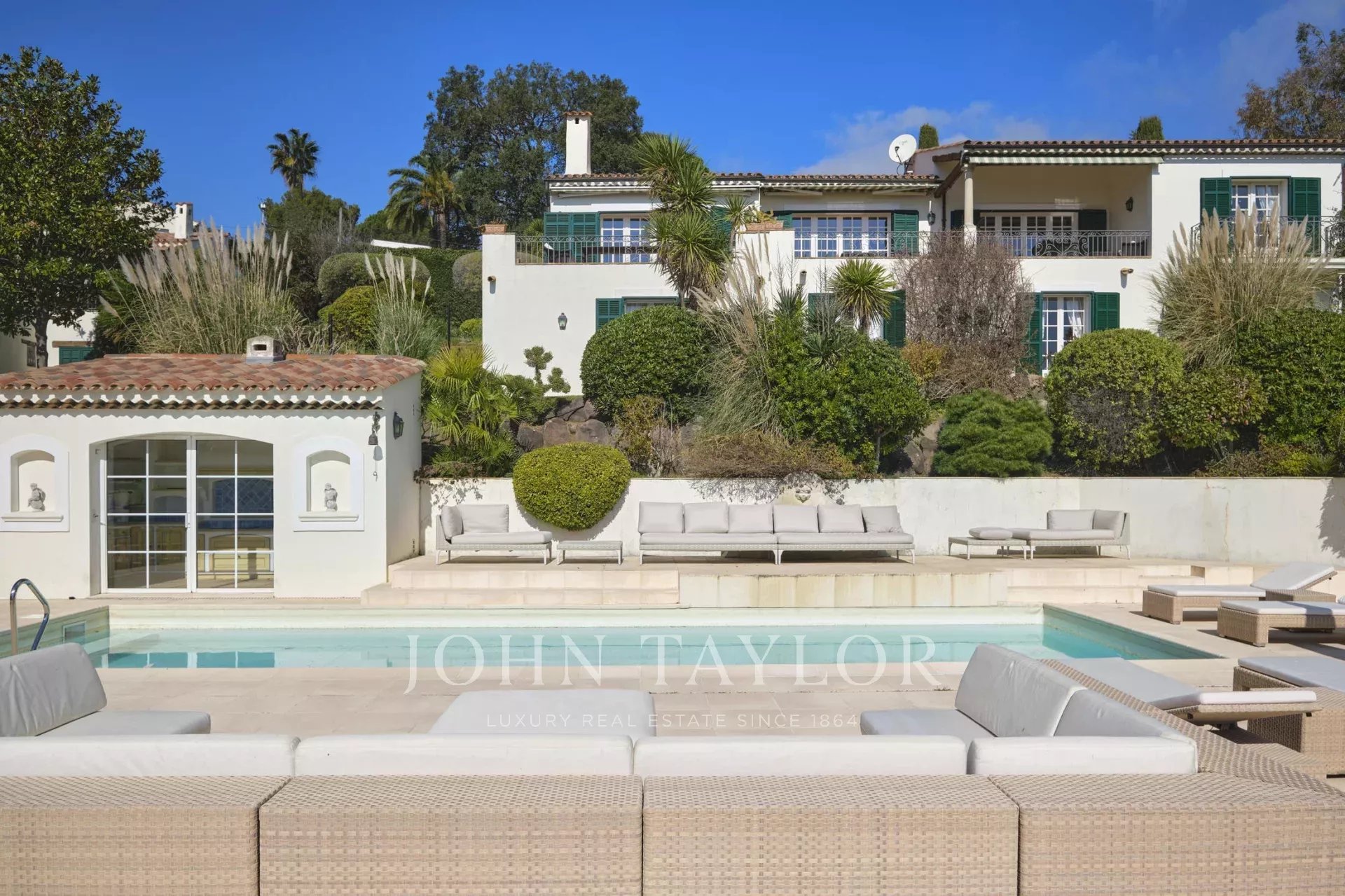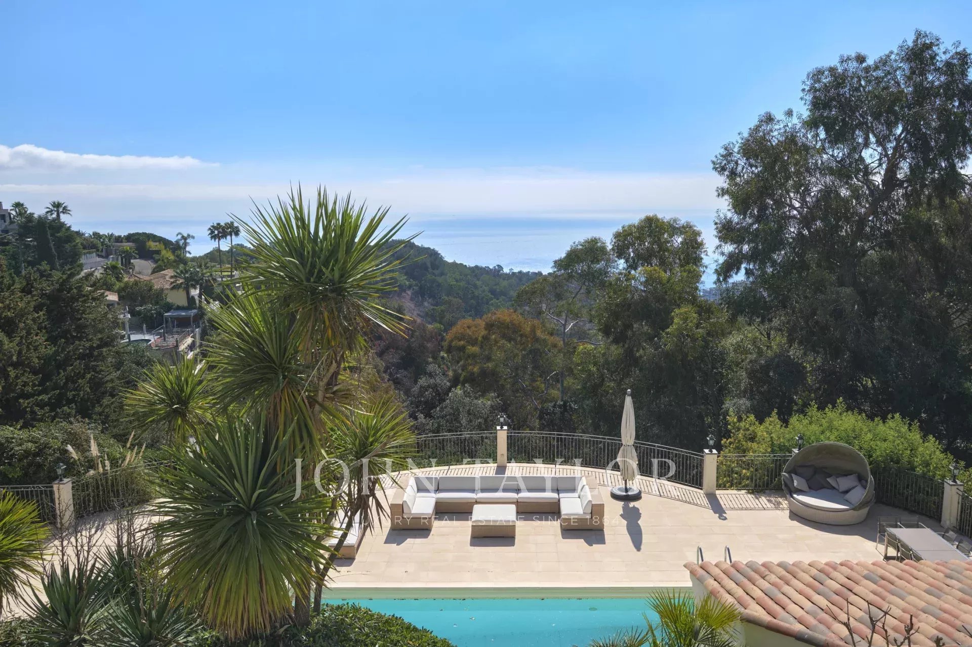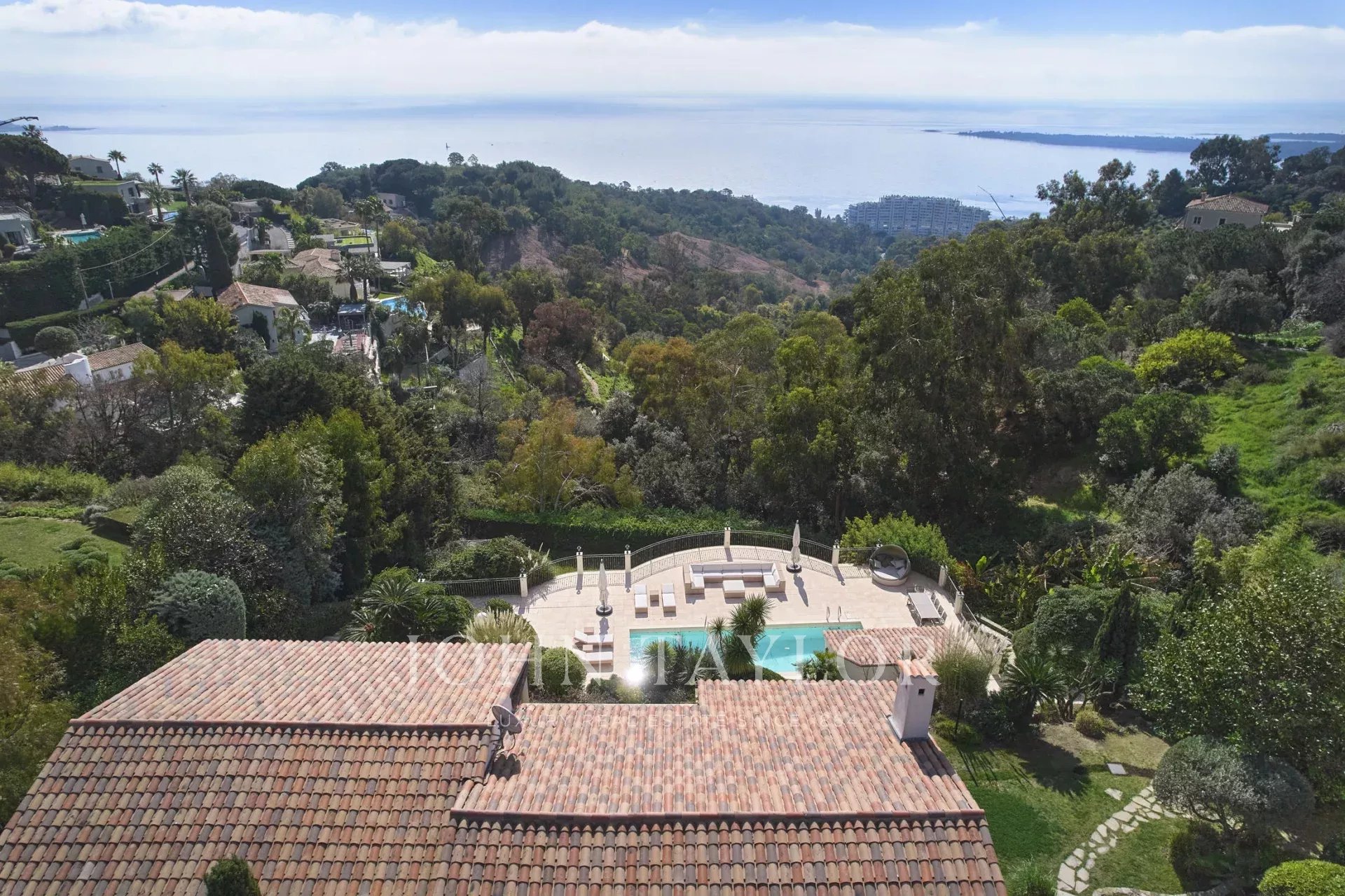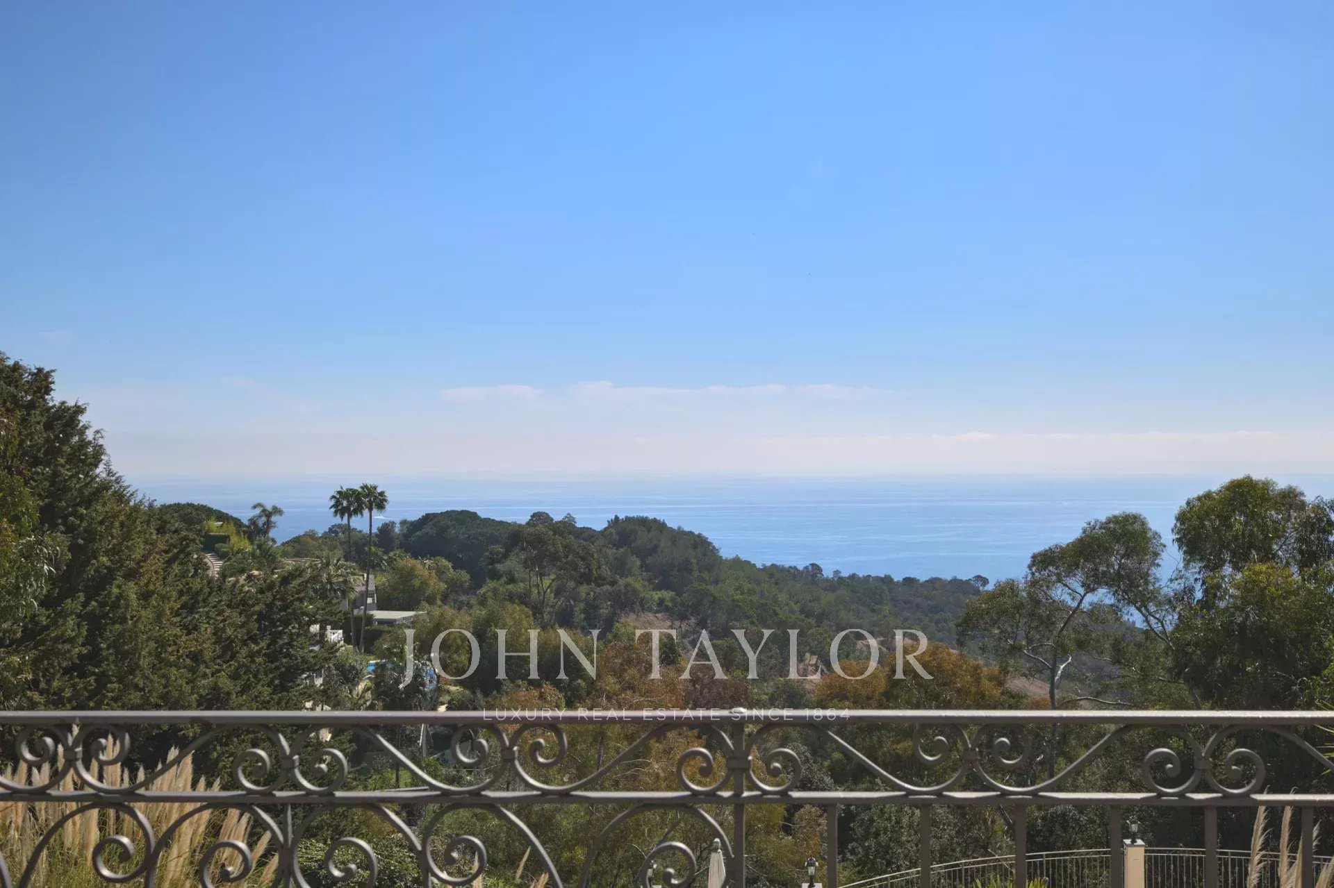 Magnificent property in absolute calm with a south exposure offering a panoramic sea view. Located in the sought-after neighborhood of Super Cannes just a few minutes by car from the center of Cannes and the Croisette.