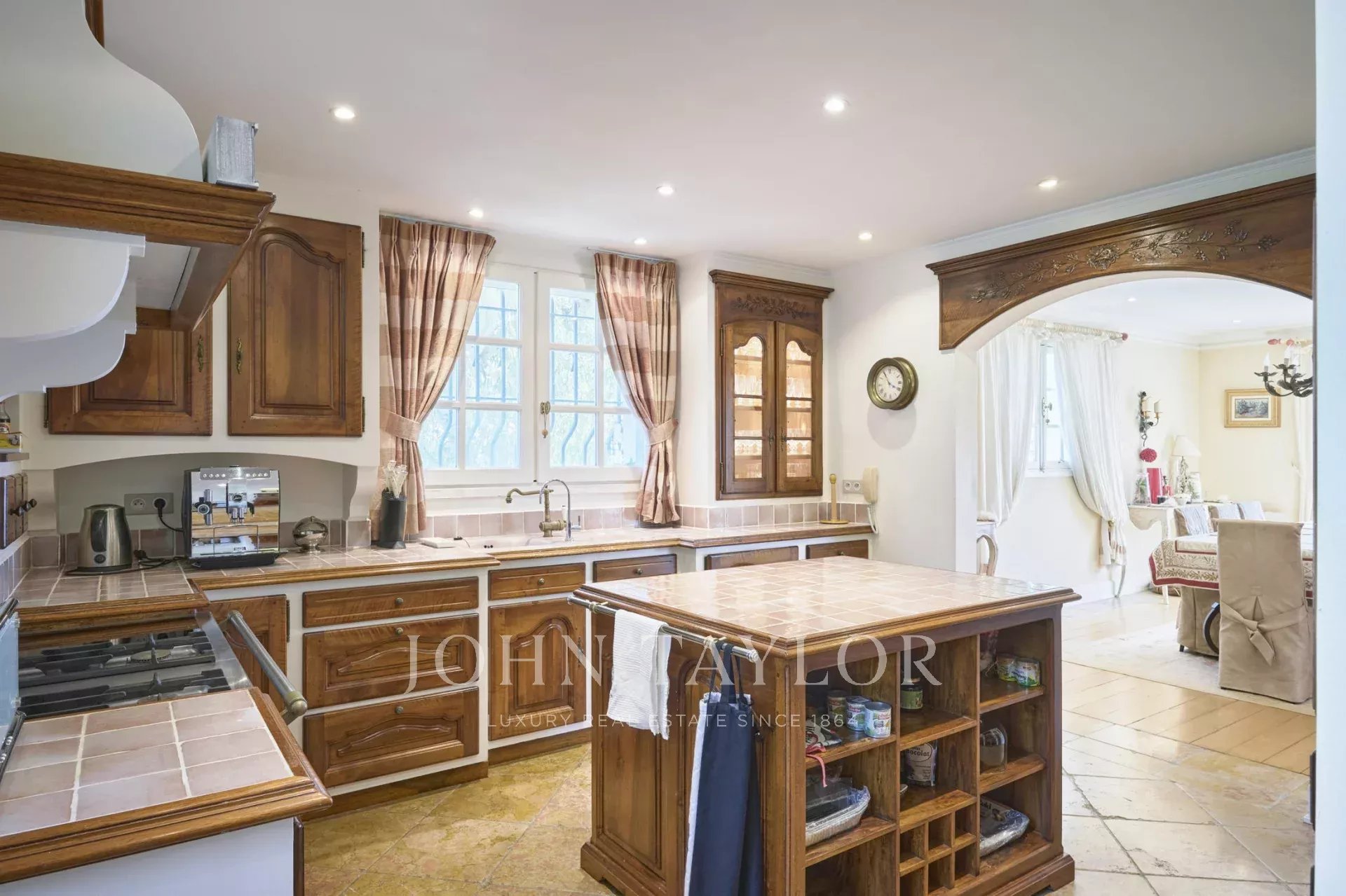 The main house is arranged over two levels with an internal elevator, it consists of an entrance hall, a double reception opening onto the terrace, a living room with fireplace, a dining room, a family kitchen, a laundry room, and a dressing room.