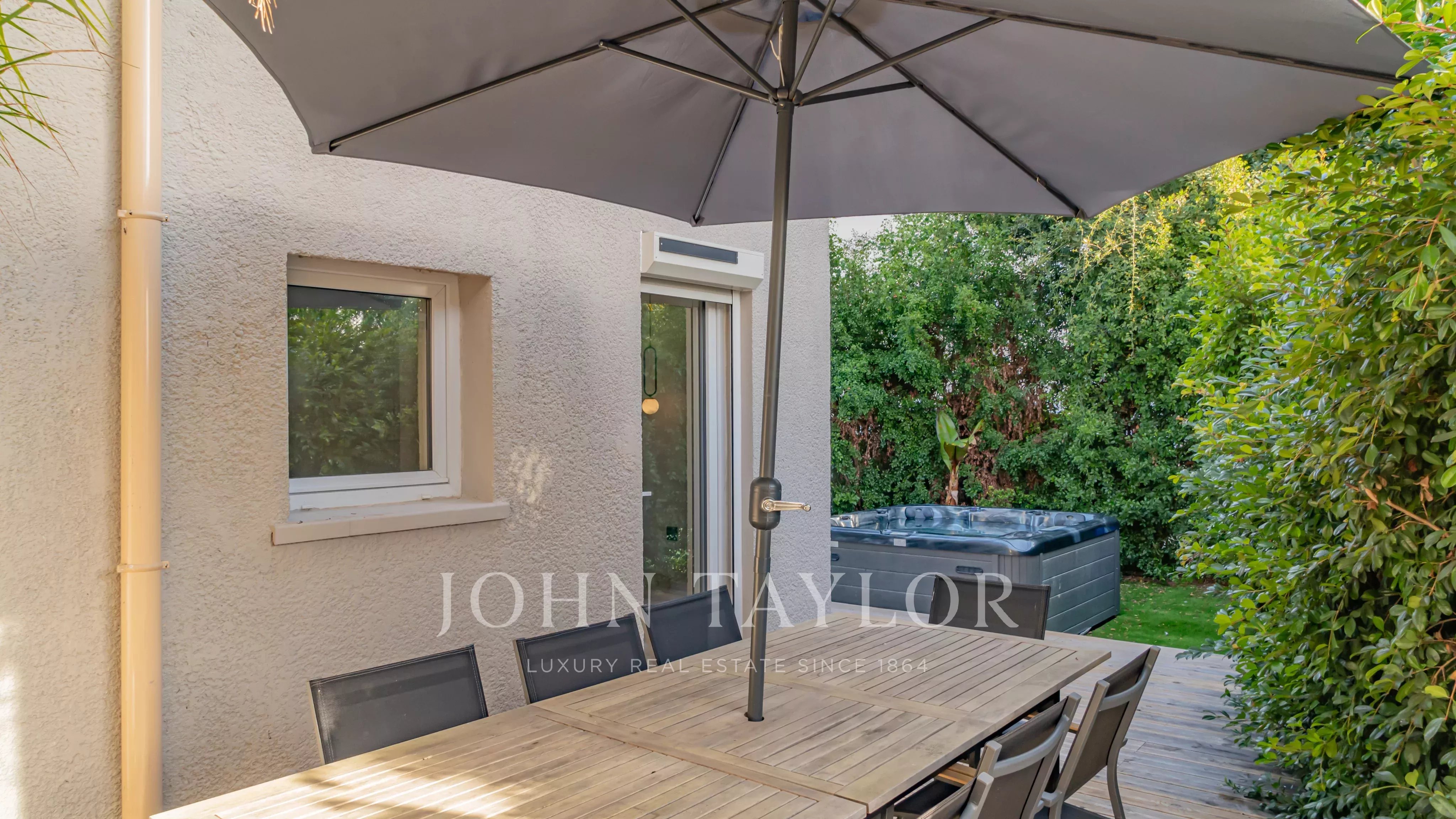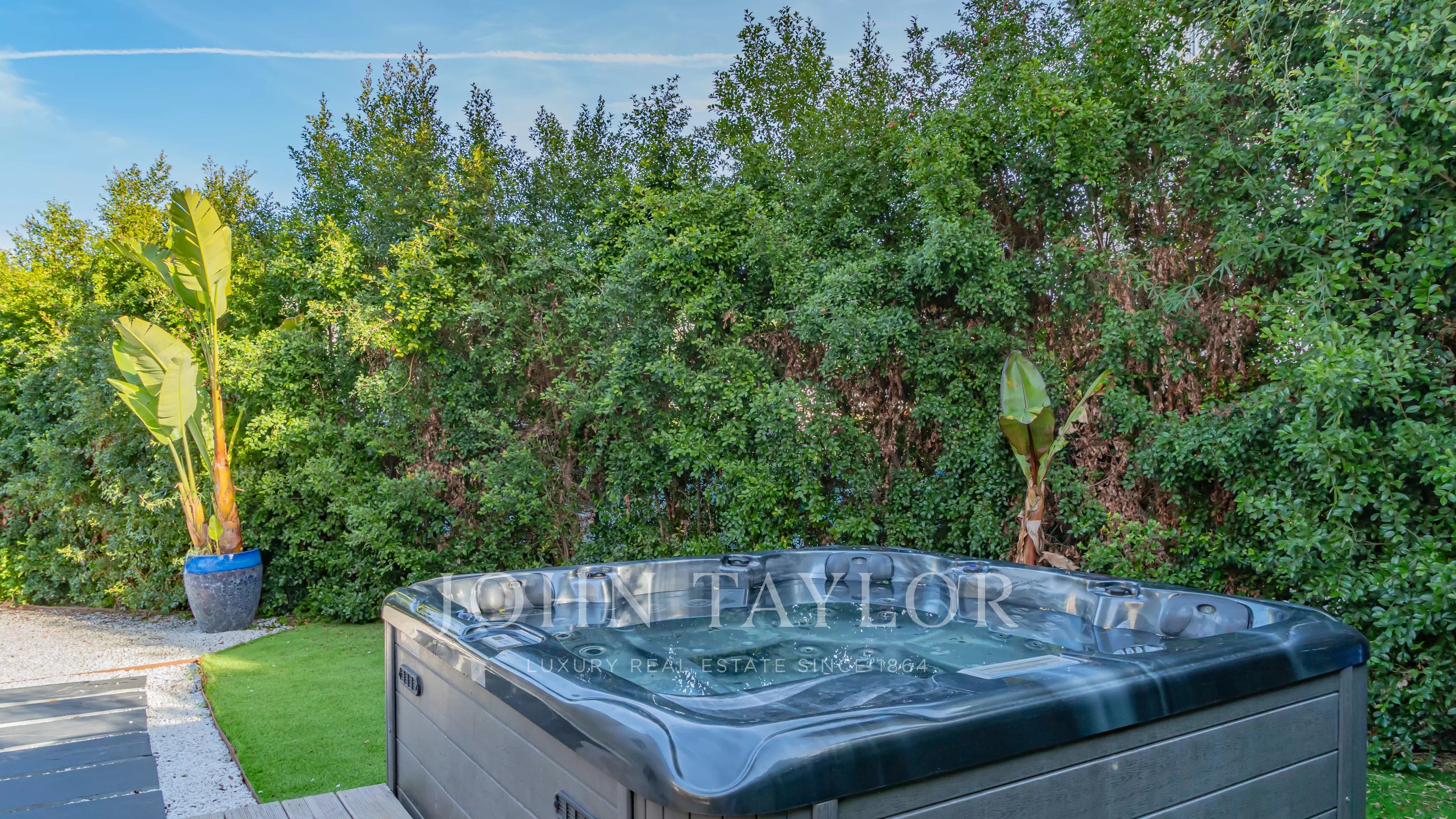 The villa is surrounded by a landscaped garden of approx. 205 m², including a jacuzzi, bowling green and parking spaces.