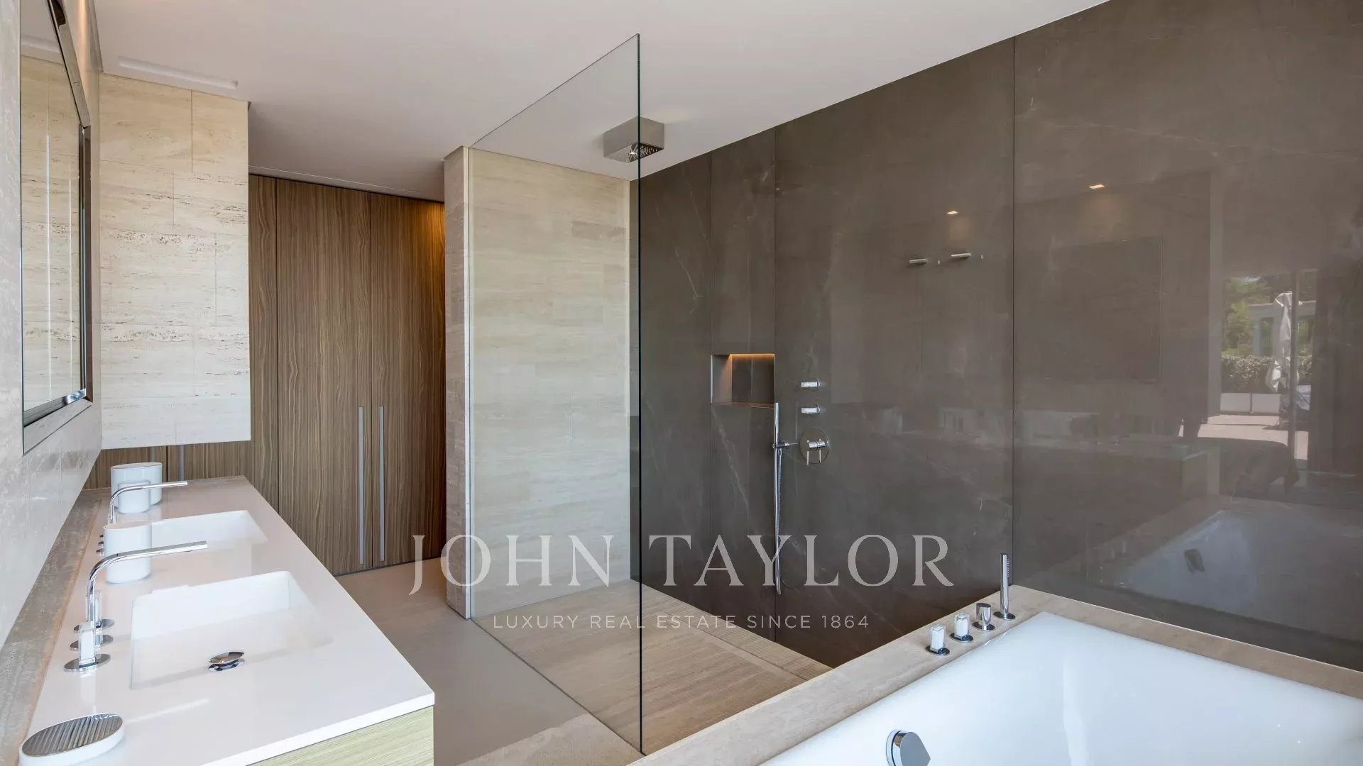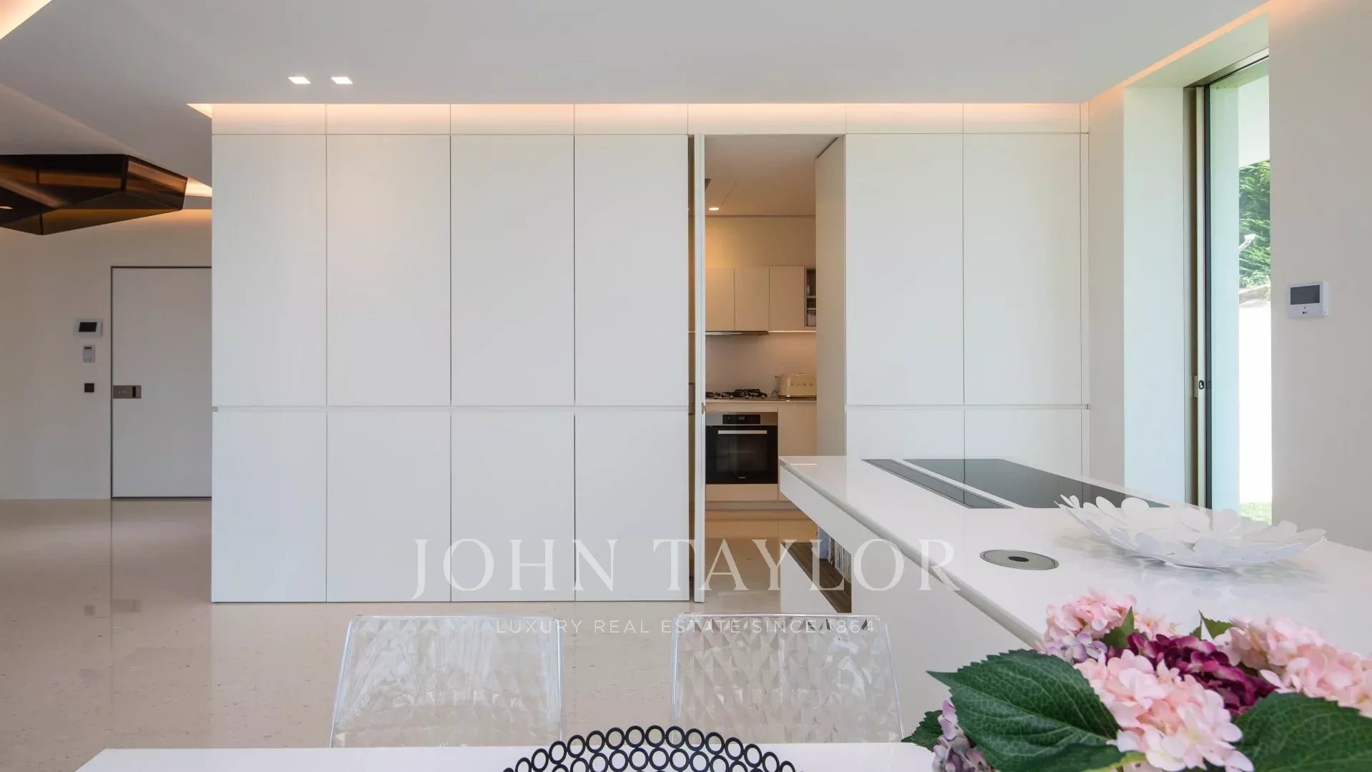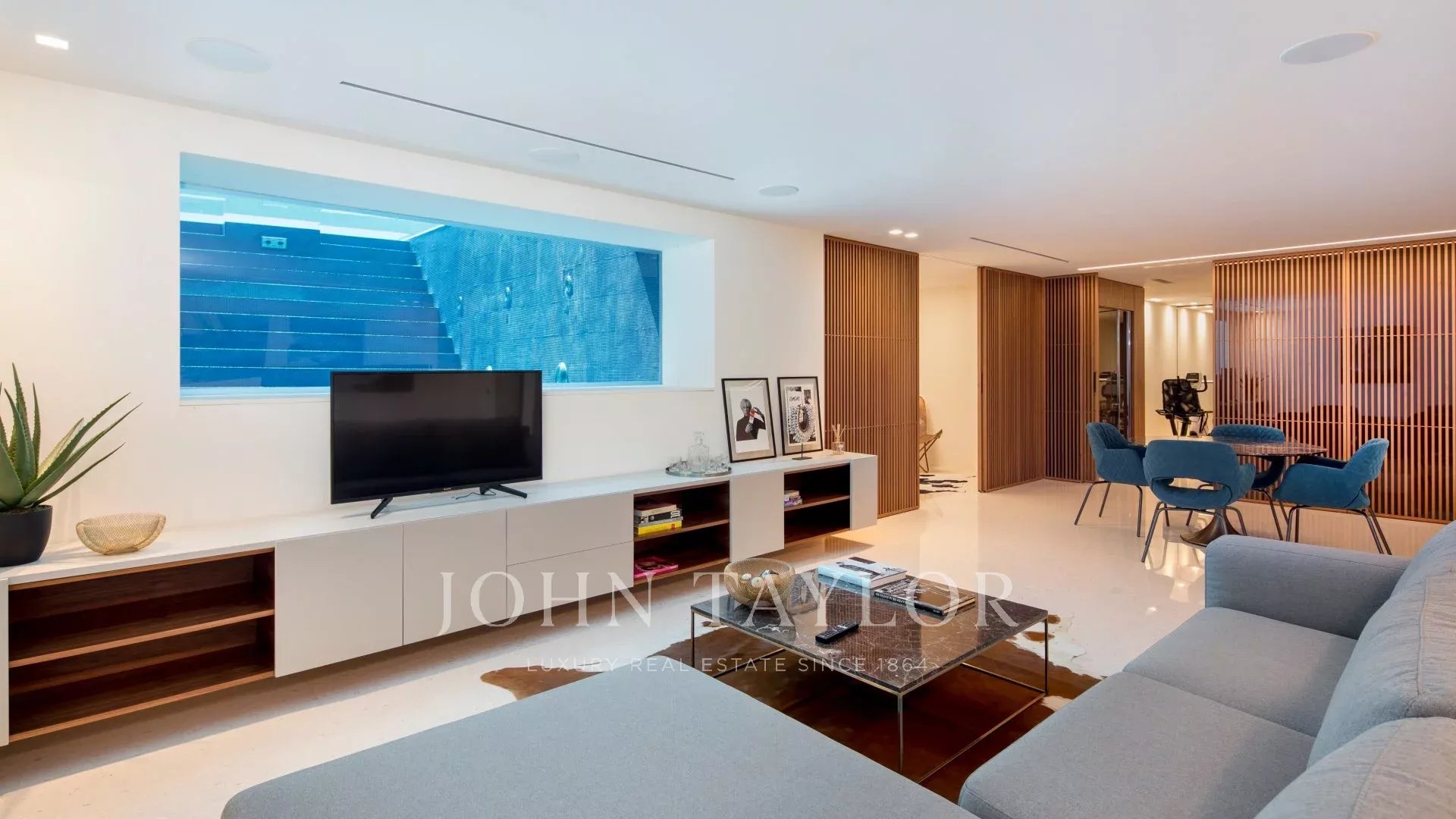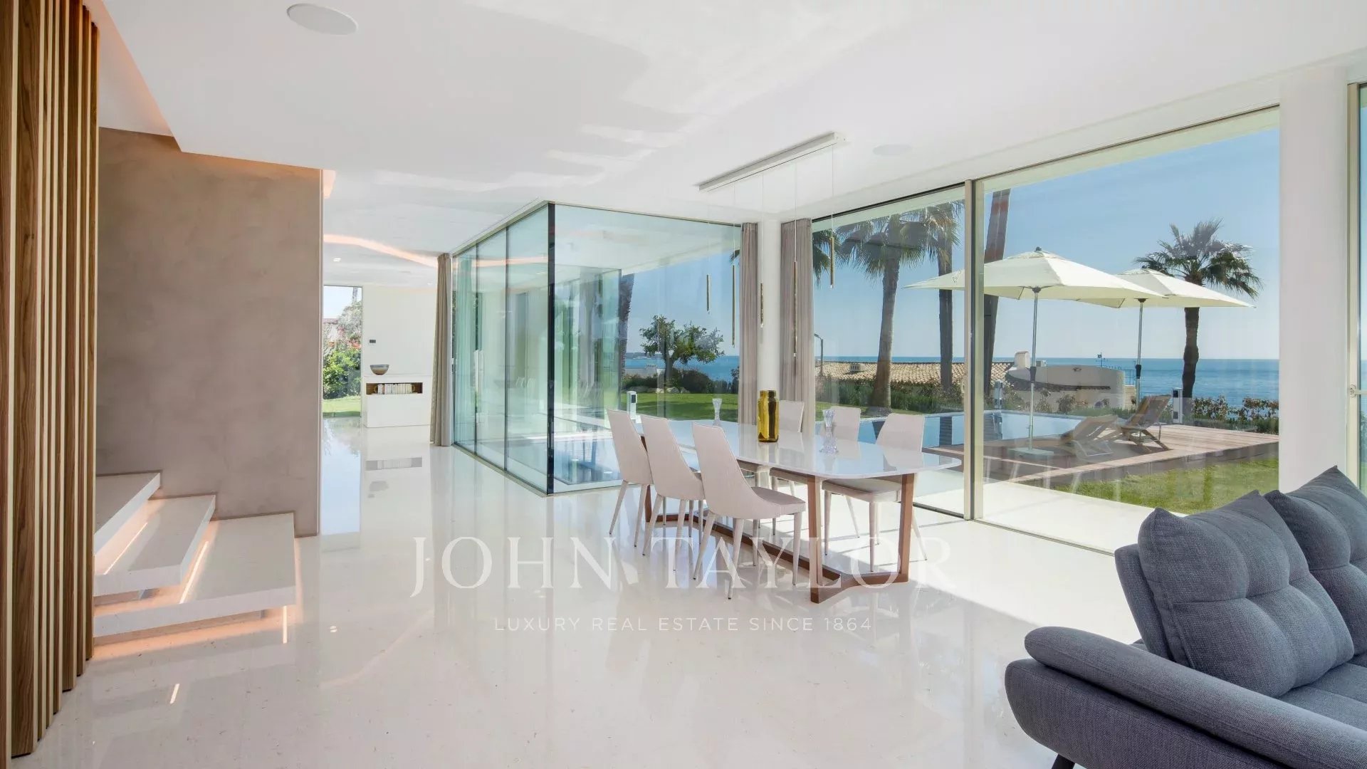 The villa has a lift, general air conditioning and a heated swimming pool with a transparent side visible from inside the house.