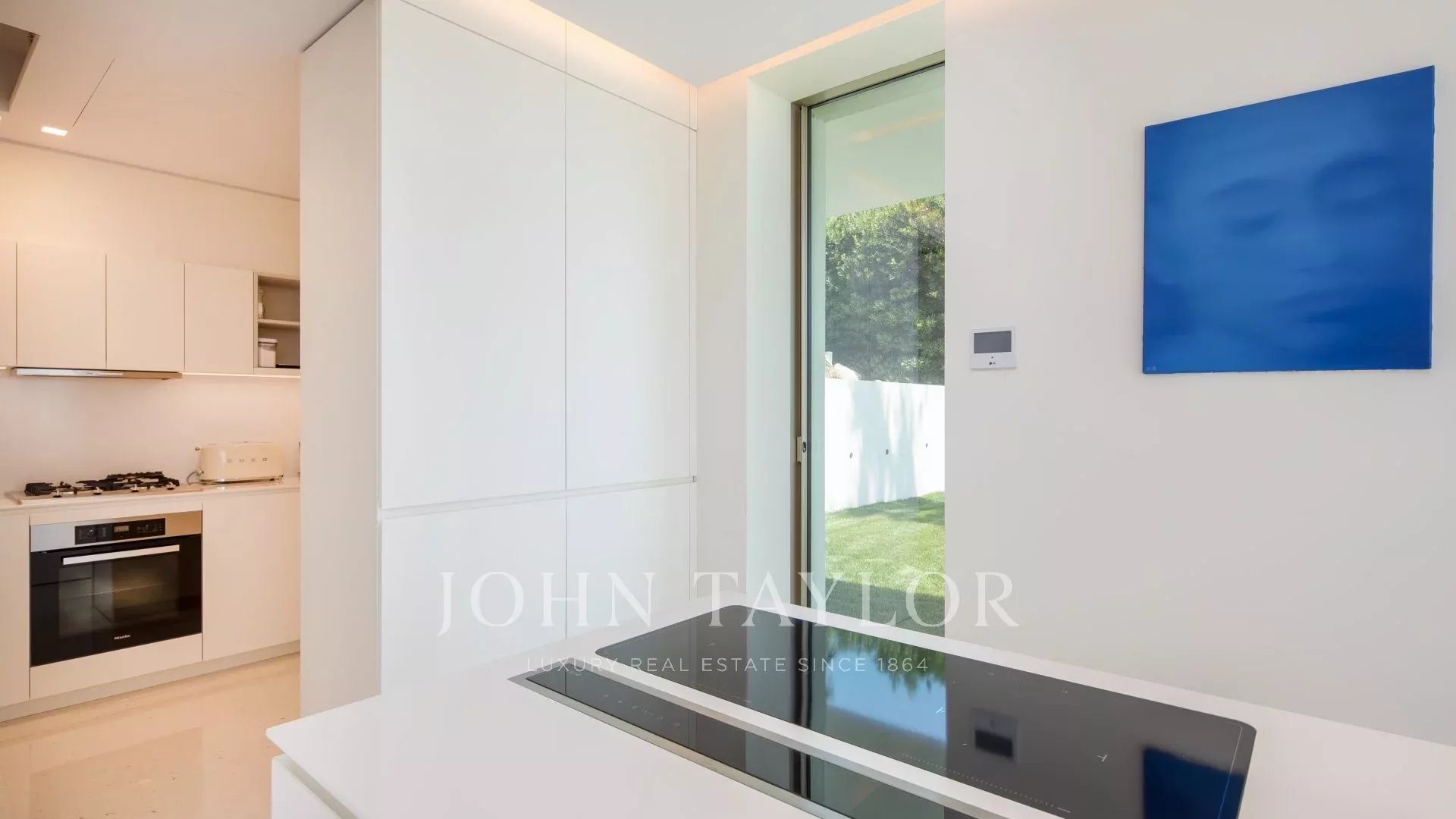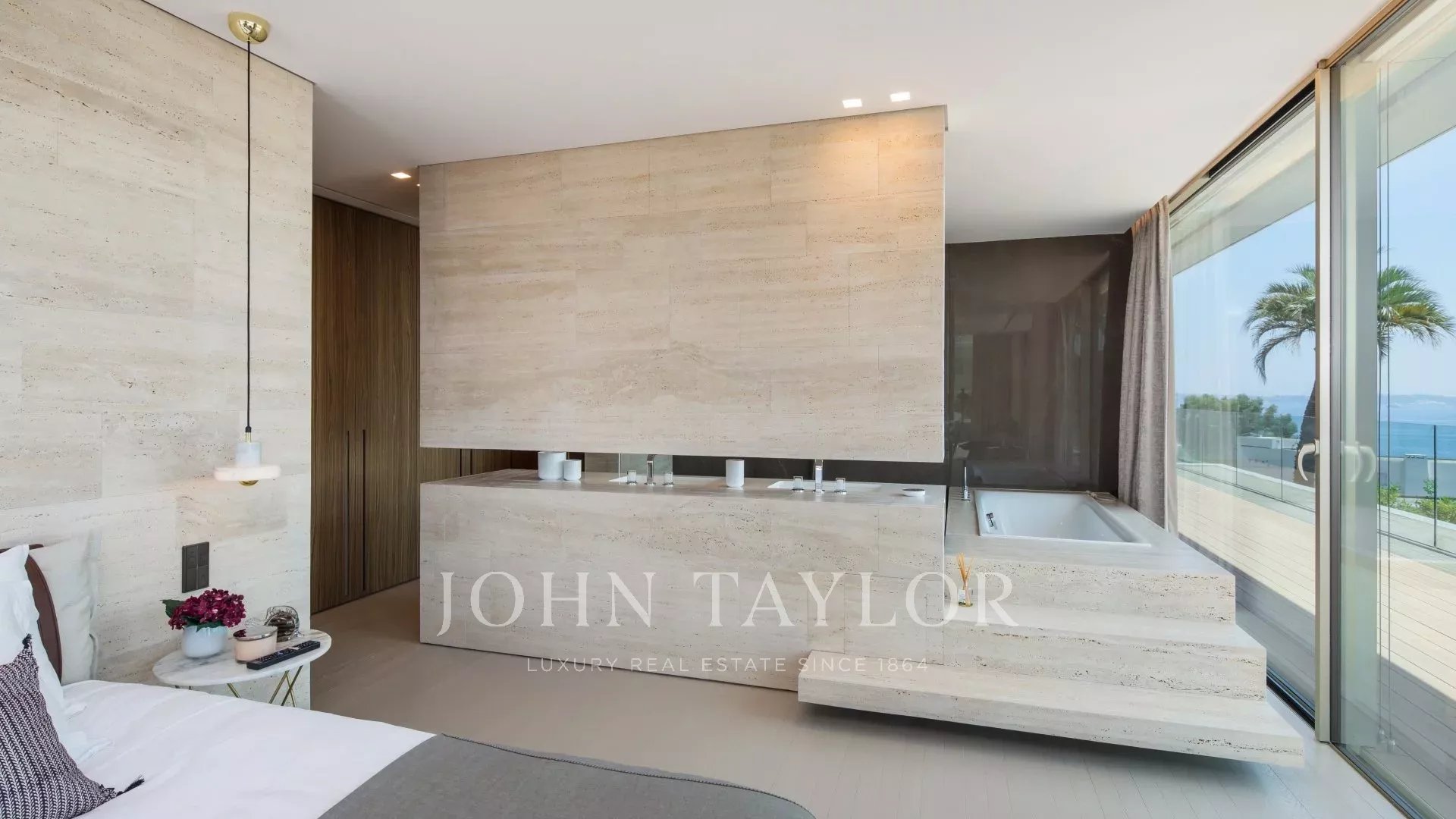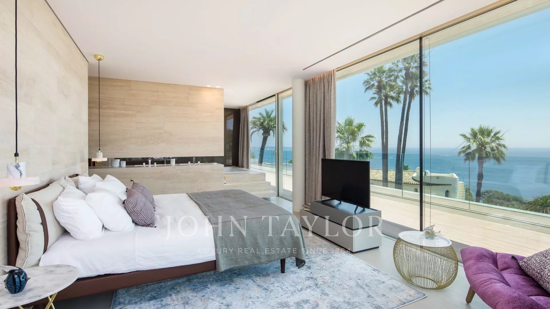 The villa enjoys maximum openness thanks to its glass walls and large bay windows linking the house to the surrounding nature. The majority of the rooms are extended by large terraces and offer a privileged view over the sea and the island of Sainte Marguerite.