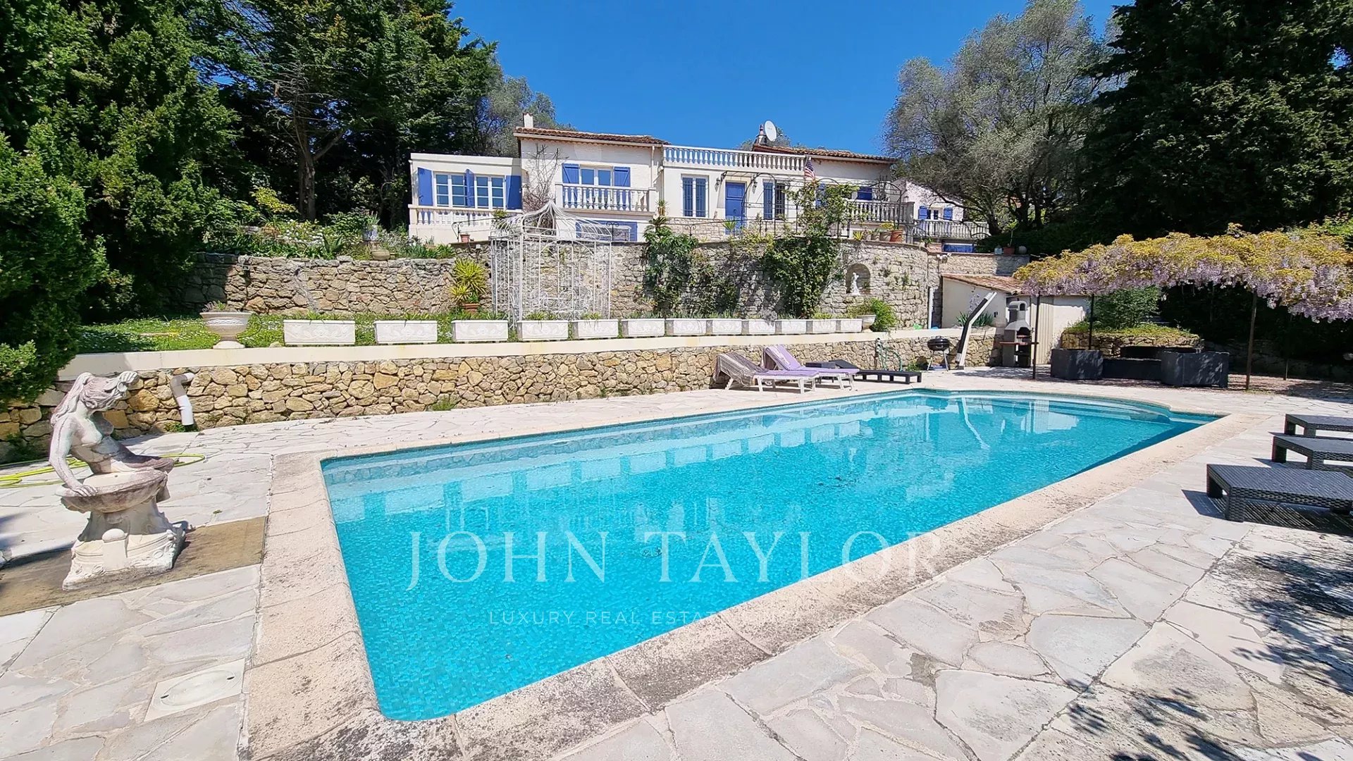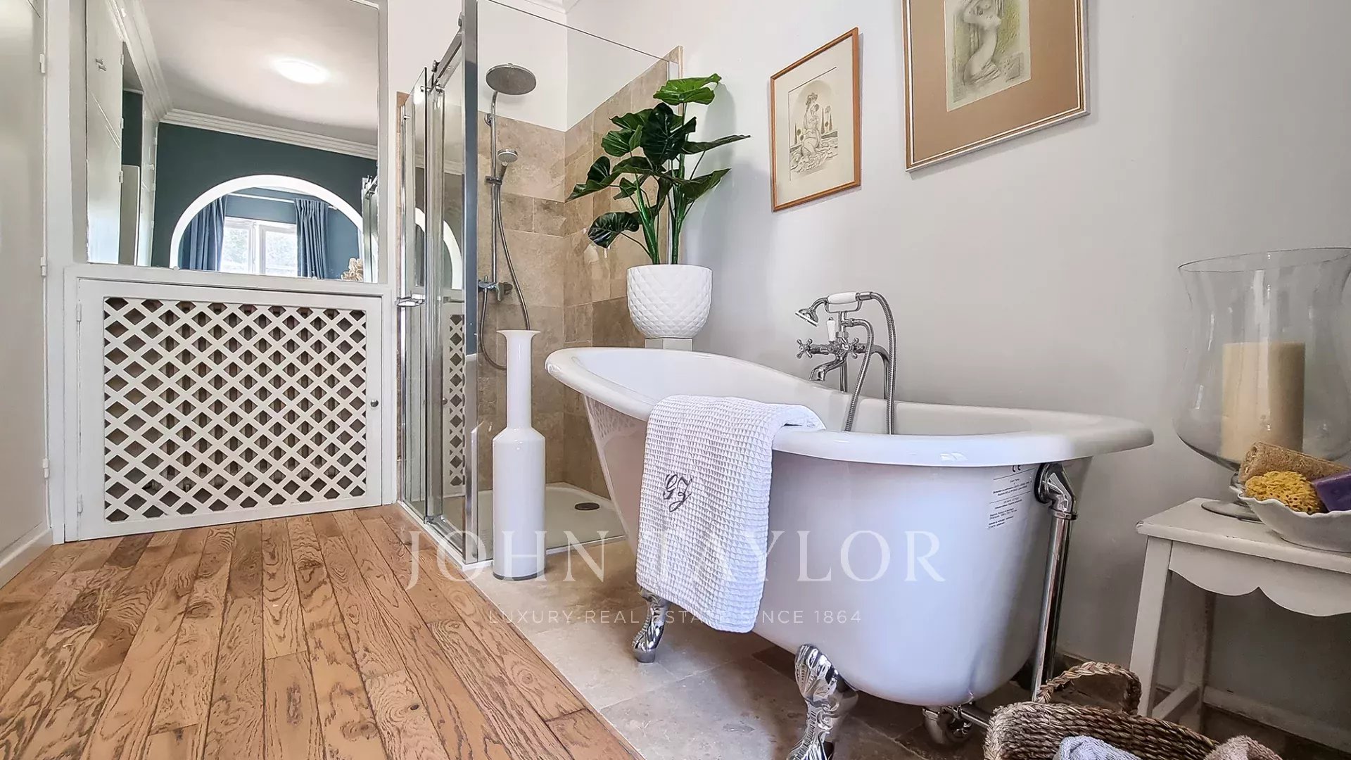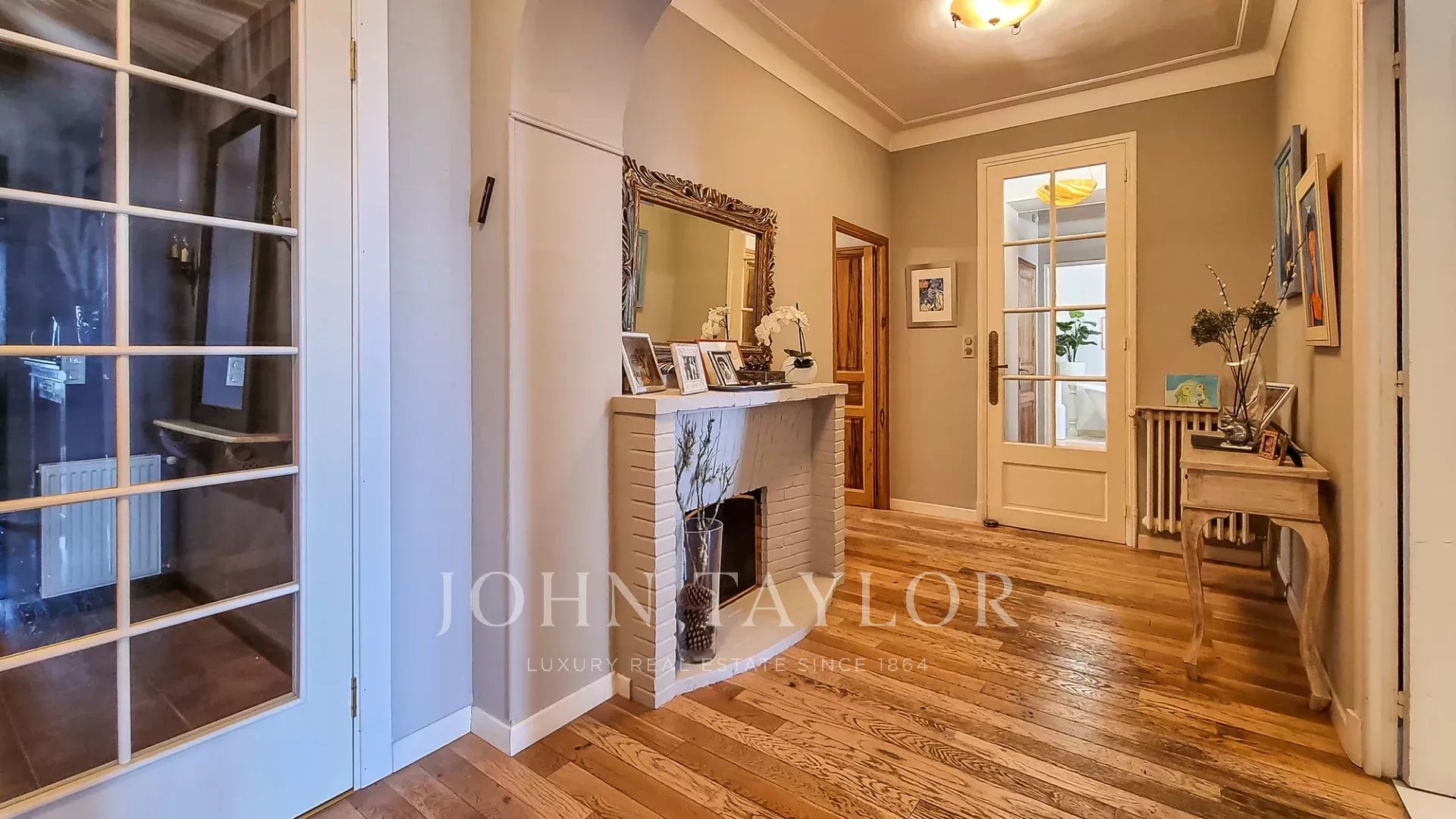In a residential area of “Le Cannet”, this former residence of a Russian Count is located in a private park of approx.2 885 sq.m, planted with century olive trees, fruit trees and a flowered garden surrounding a magnificent mosaic swimming pool.
