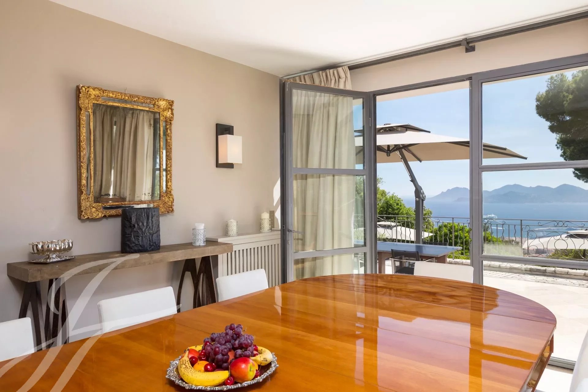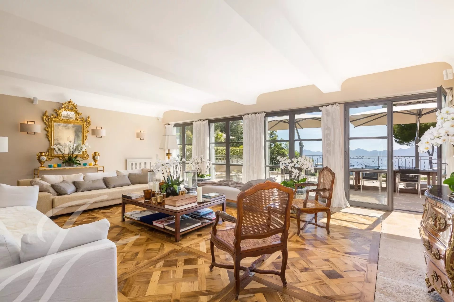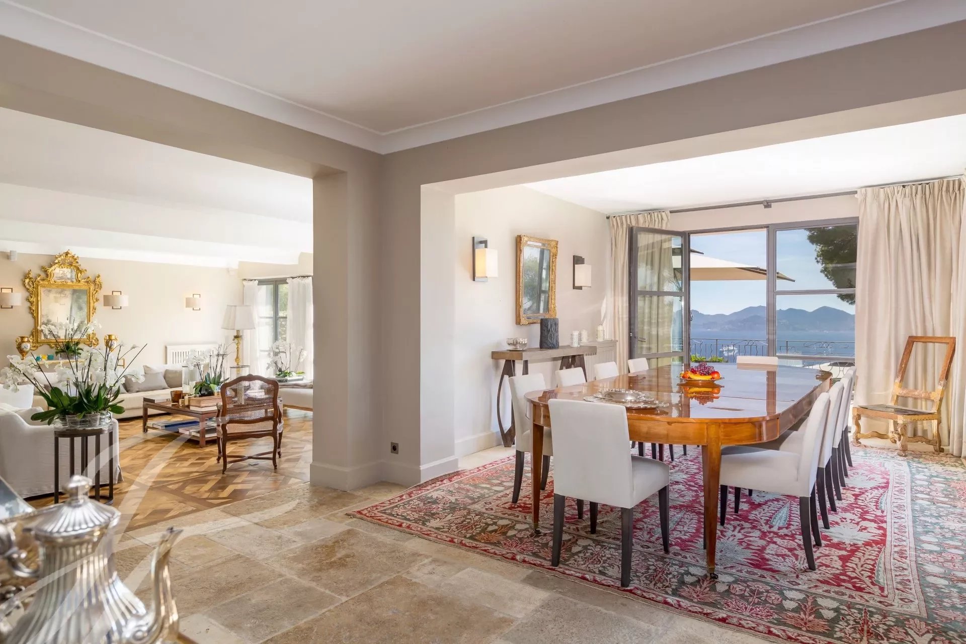 The villa has been recently renovated, is fully air-conditioned, and offers breathtaking views of the bay of Cannes. With a southwest exposure, the villa spans roughly 500 square meters and includes: