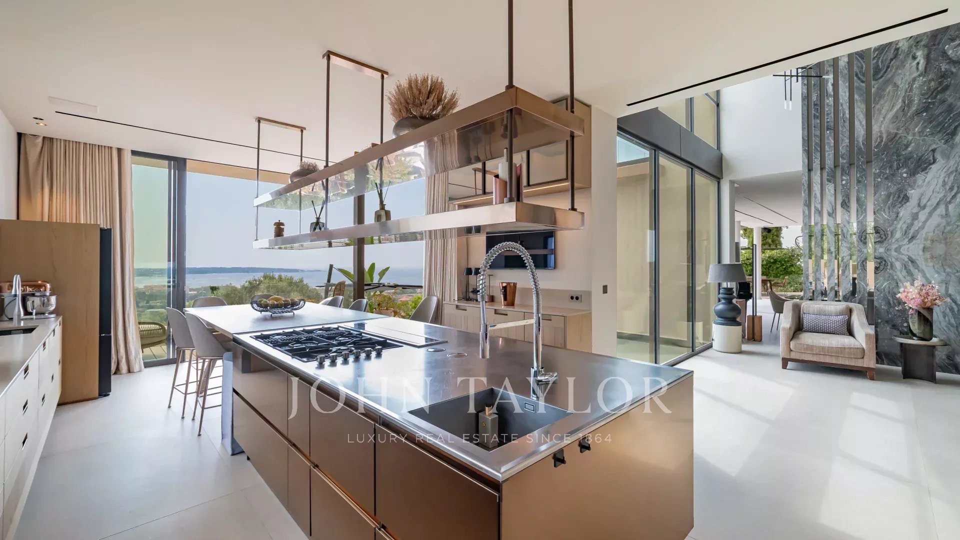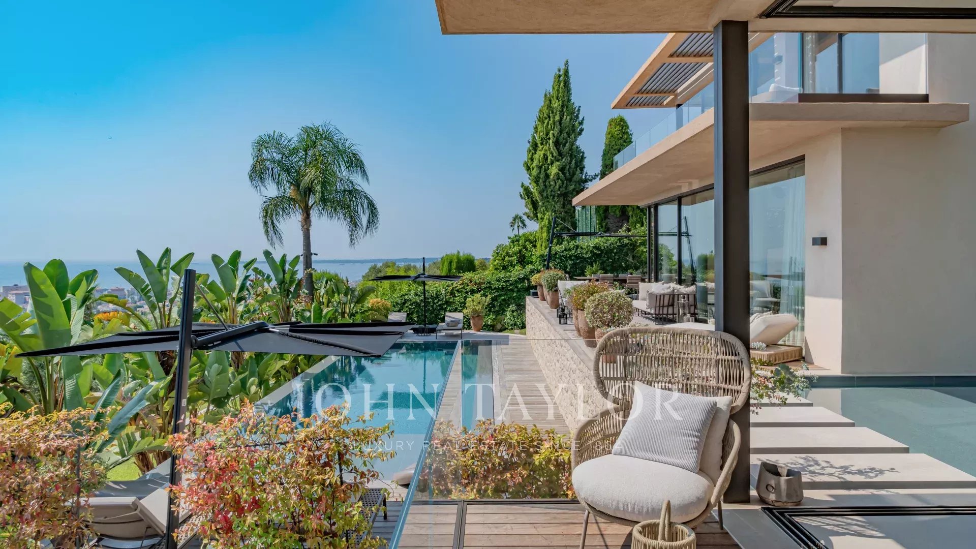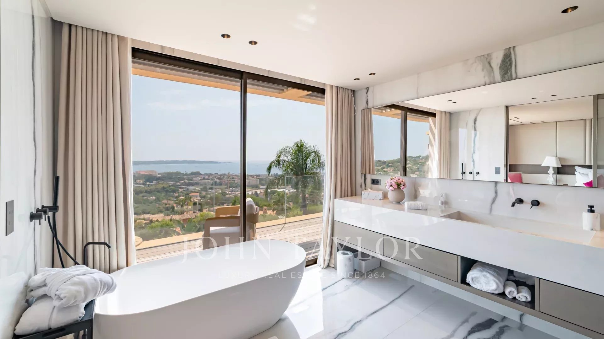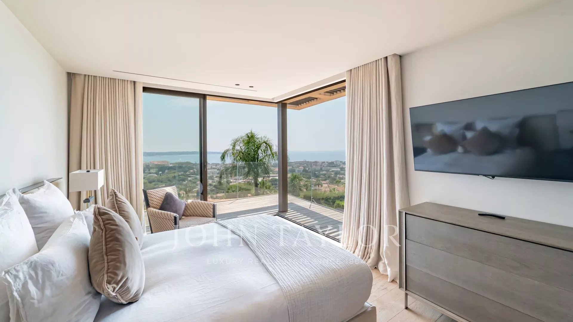 Ideally located in Golfe Juan, this new architect-designed house offers panoramic views of the sea and Cap d'Antibes.