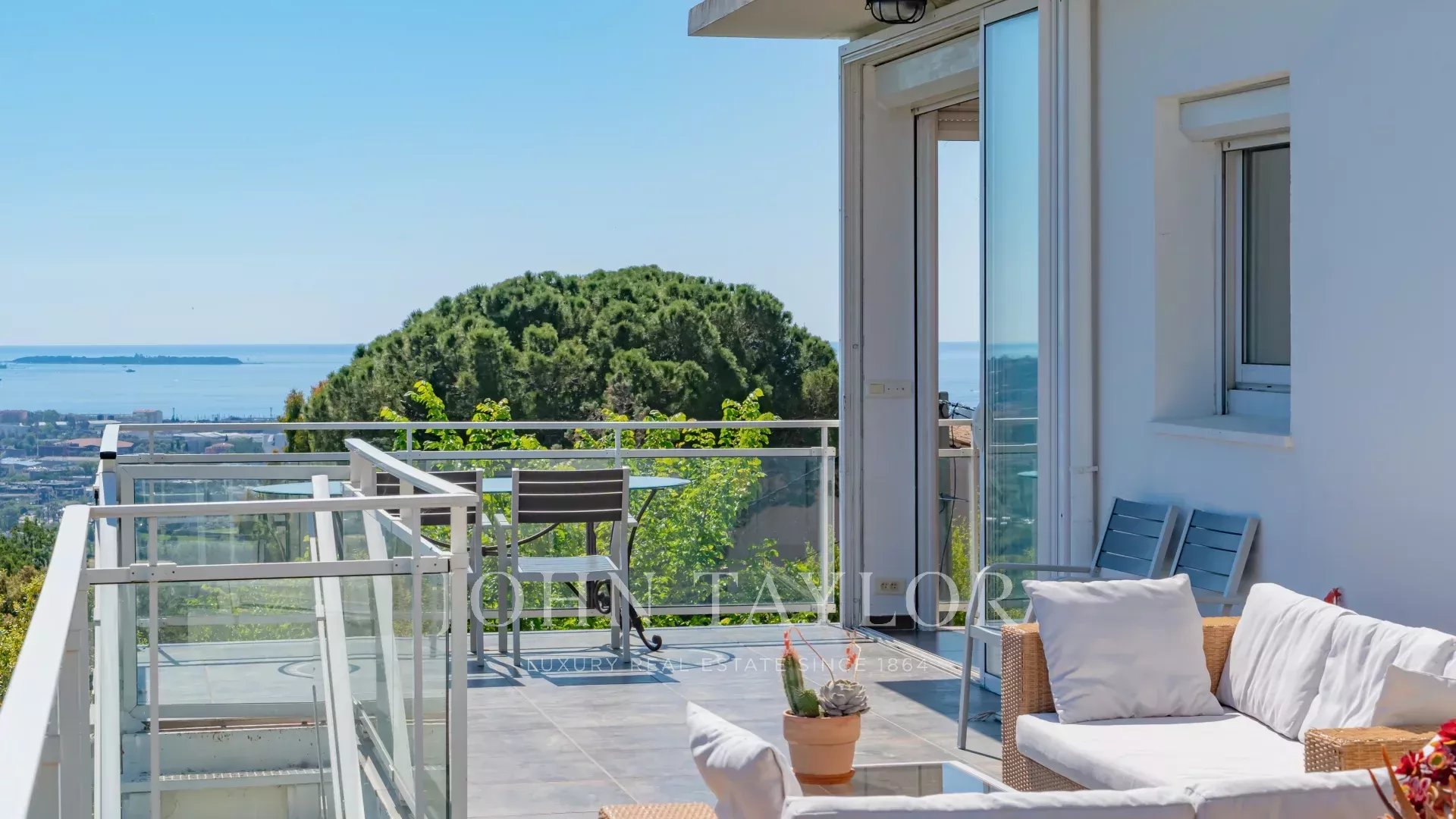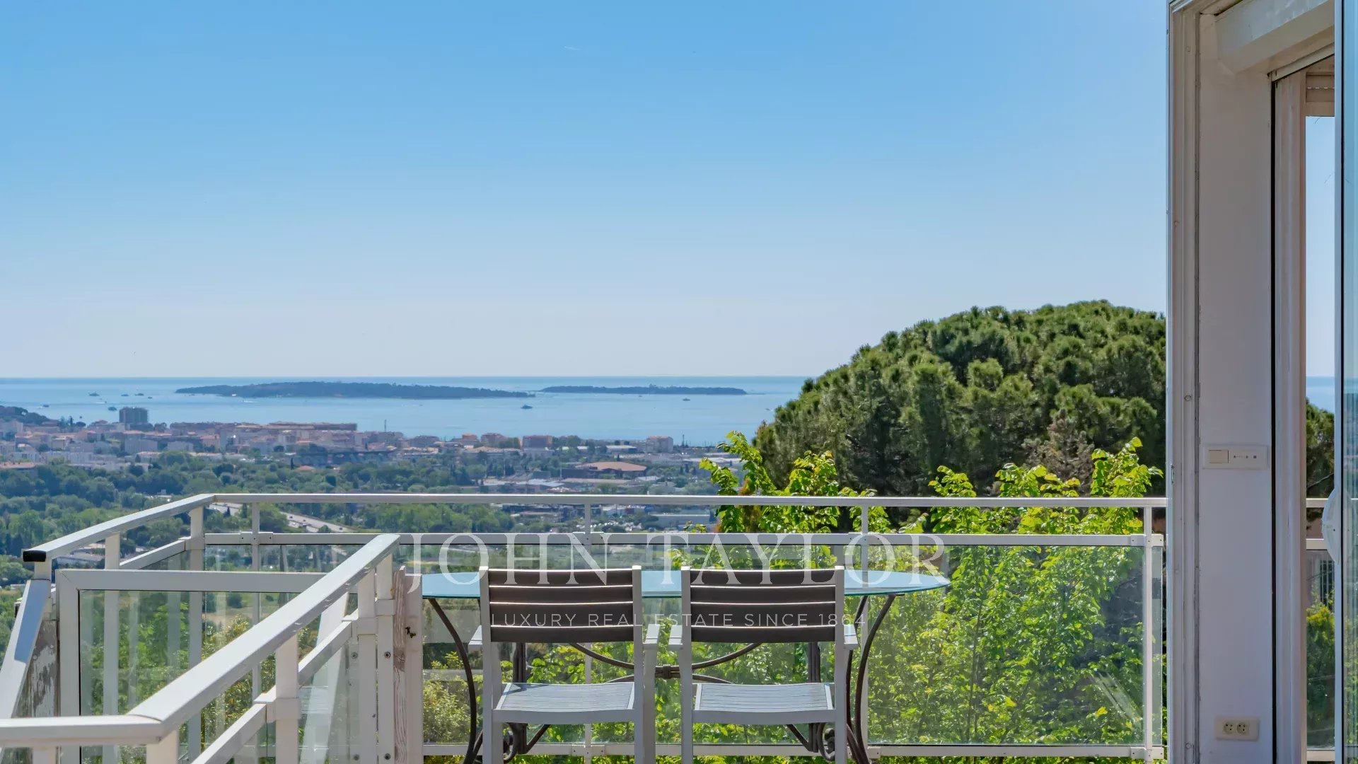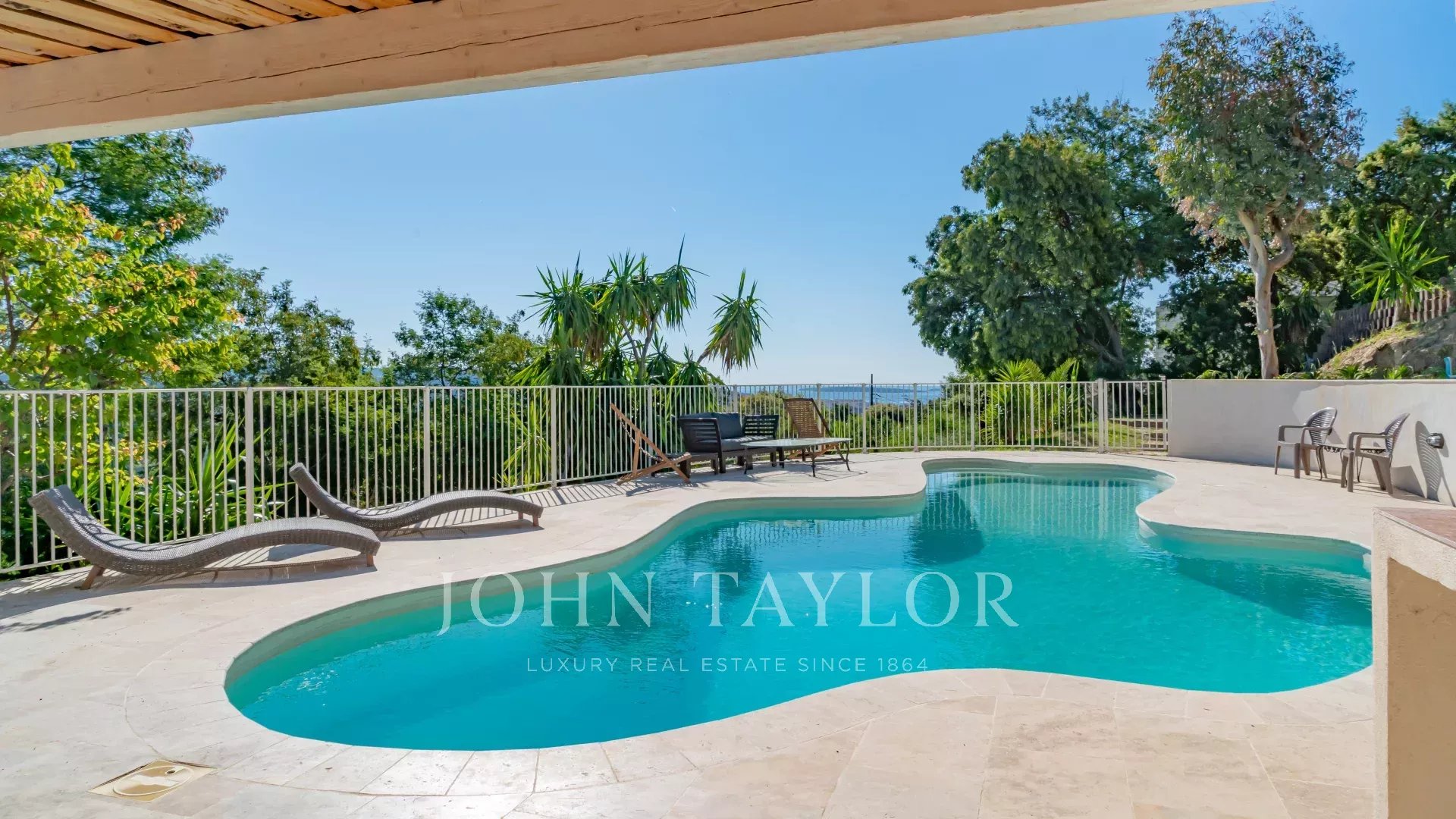 Located on the heights of Mandelieu, this contemporary-style villa boasts breathtaking 270-degree panoramic views of the islands, the bay of Cannes, the Estérel massif and the Alps.