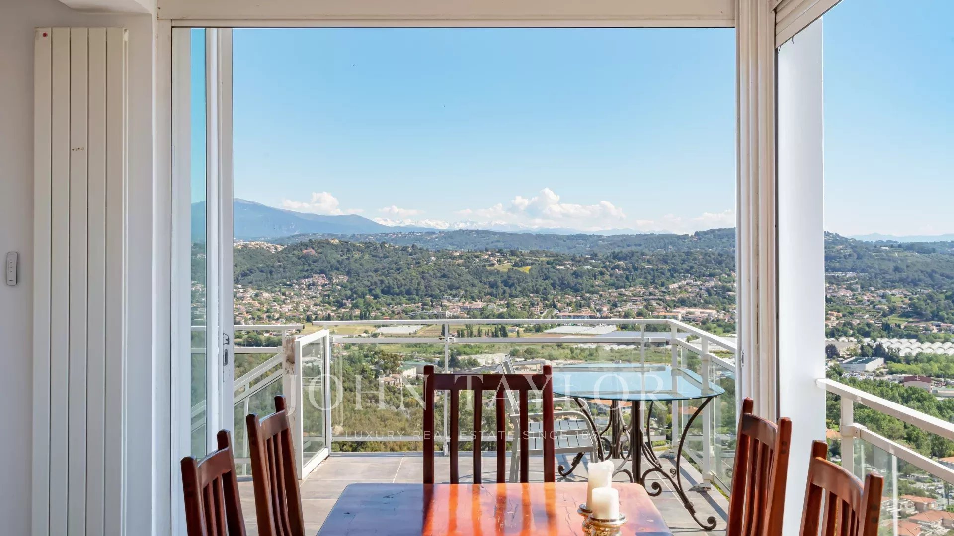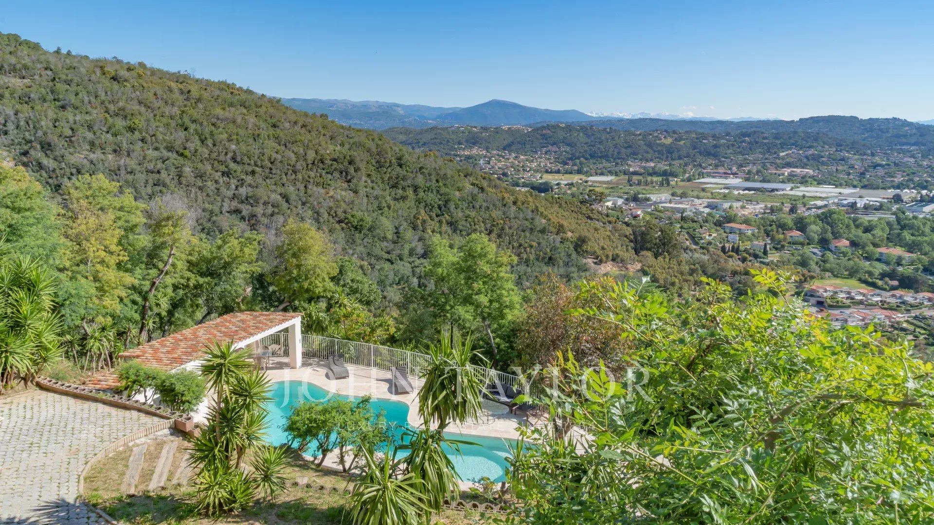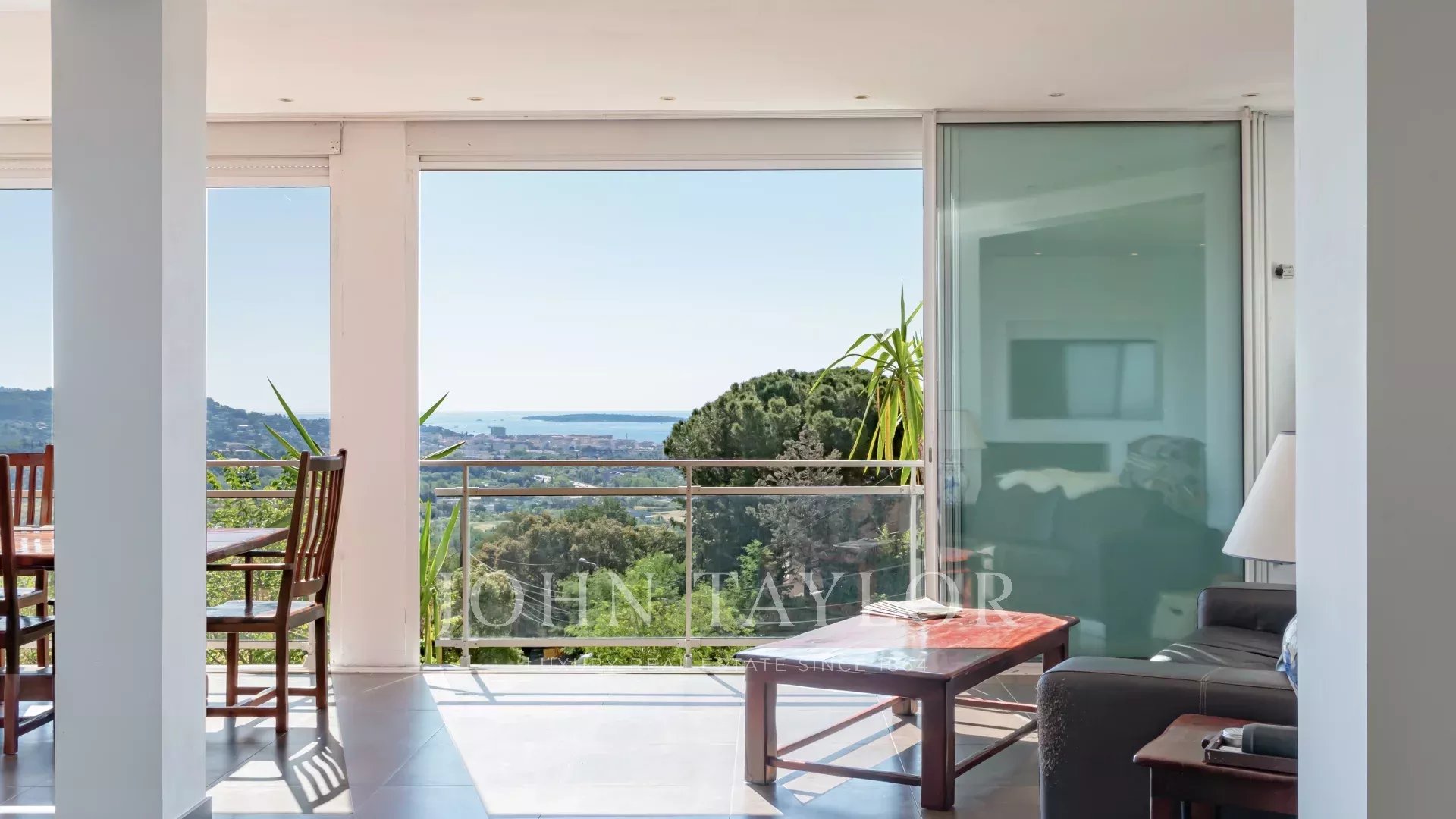 Located on the heights of Mandelieu, this contemporary-style villa boasts breathtaking 270-degree panoramic views of the islands, the bay of Cannes, the Estérel massif and the Alps.