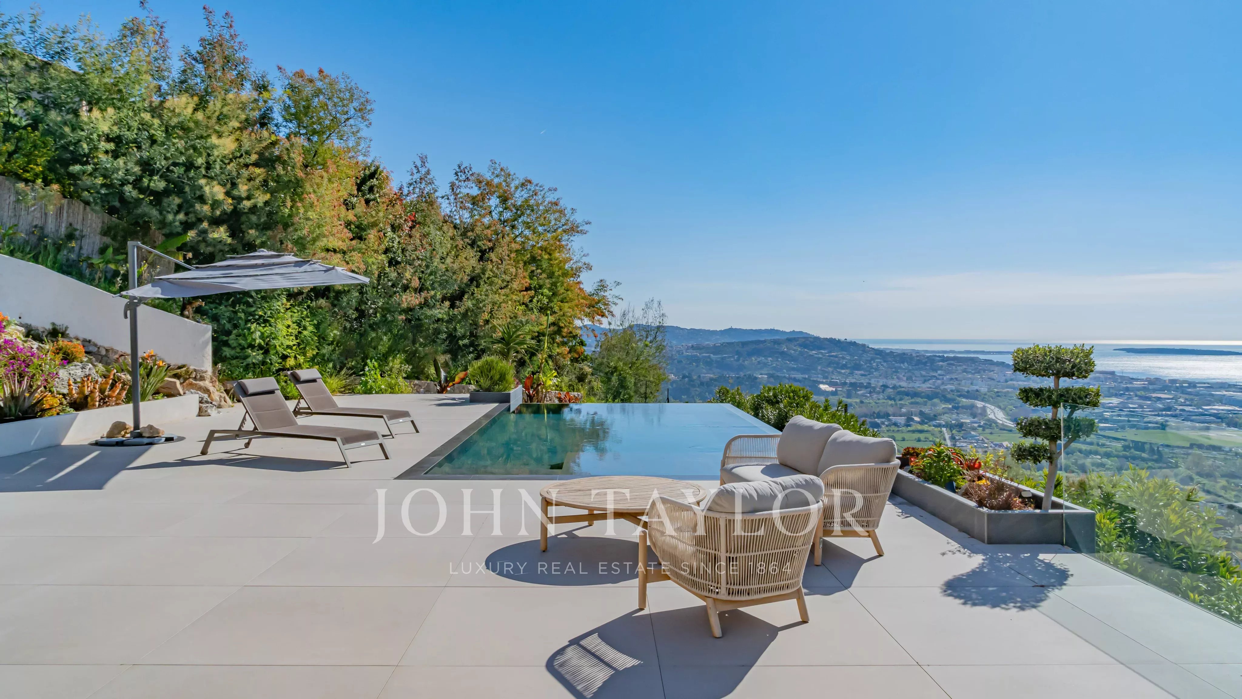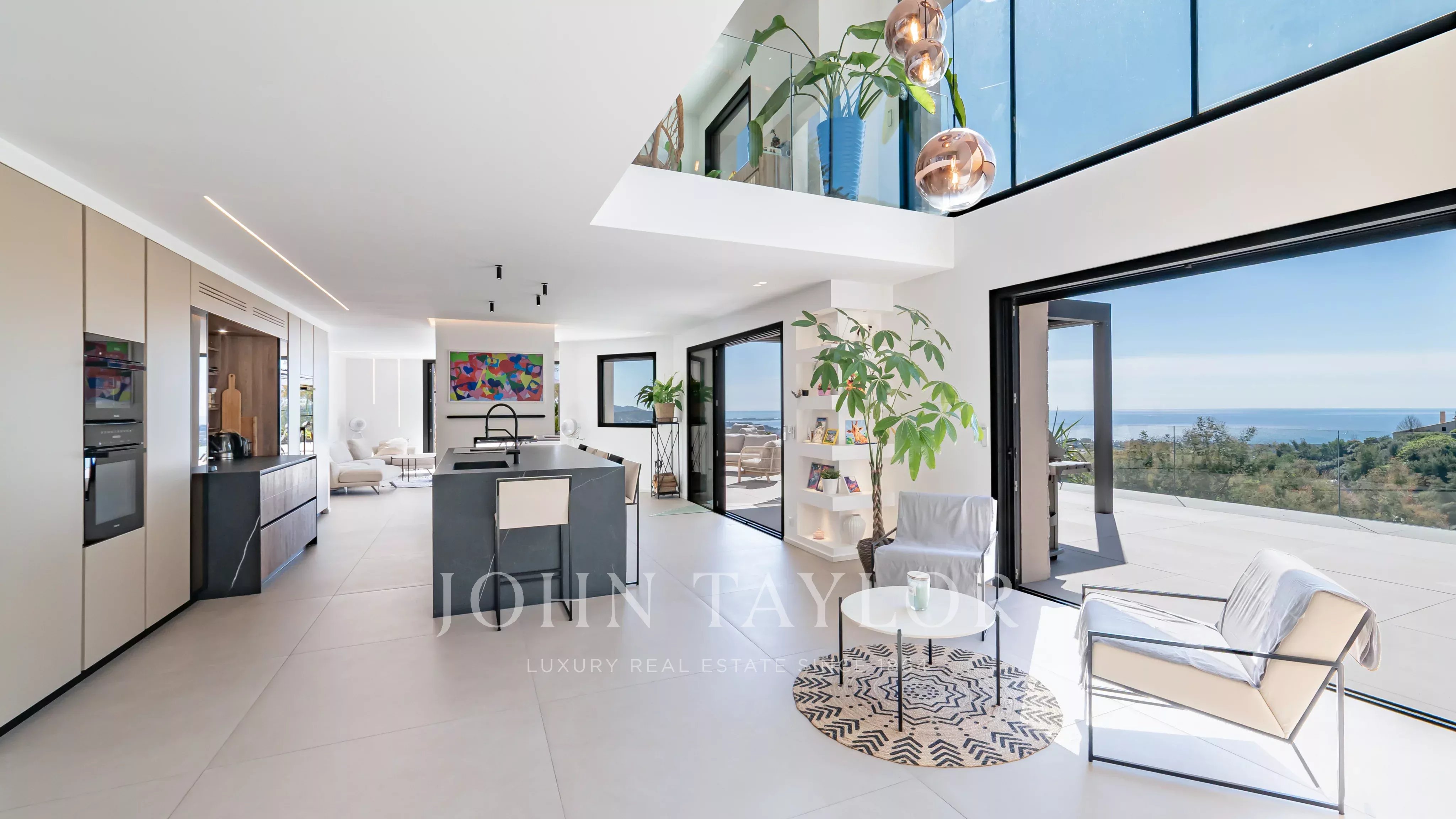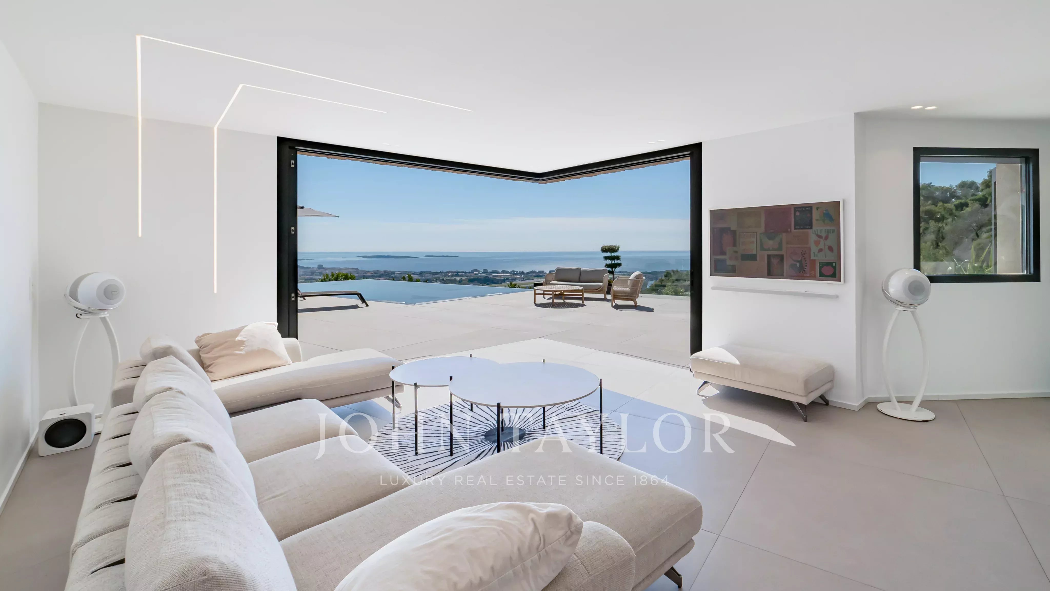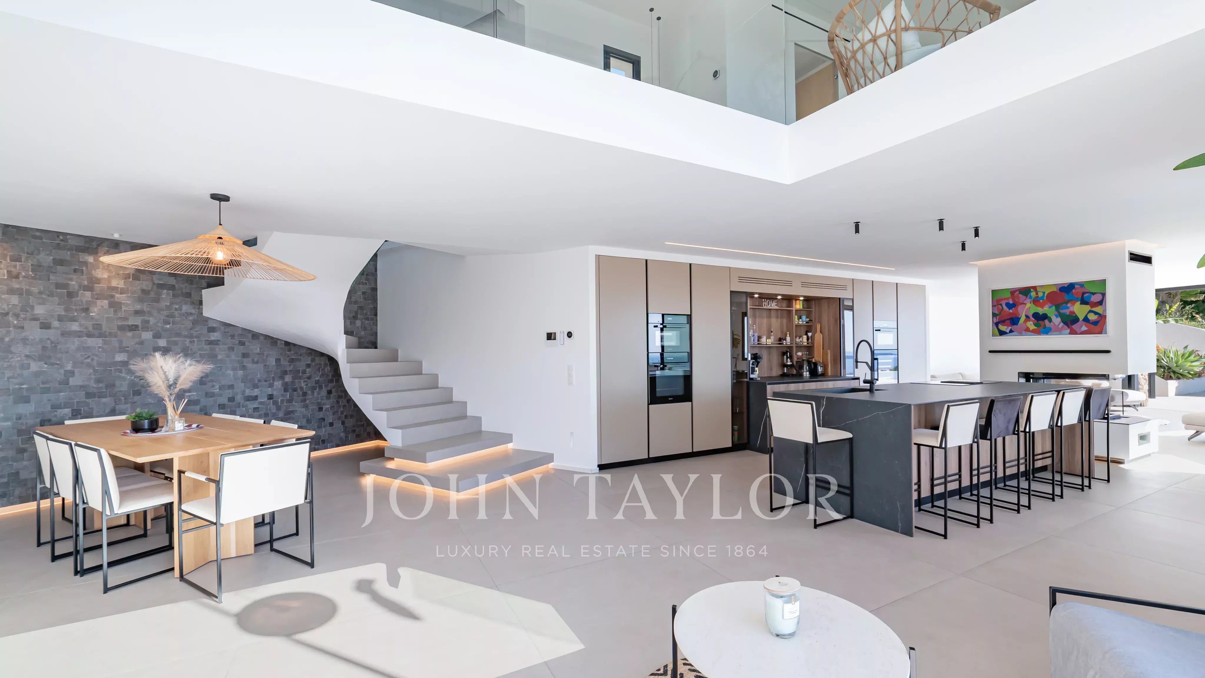 The villa enjoys spectacular sea views, very spacious terraces, and a heated tiled infinity pool.