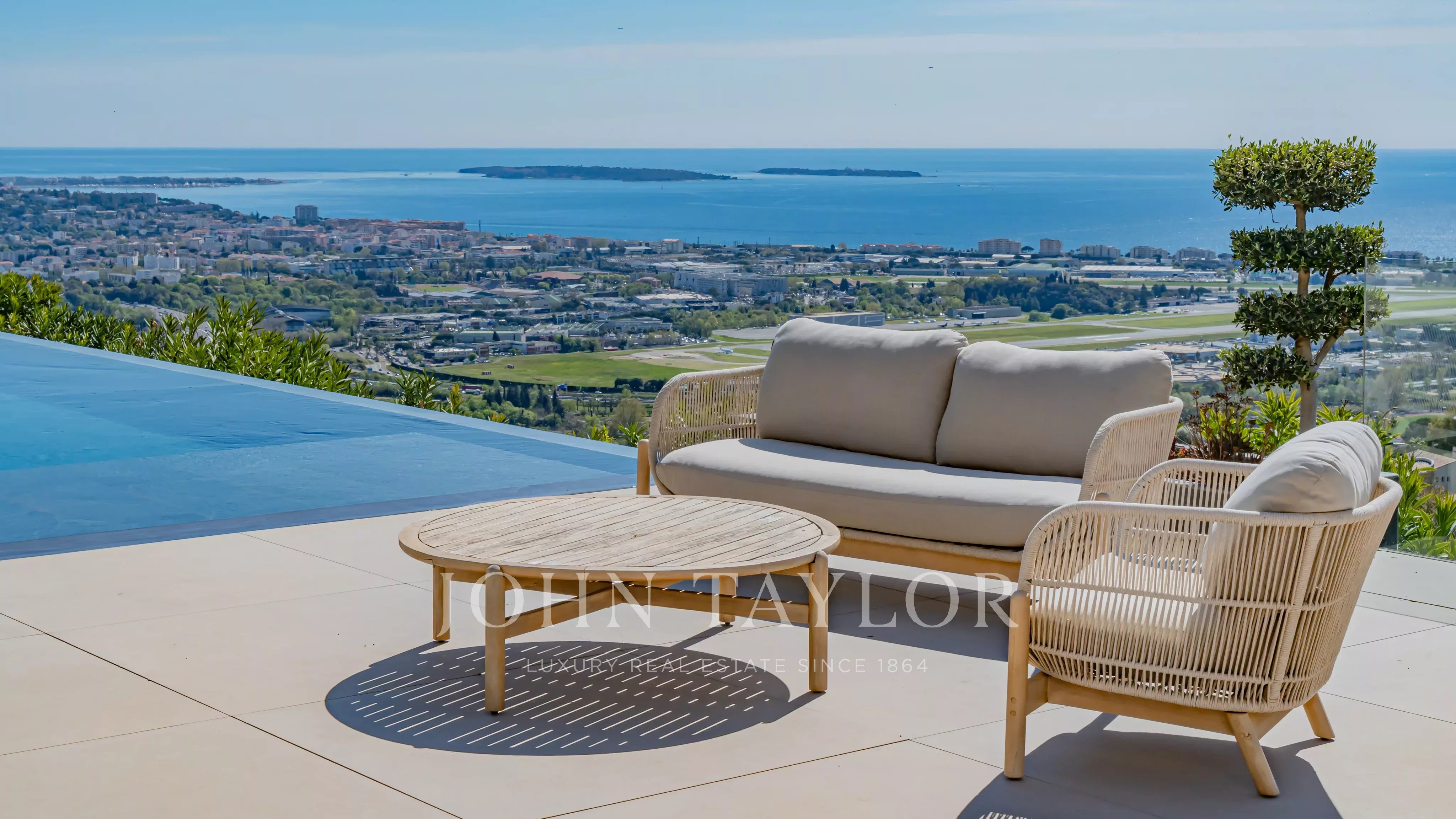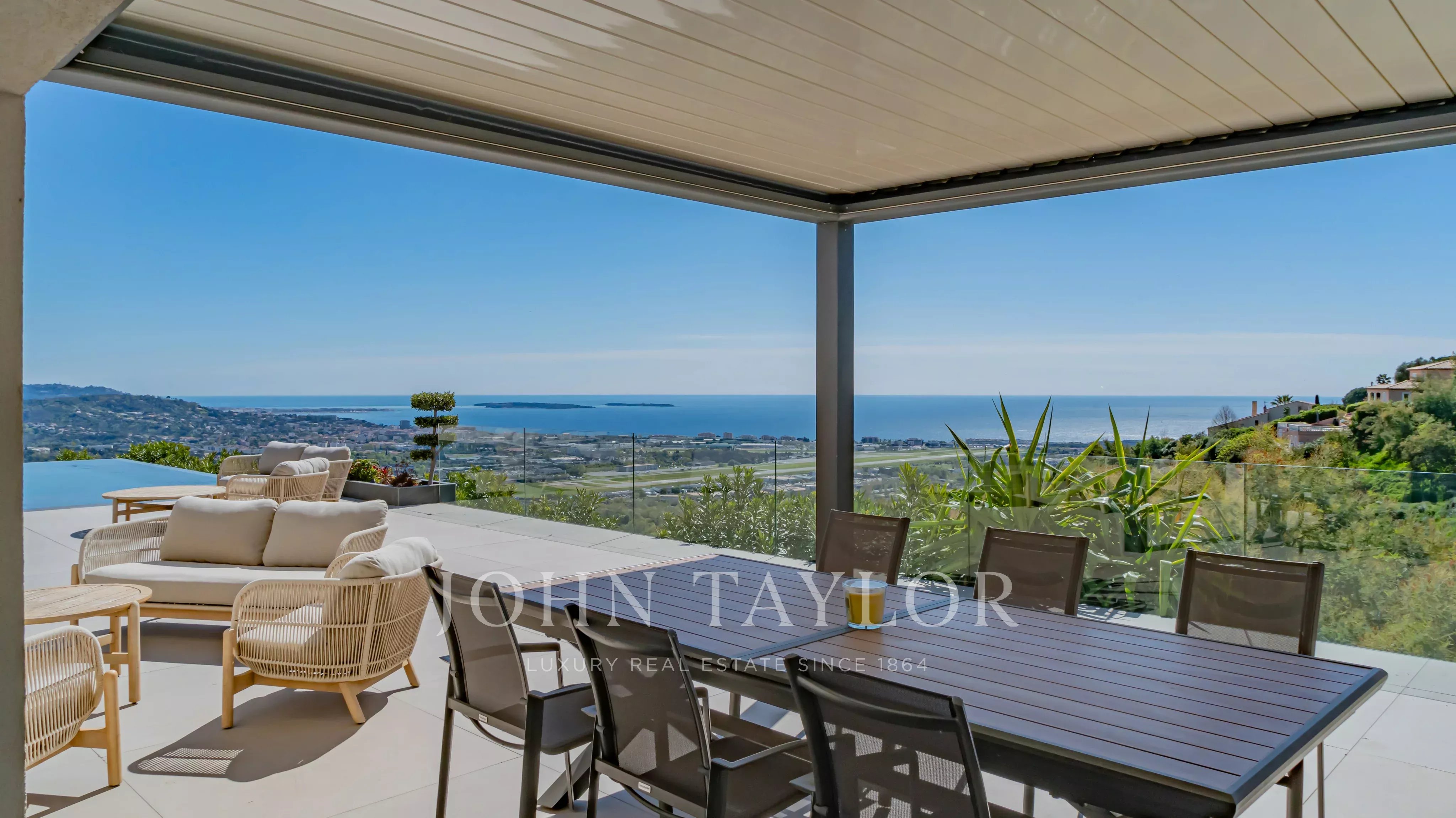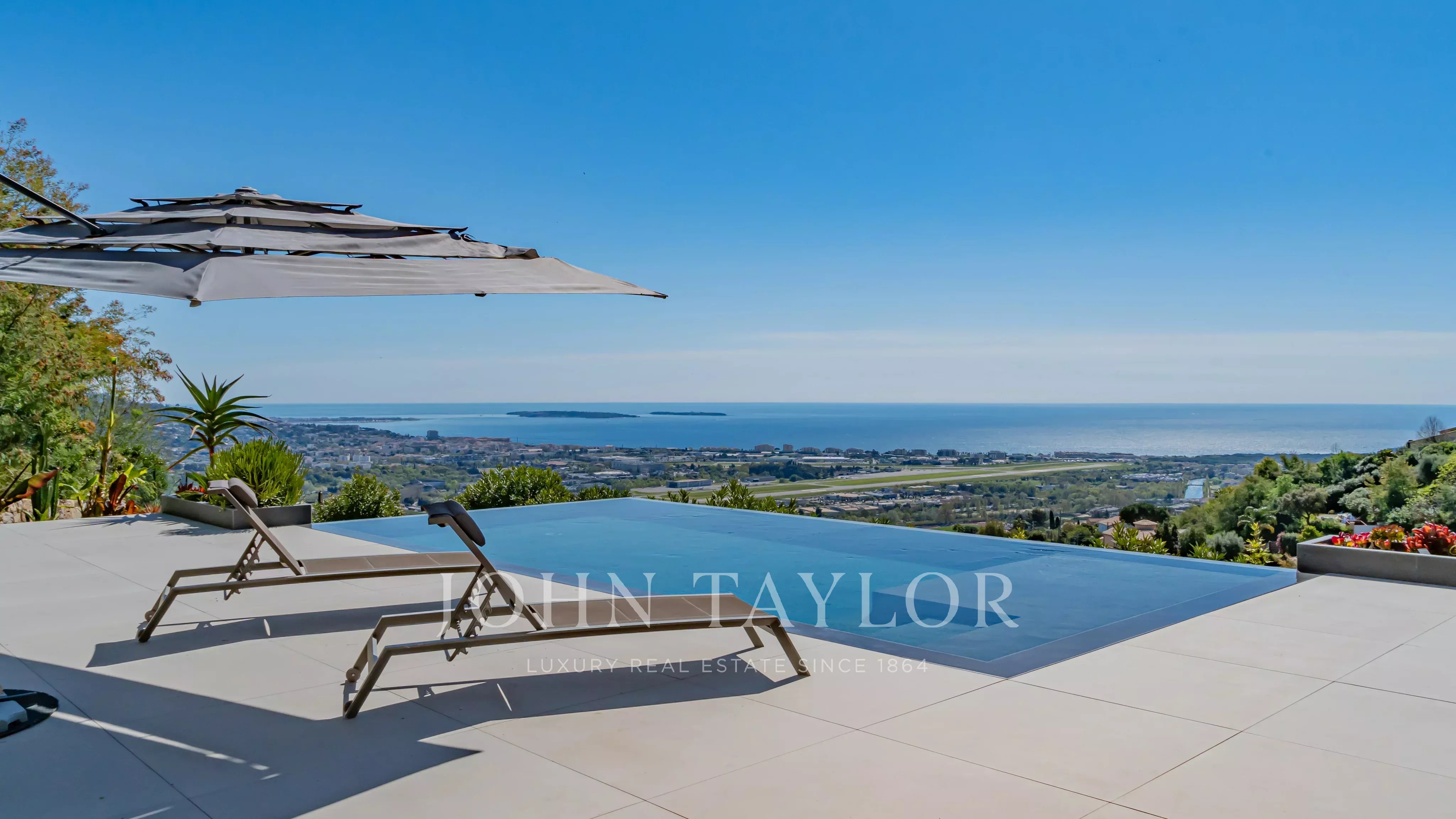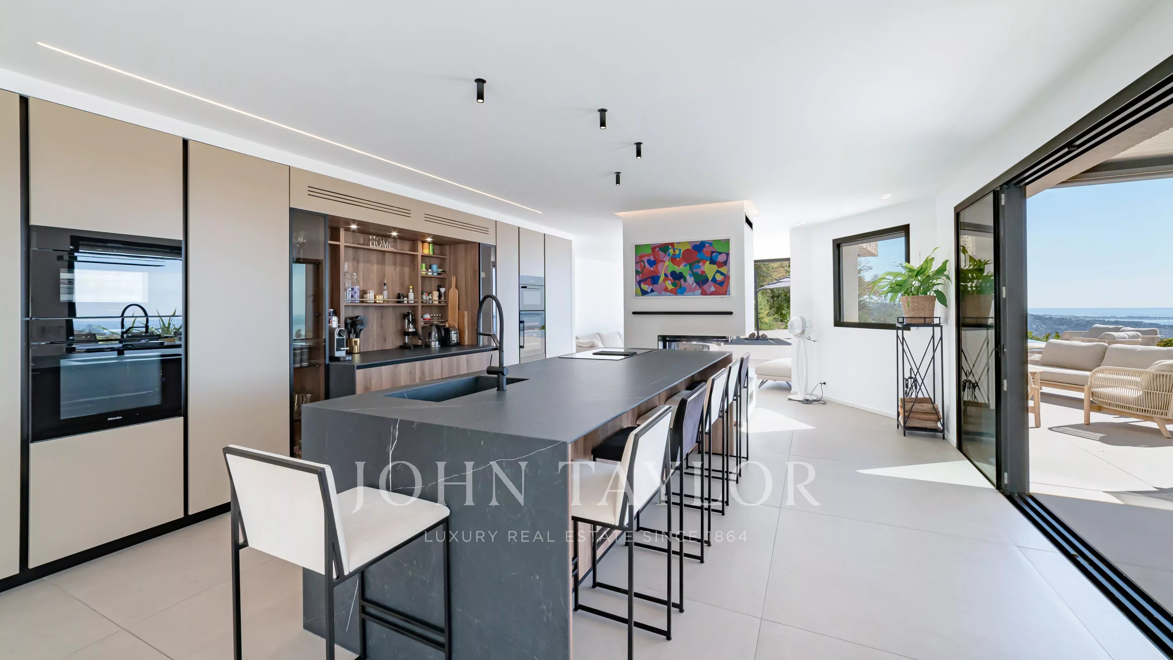 The villa enjoys spectacular sea views, very spacious terraces, and a heated tiled infinity pool.
