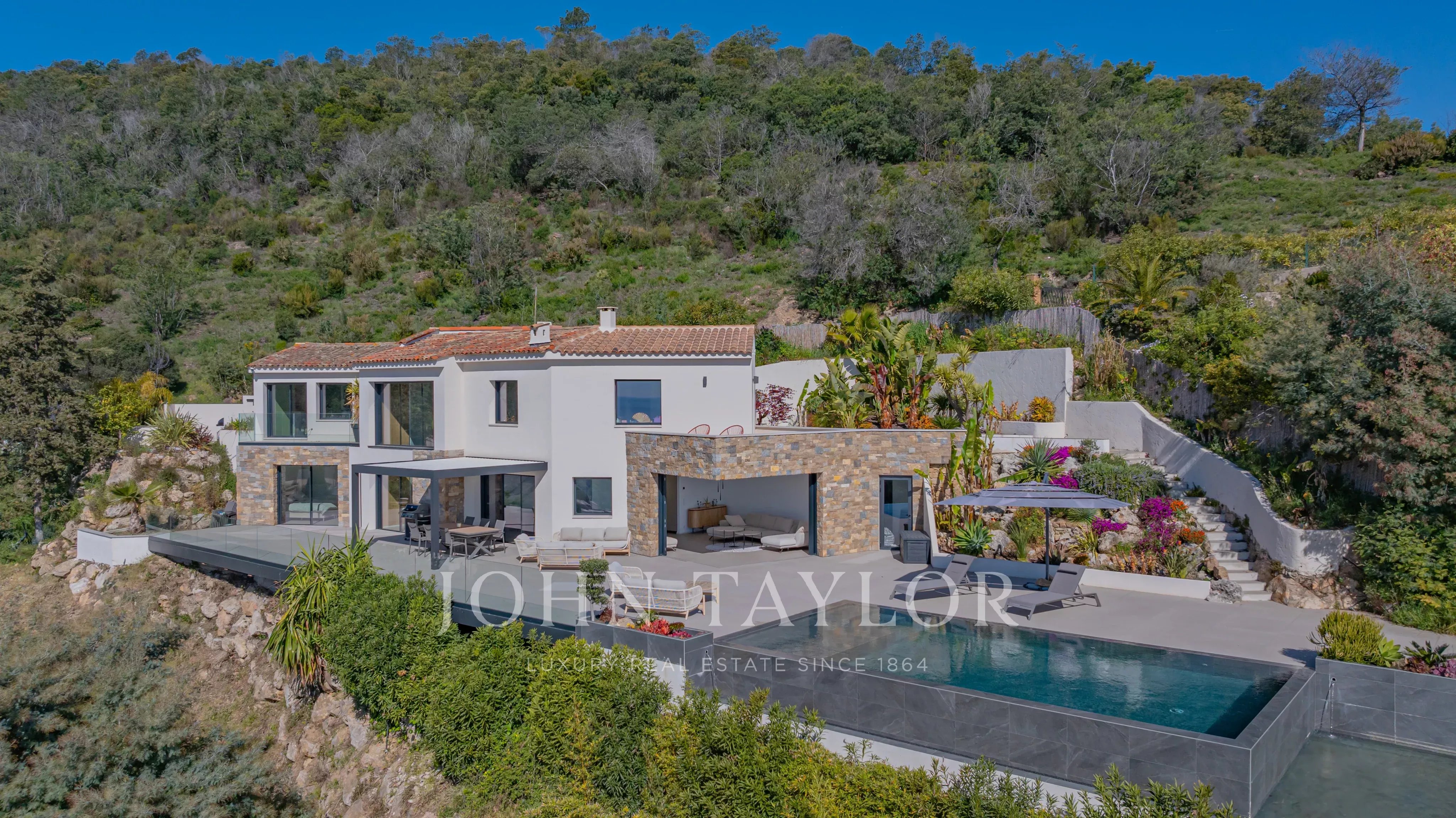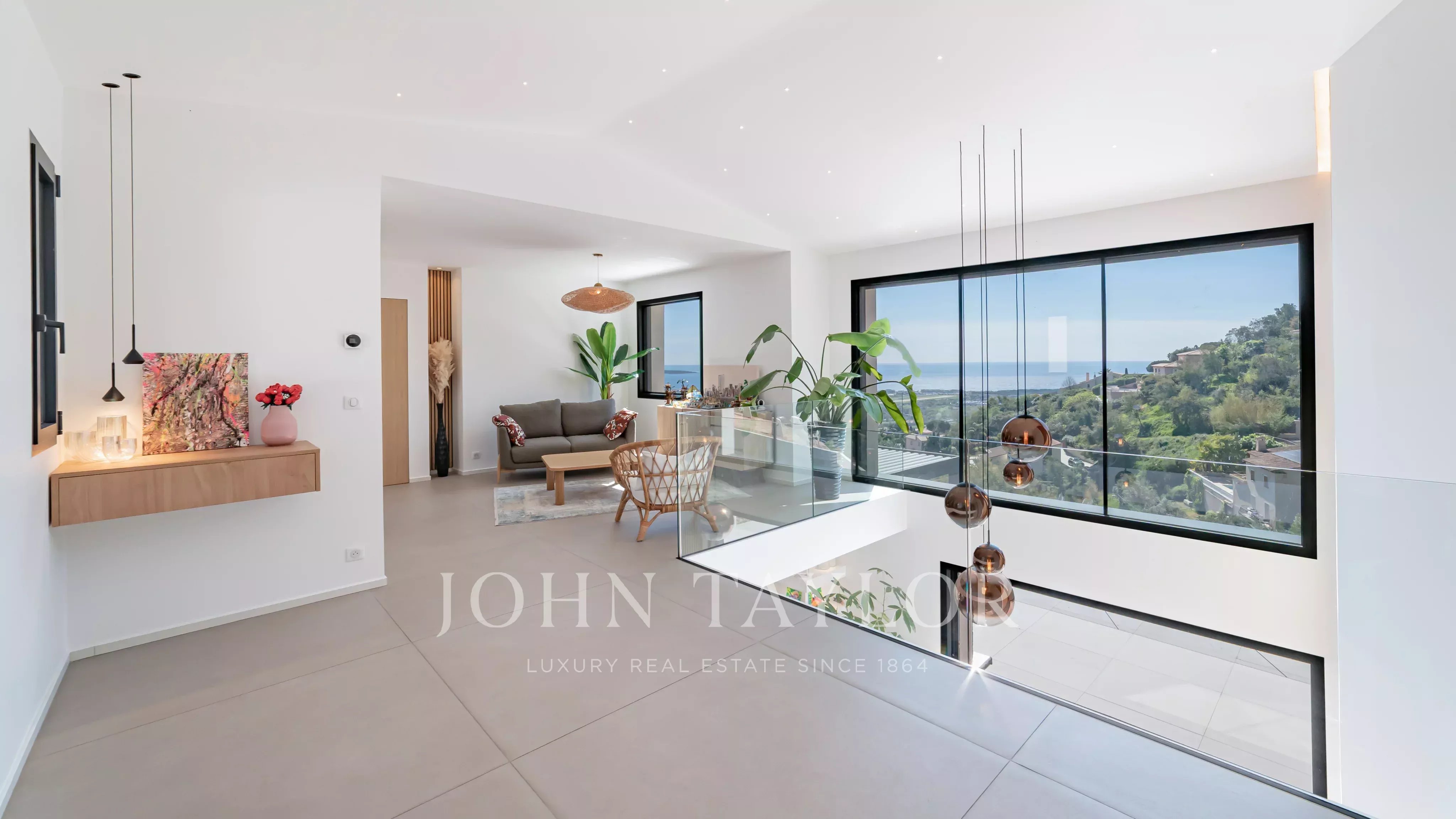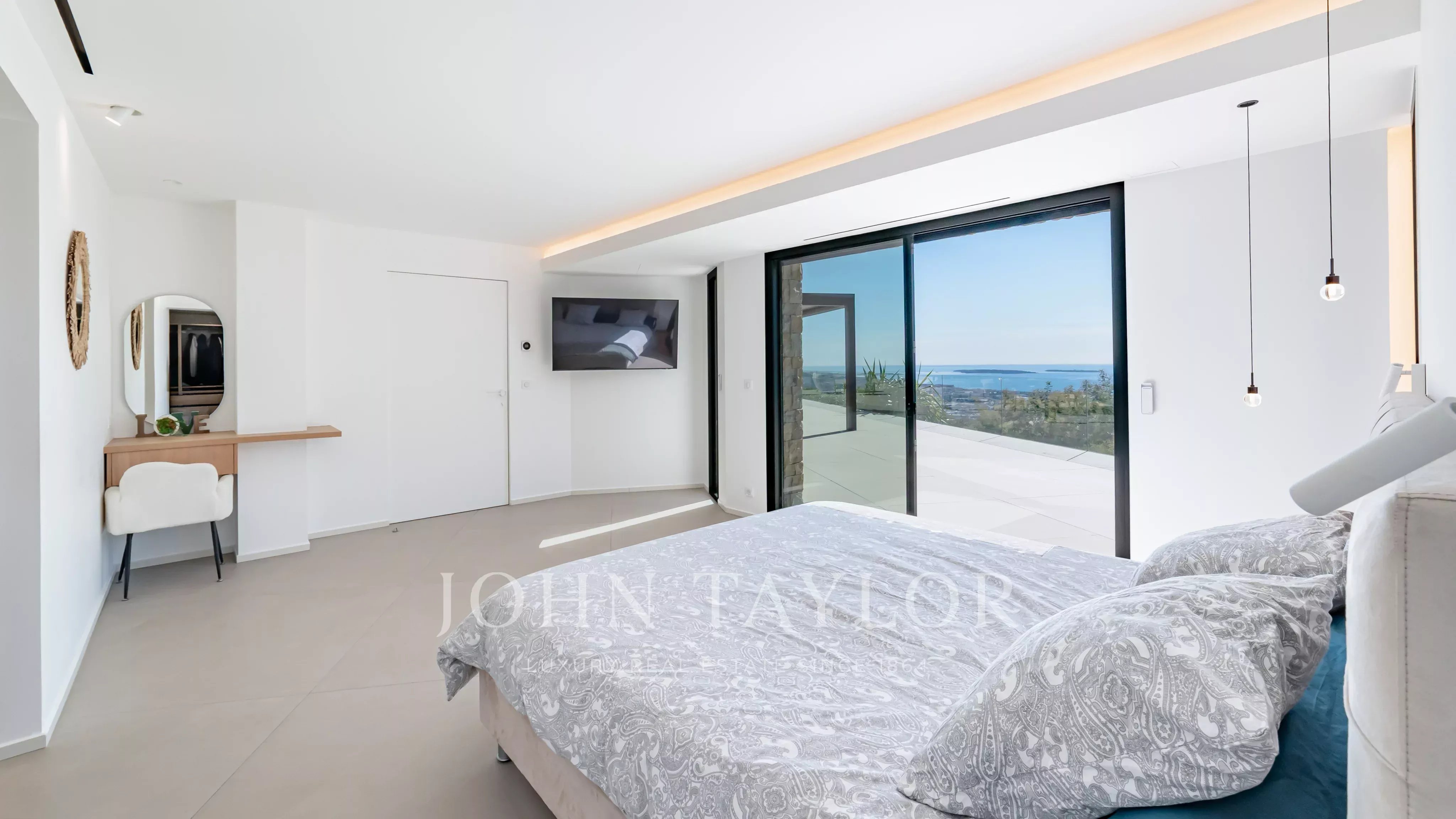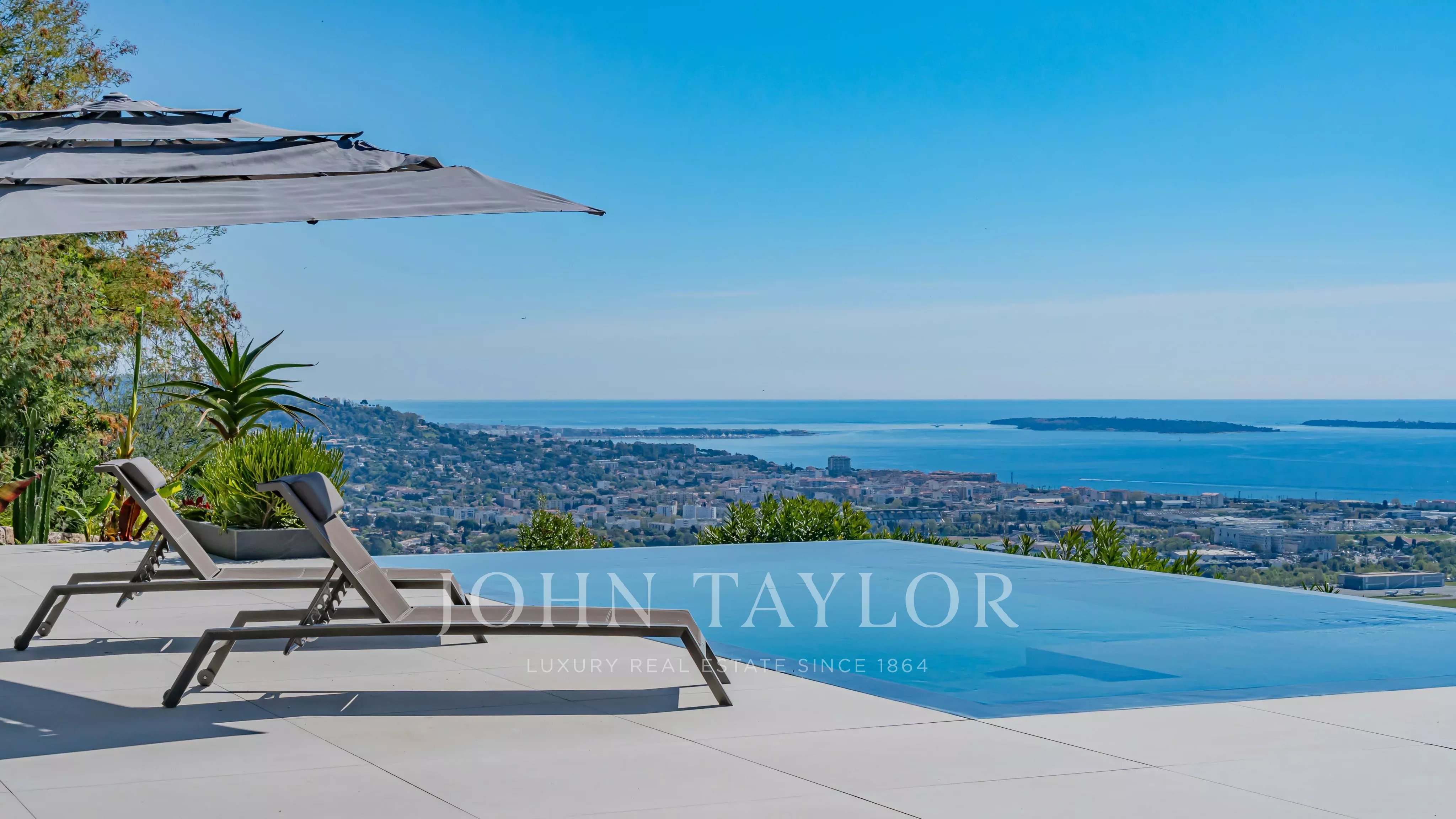 The villa enjoys spectacular sea views, very spacious terraces, and a heated tiled infinity pool.