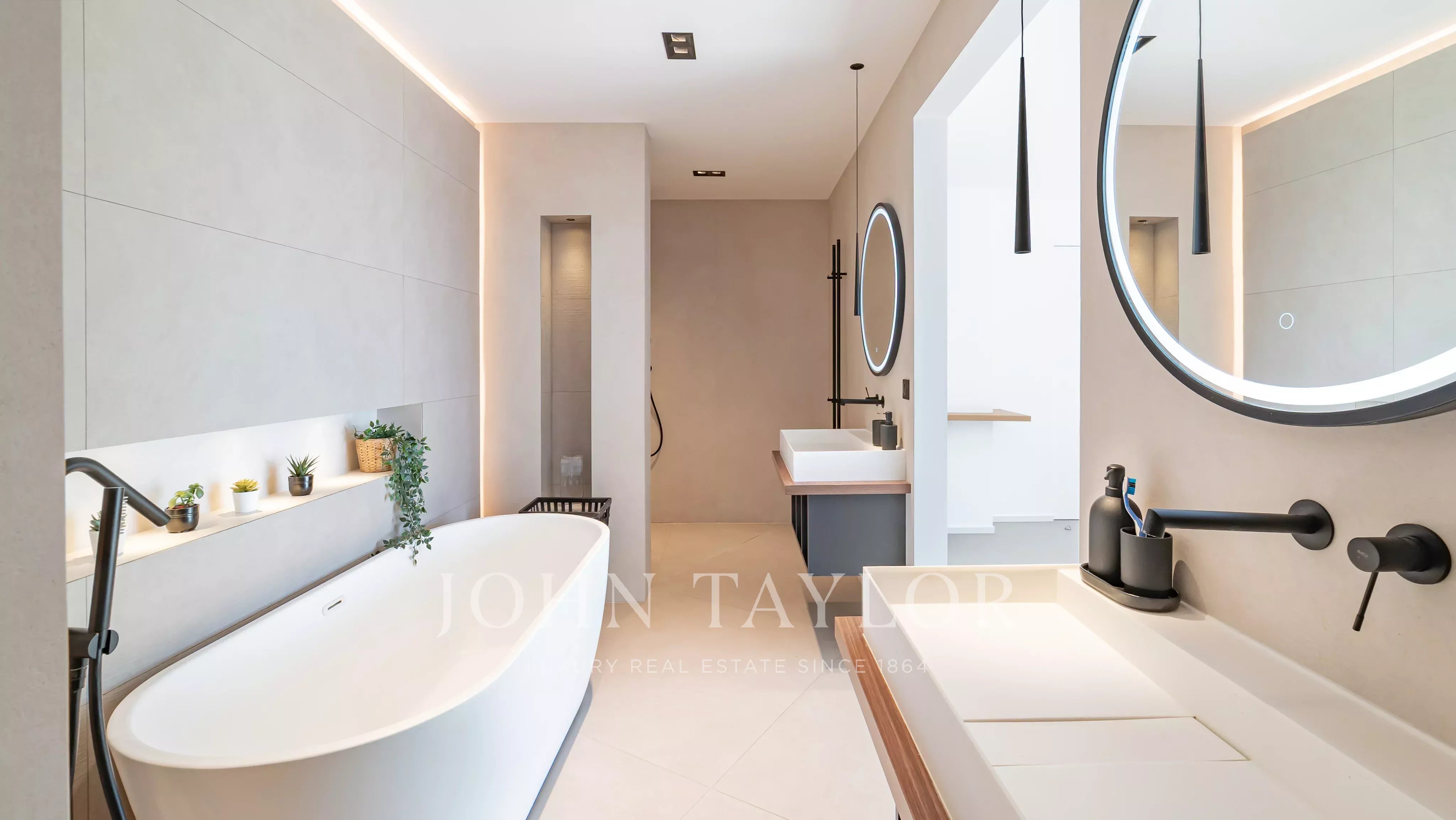 It comprises a large, bright living room with a wood-burning fireplace, a dining area, and a sleek fully equipped kitchen. All rooms benefit from sea views. The sleeping area includes three en-suite bedrooms, including a master suite with both bathtub and shower.