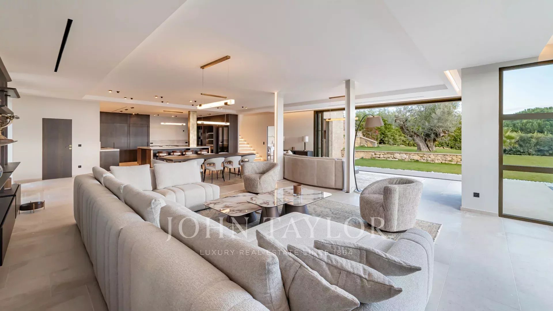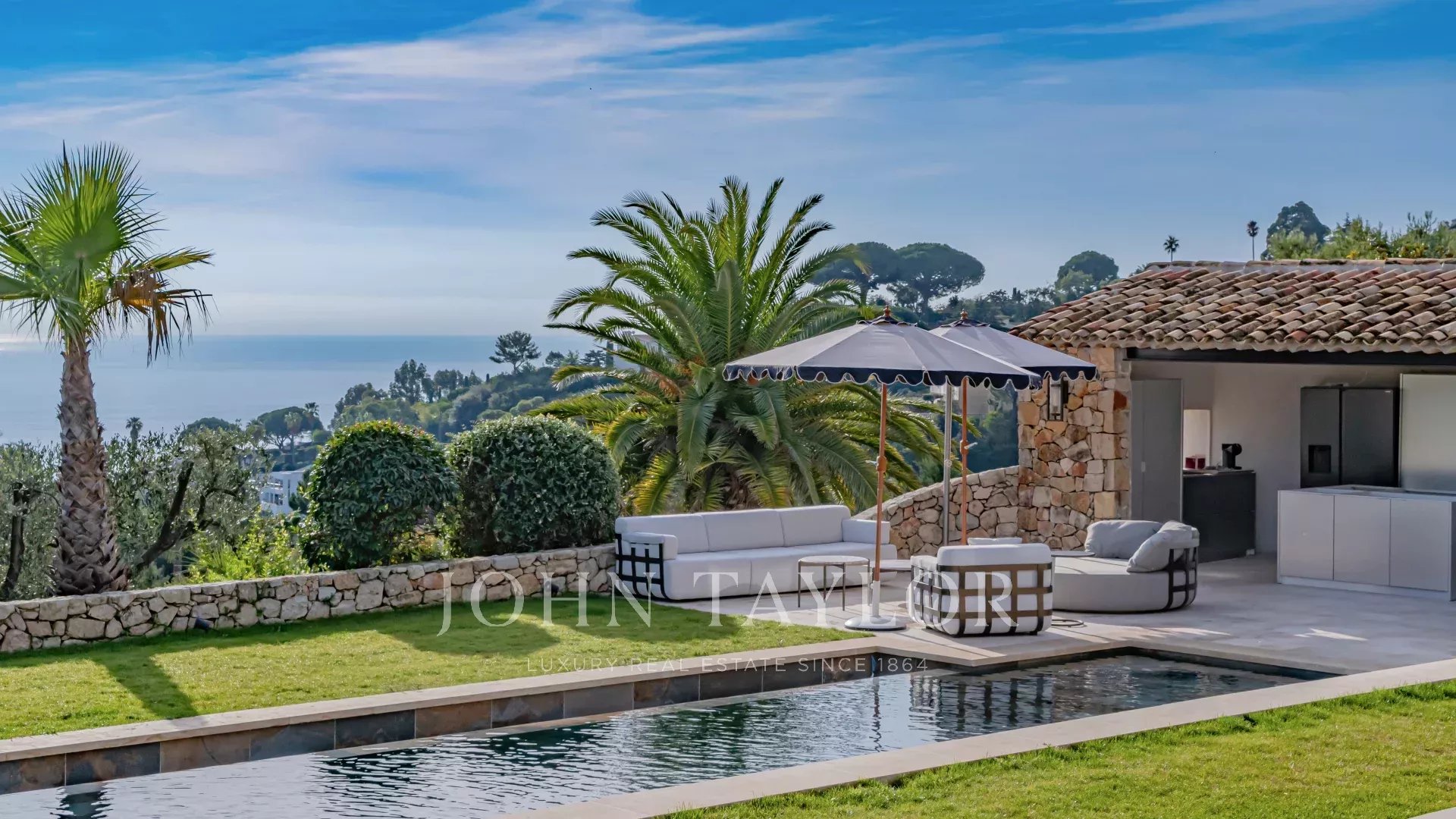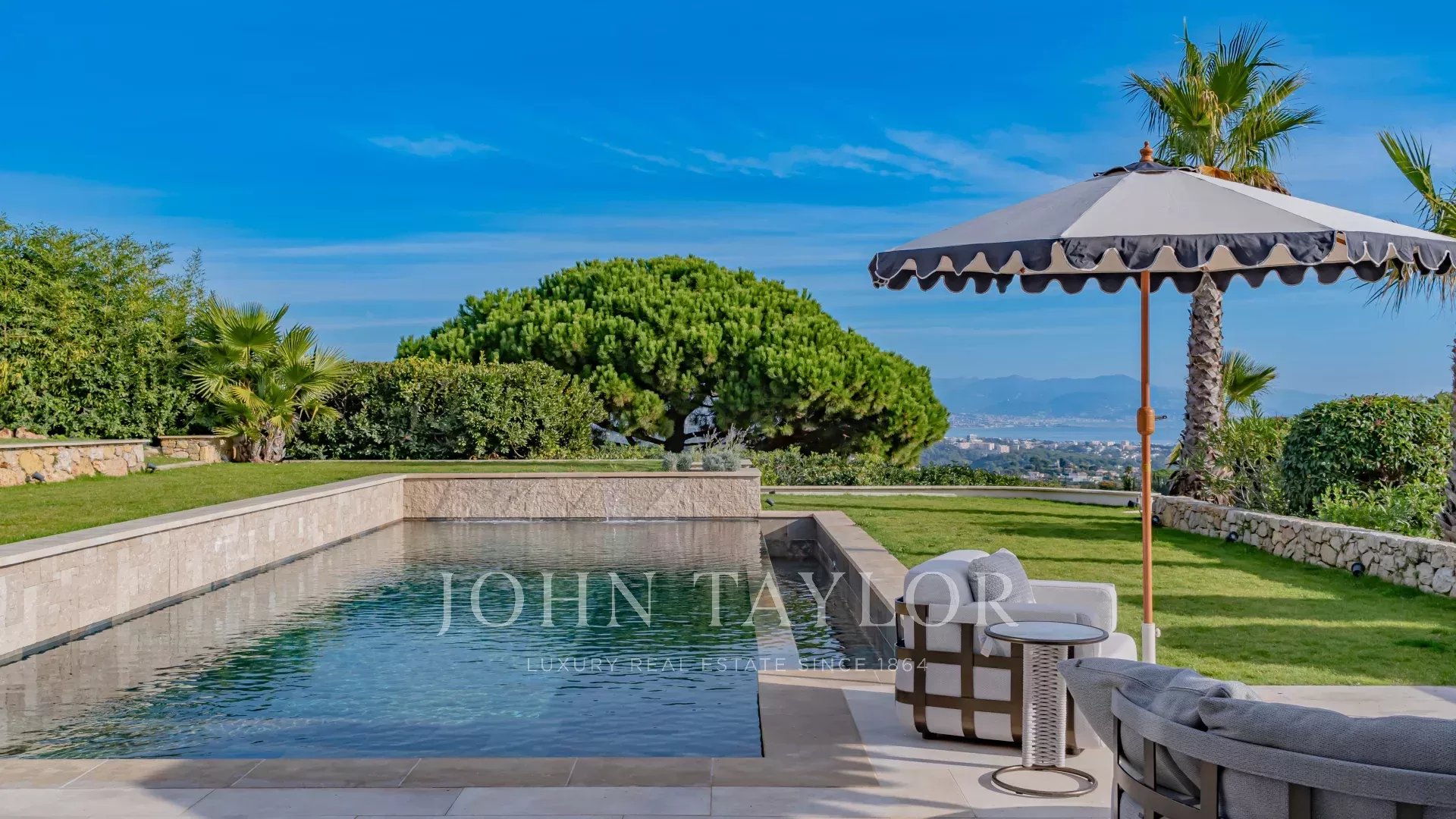 The villa is surrounded by a magnificent Mediterranean landscaped garden featuring an infinity pool, Jacuzzi and pool house.
